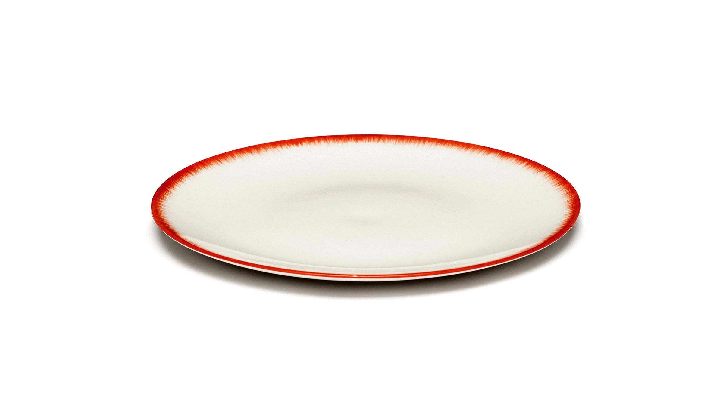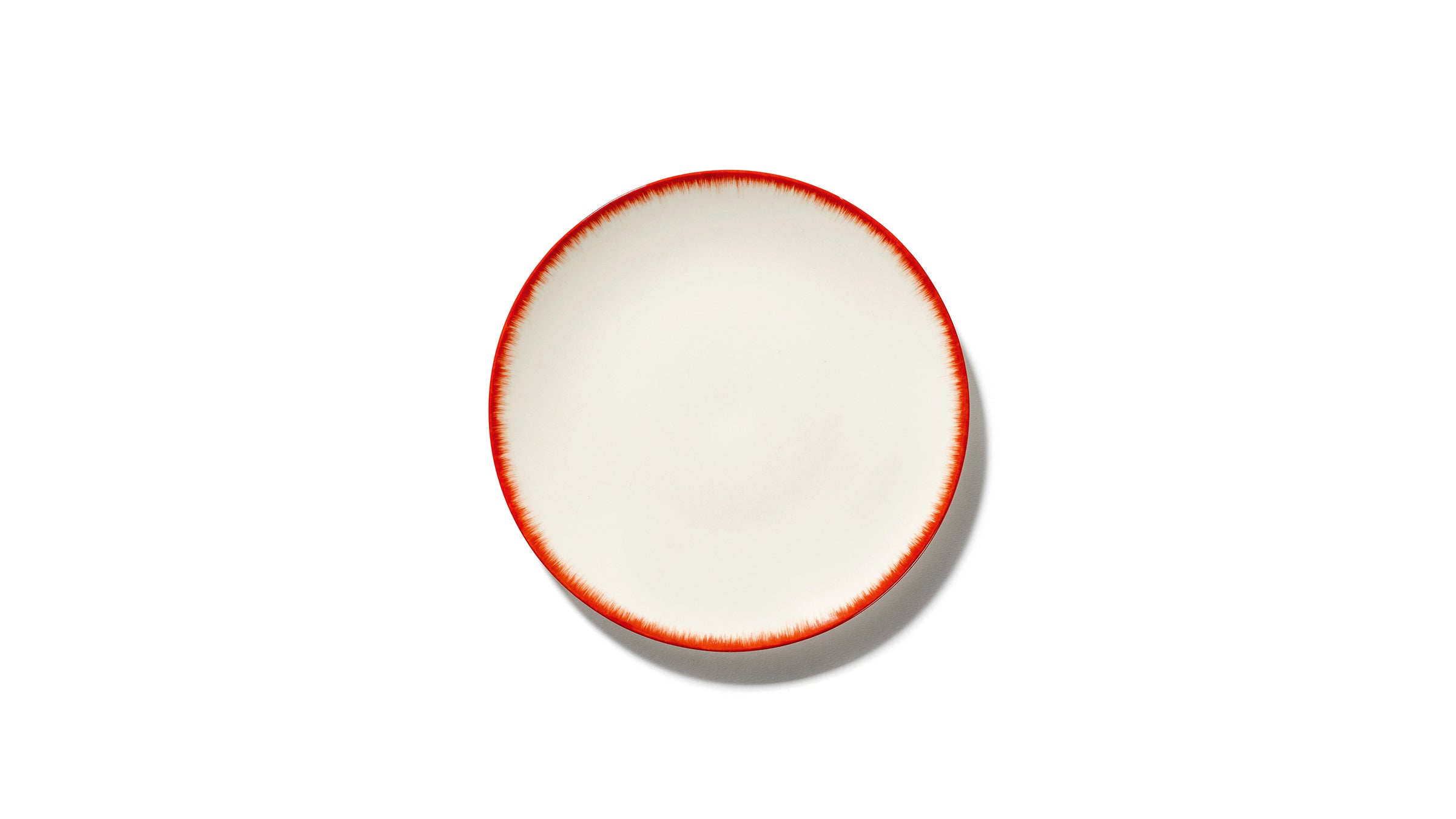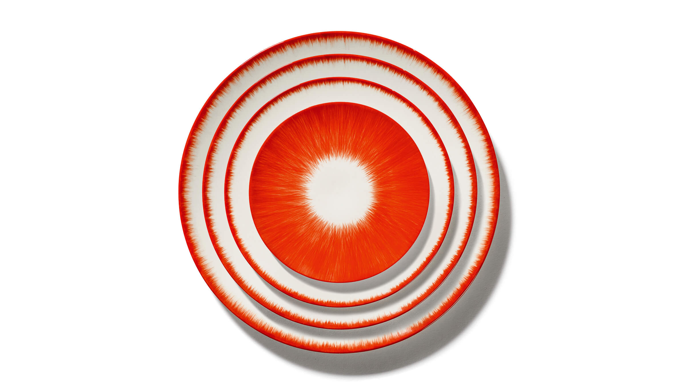 With Dé, the play of chiaroscuro, light, and shadow that is so characteristic of the style of Ann Demeulemeester is translated into tableware. The result is a collection of shadow paintings on porcelain. The edges of the fine plates feature a dégradé, painted by hand in several layers to create a meticulous interplay of lines. This craftsmanship makes each plate unique and enables a wide array of combinations. The arrangement of the different plates can be tailored according to the guest, the atmosphere and the dish. The play of light that occurs when the shadow effects of plates and cups touch each other is also extraordinary. Outside from the off-white and red variations, there are six different variations of black paintings available here. The plates come in four sizes and are also available in solid glossy black shown here.