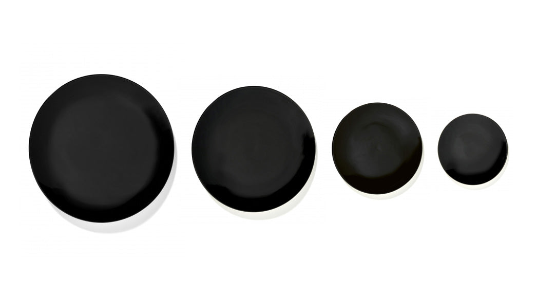 With Dé, the play of chiaroscuro, light, and shadow that is so characteristic of the style of Ann Demeulemeester is translated into tableware. The result is a collection of shadow paintings on porcelain. The edges of the fine plates feature a dégradé, painted by hand in several layers to create a meticulous interplay of lines. This craftsmanship makes each plate unique and enables a wide array of combinations. The arrangement of the different plates can be tailored according to the guest, the atmosphere and the dish. The play of light that occurs when the shadow effects of plates and cups touch each other is also extraordinary. Outside from the glossy black version, there are six different variations of black paintings available here. The plates come in four sizes and are also available in off-white and red shown here.