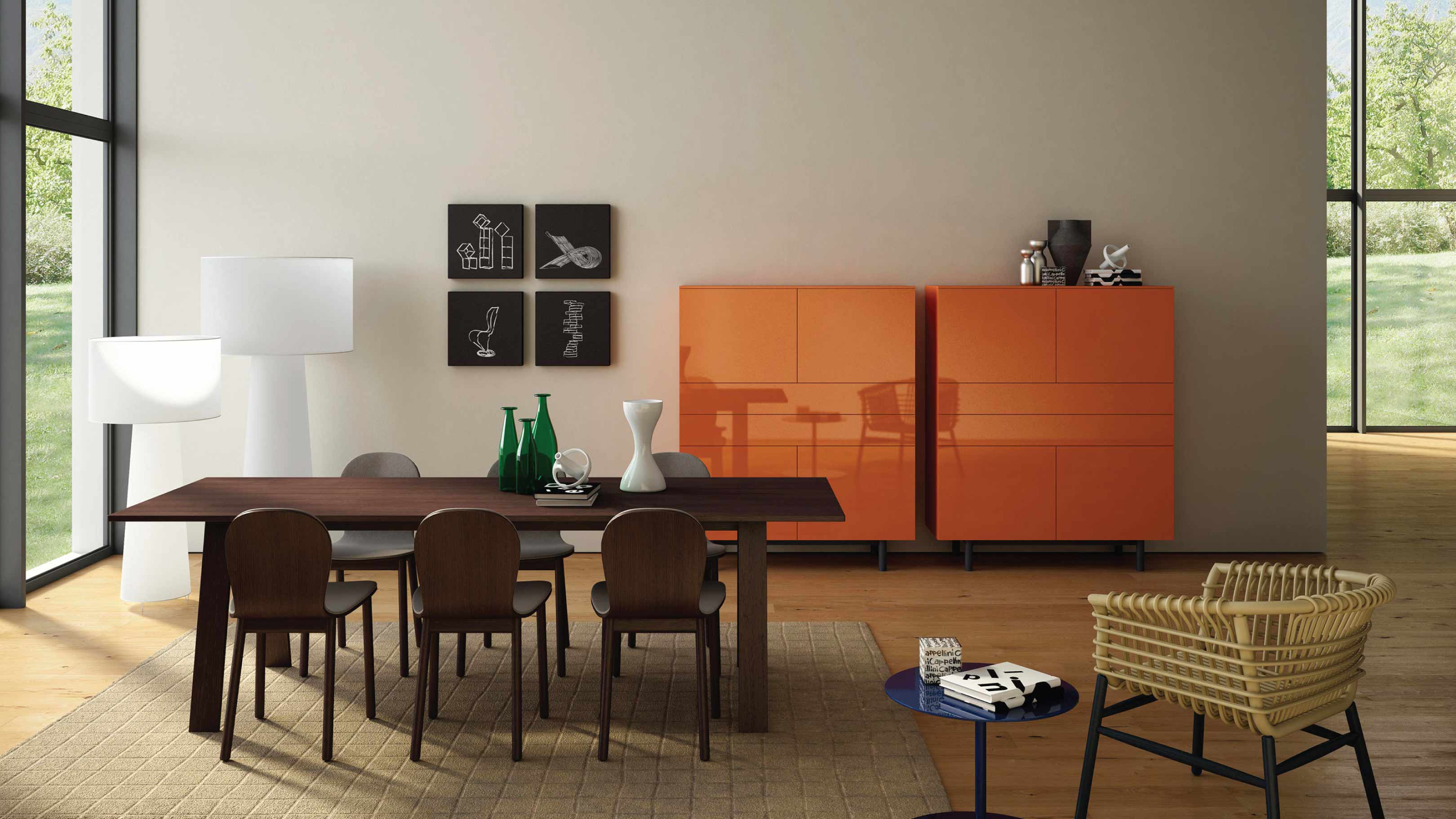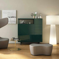 Studio Cappellini's Easy collection is a range of modular elevated cabinets designed for living spaces. These units feature doors, drawers, or open compartments, which exude a remarkable visual delicacy, allowing them to blend seamlessly with various stylistic elements.