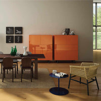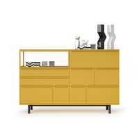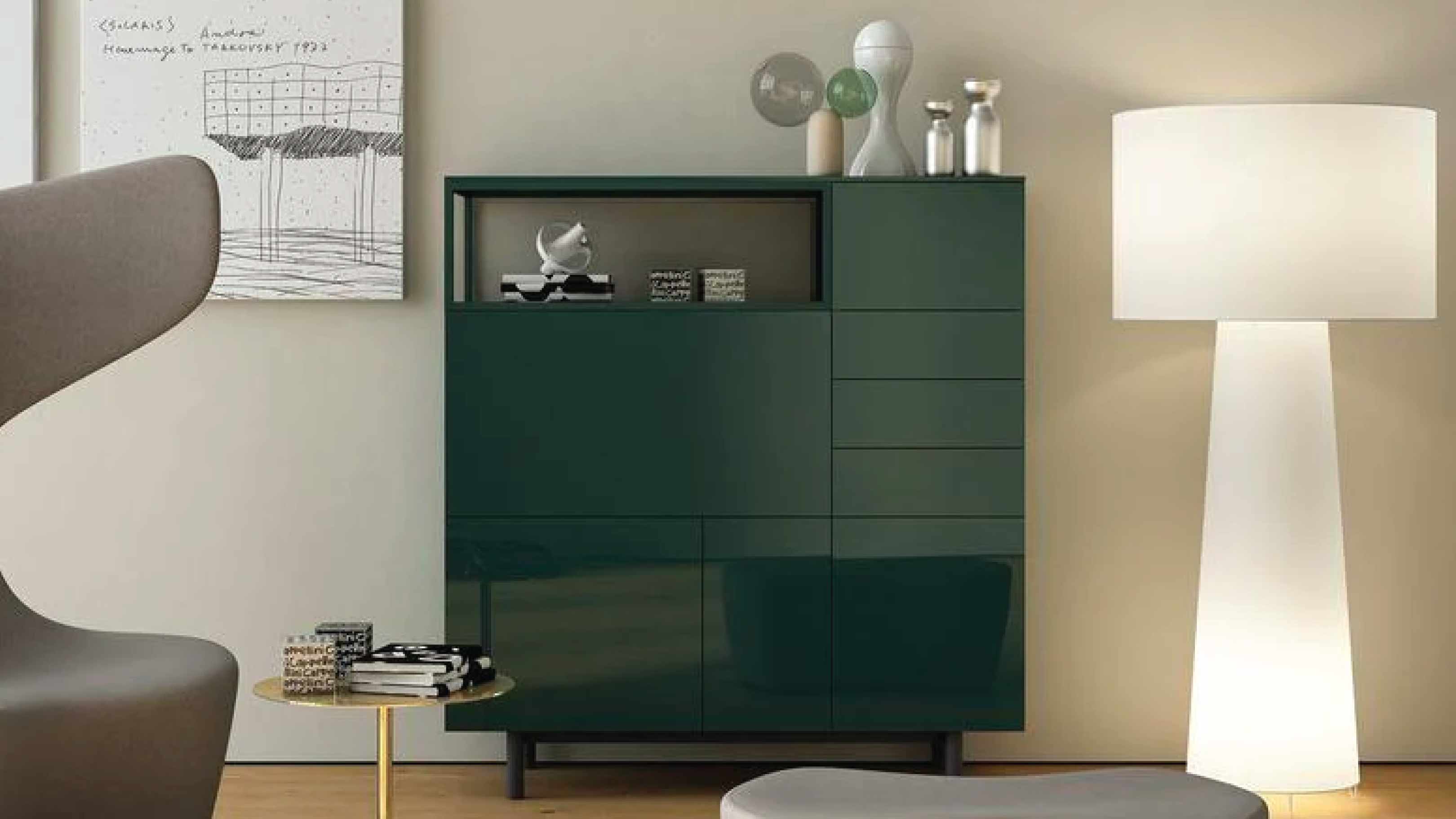 Easy cabinets are customizable by combining matte or glossy lacquered finishes with wood. The tops come in lacquered, wood, or marble finishes, offering multiple options to suit different preferences.