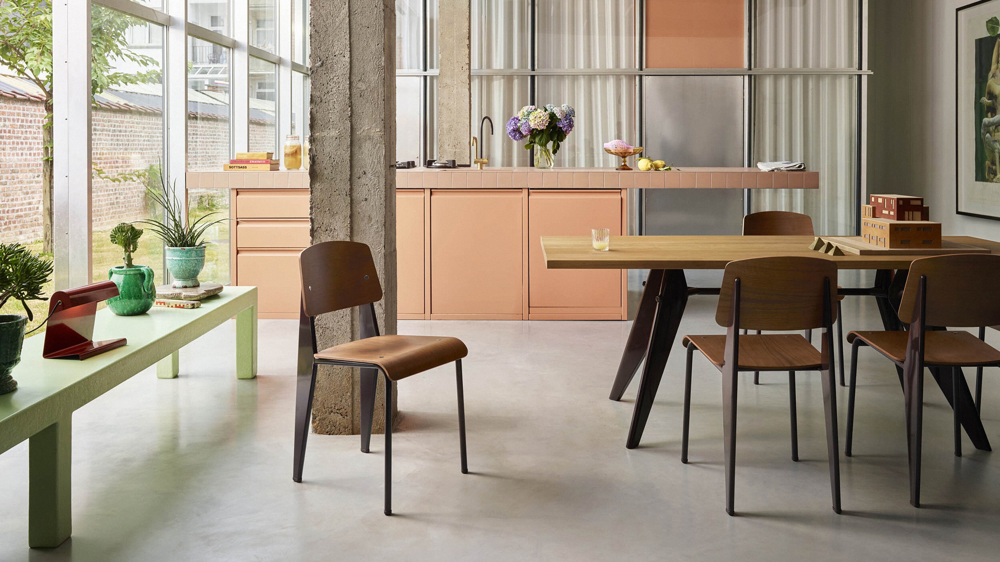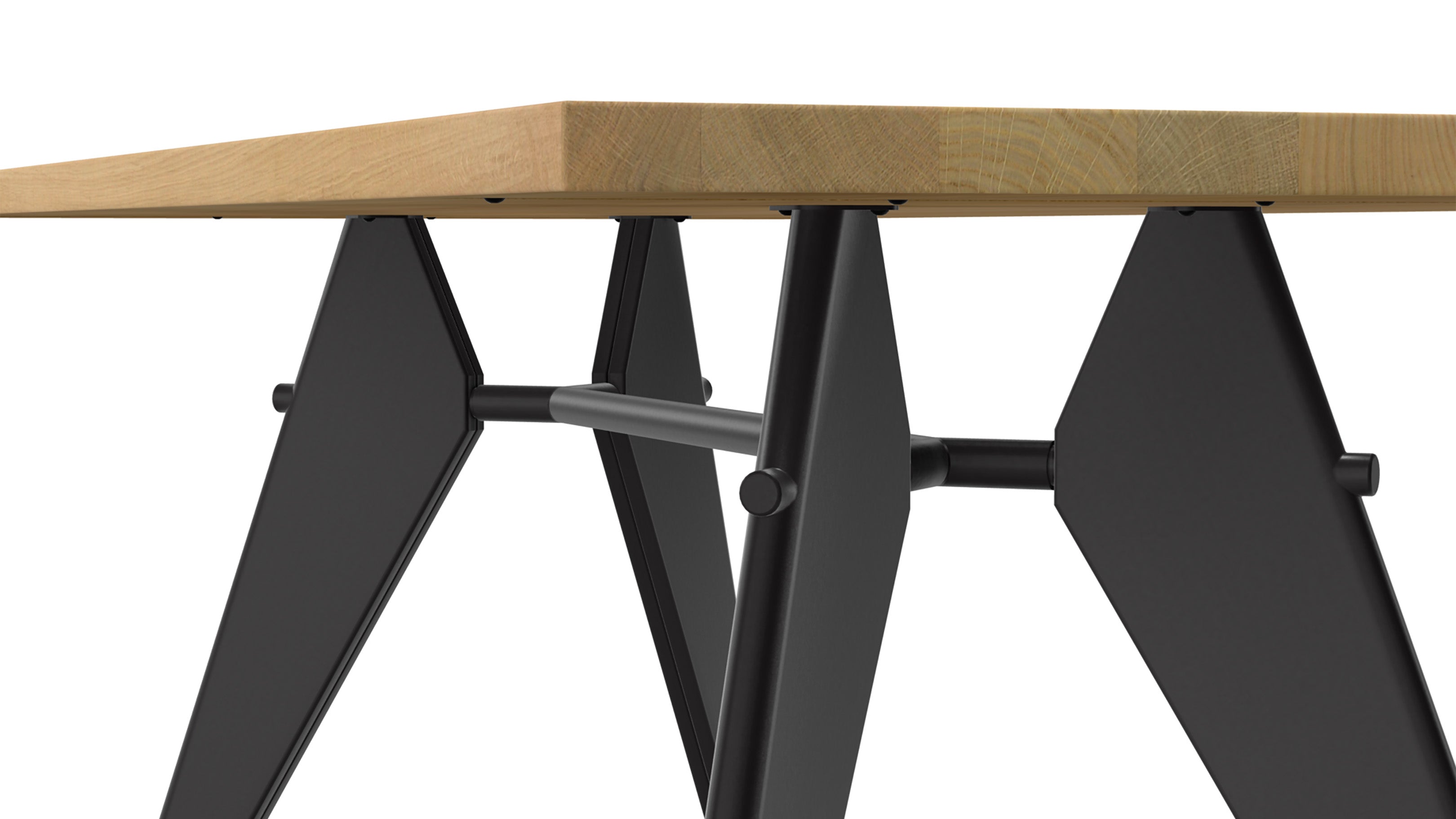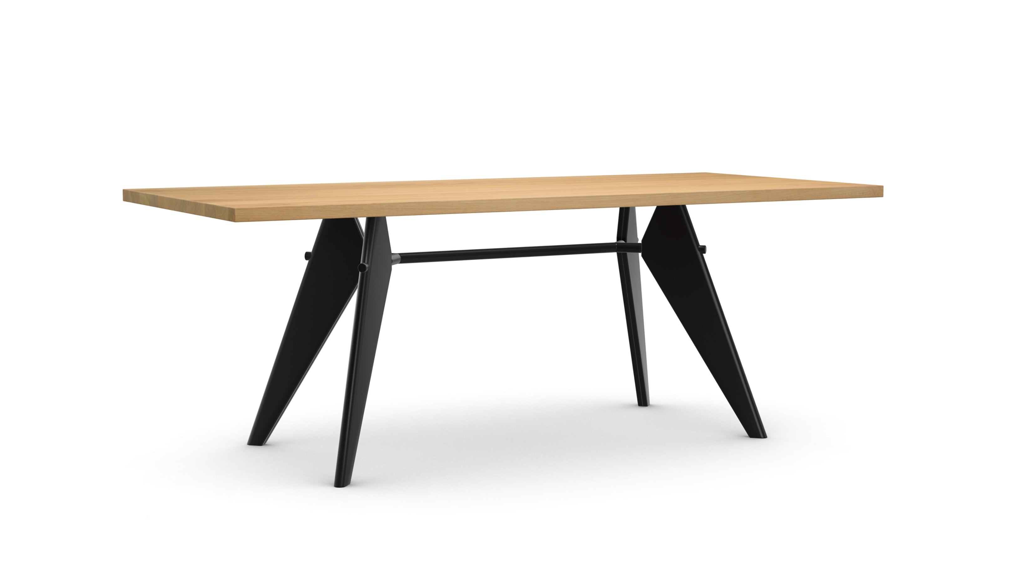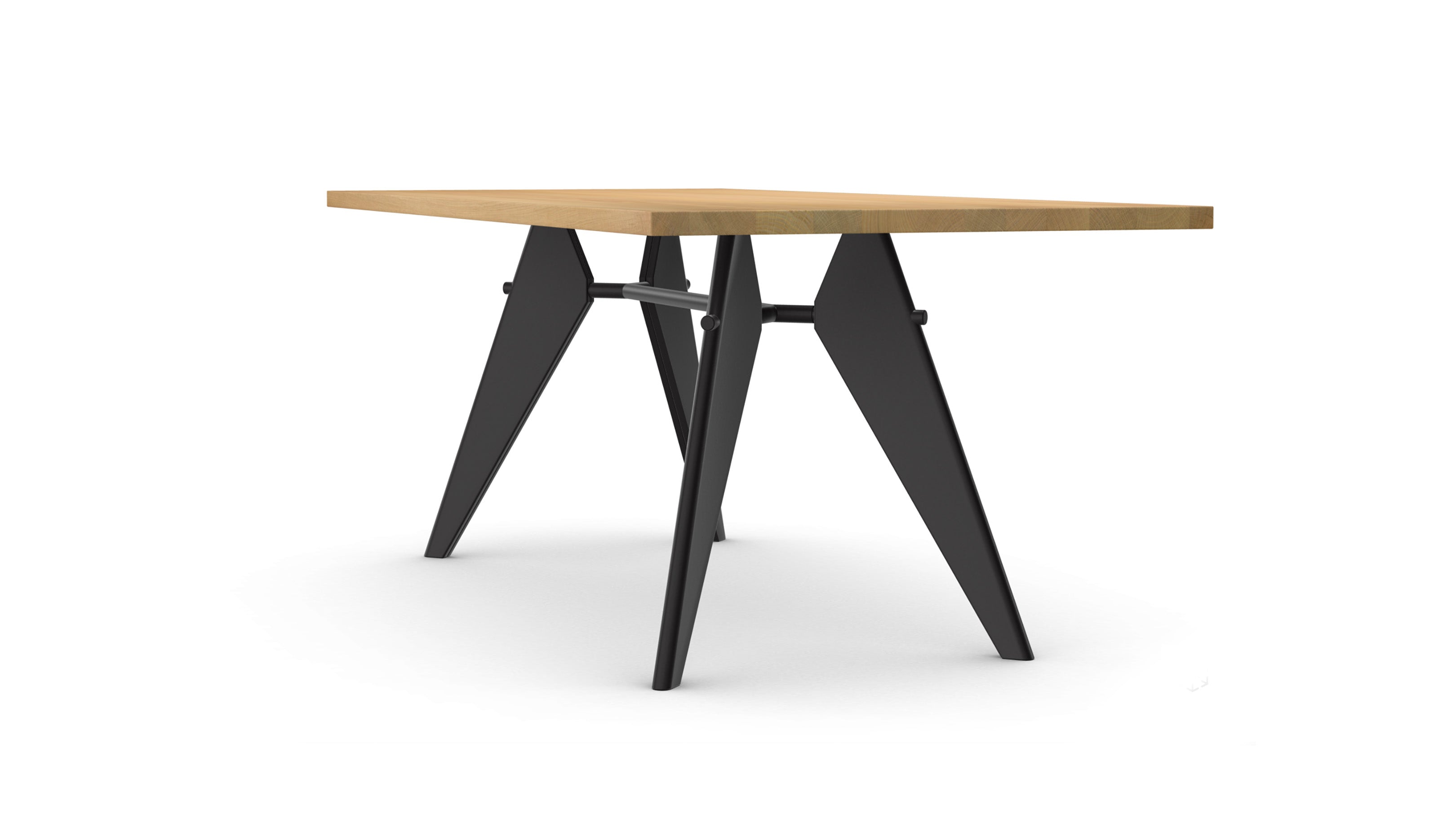 The EM Table, designed by Jean Prouvé in the 1950s for the Maison Tropicale project, exemplifies his industrial design philosophy, focusing on structural integrity and functionality. The table features a robust steel base with a distinctive crossbar that illustrates the flow of forces, creating both strength and aesthetic appeal. The EM Table offers versatility for modern and industrial interiors alike. Its powder-coated steel base comes in finishes such as Deep Black and Prouvé Blanc (Ecru), making it a timeless and iconic piece that enhances any dining room or workspace.