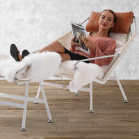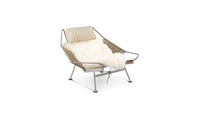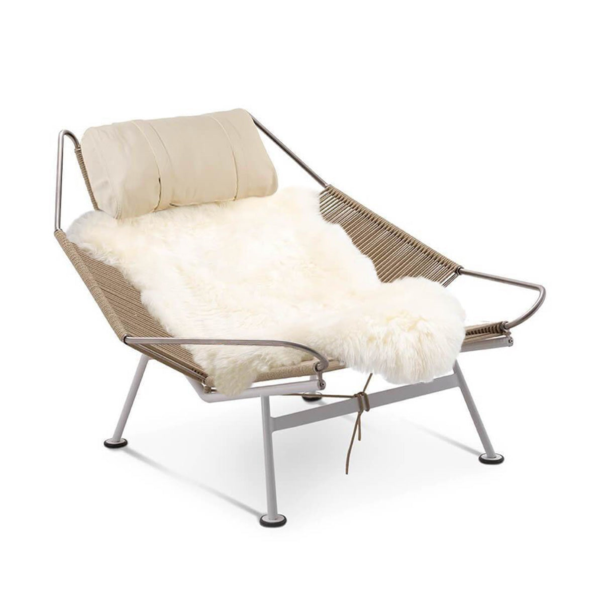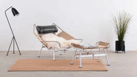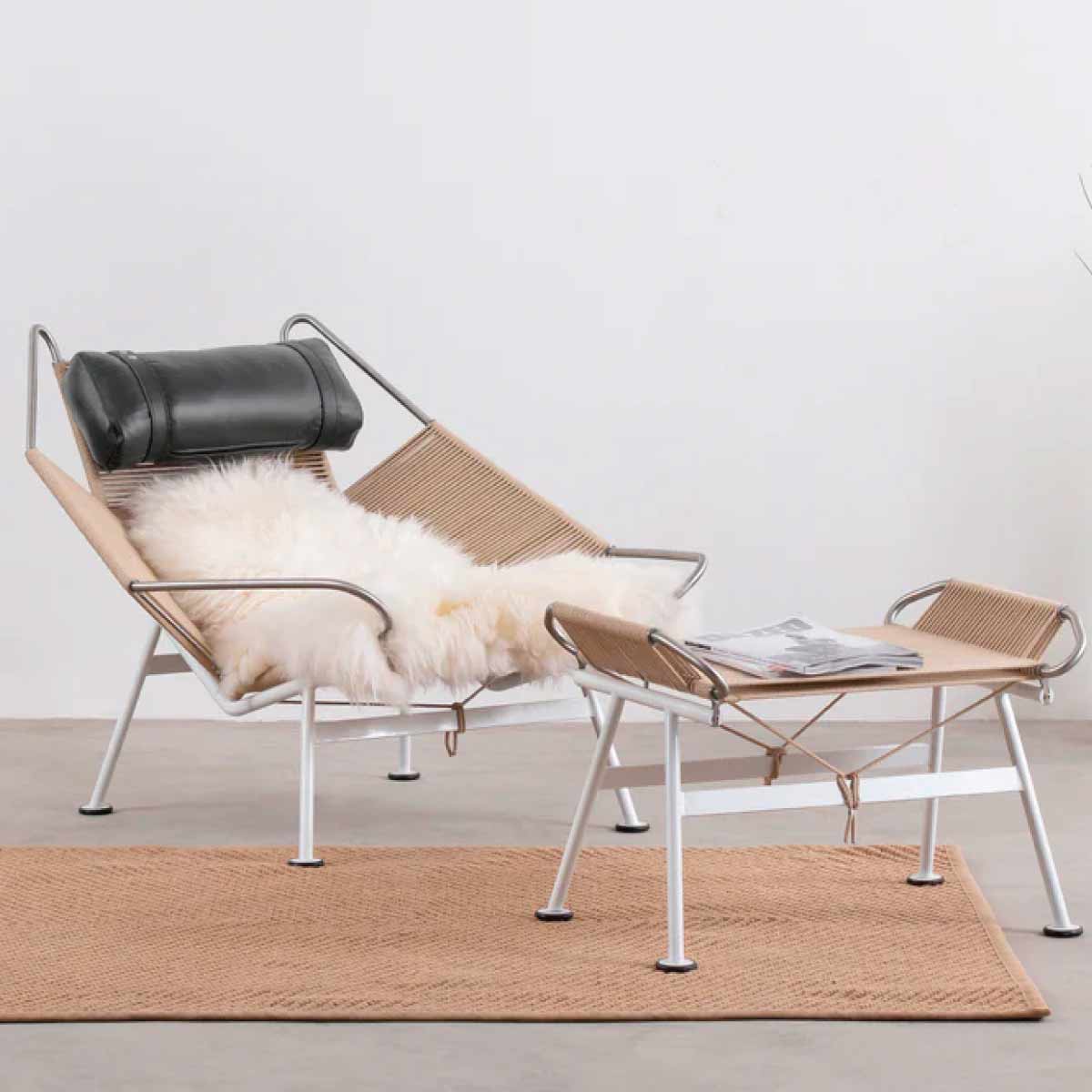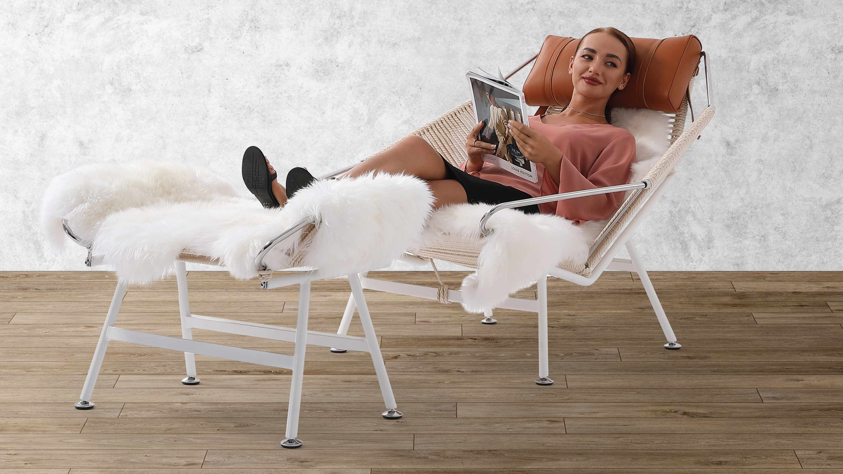 This modern industrial beauty is a perfect balance of form and function. Built with a sturdy stainless steel frame and featuring 240 meters of textured flag line, this chair upholds the iconic style of the original Danish design. As envisioned by the legendary Hans Wegner, the wide-set and low frame of this chair is perfectly suited for an afternoon rest, evoking memories of lazy days at the beach. For added comfort, the chair can be paired with a cozy sheepskin throw and a soft, down feather filled headrest. With its sleek lines and unparalleled comfort, this chair is the epitome of Danish design, a true masterpiece that seamlessly combines form and function.