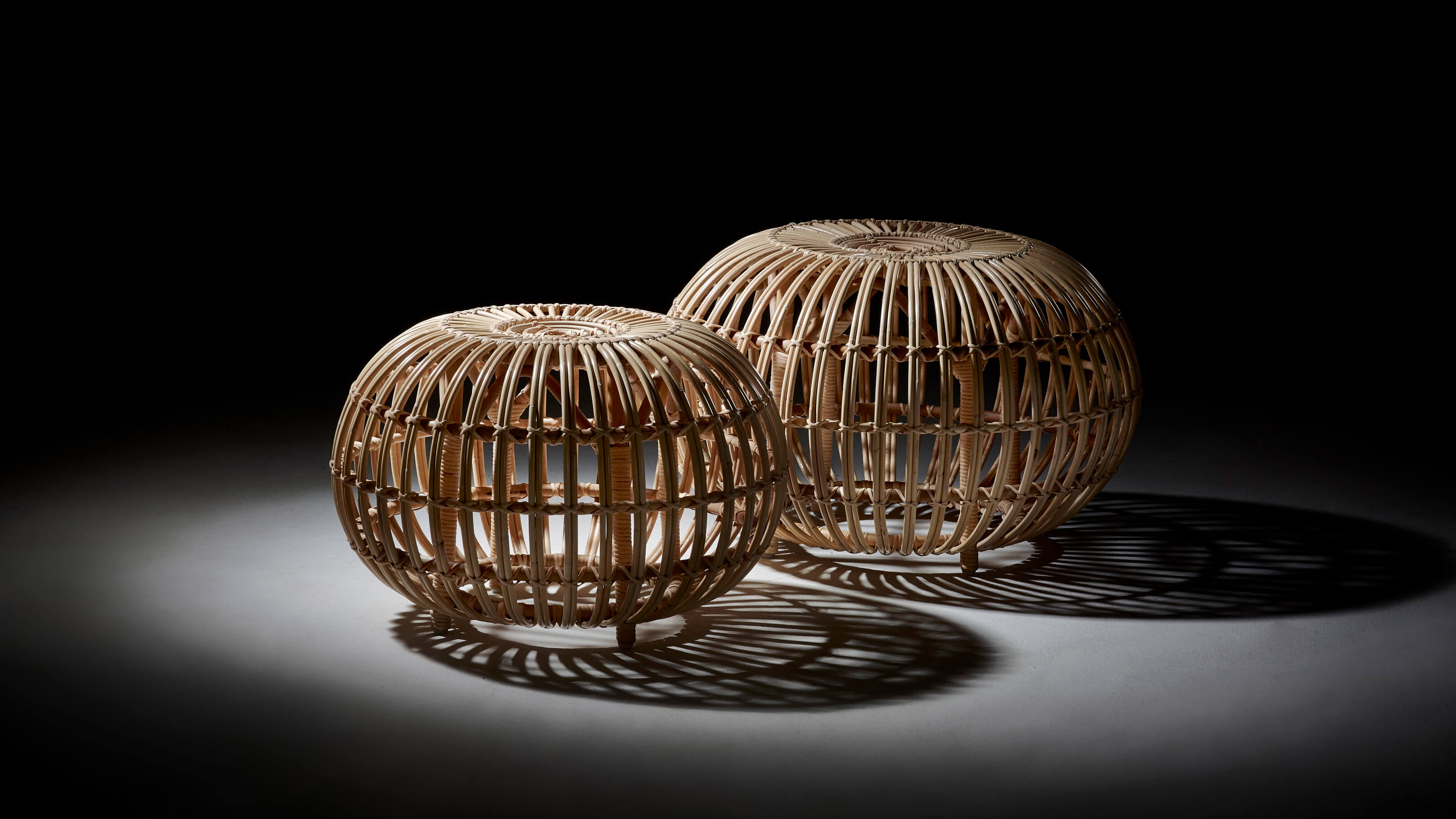 The Franco Albini Ottoman is a multi-purpose piece made of ecologically sustainable rattan, the thin pliable stems of palms. An elegant and artistic piece of fine craftsmanship, the Ottoman is distinguished by its spherical shape and linear nest-like design. With a natural skin color, the Franco Albini Ottoman blends harmoniously into any indoor environment.