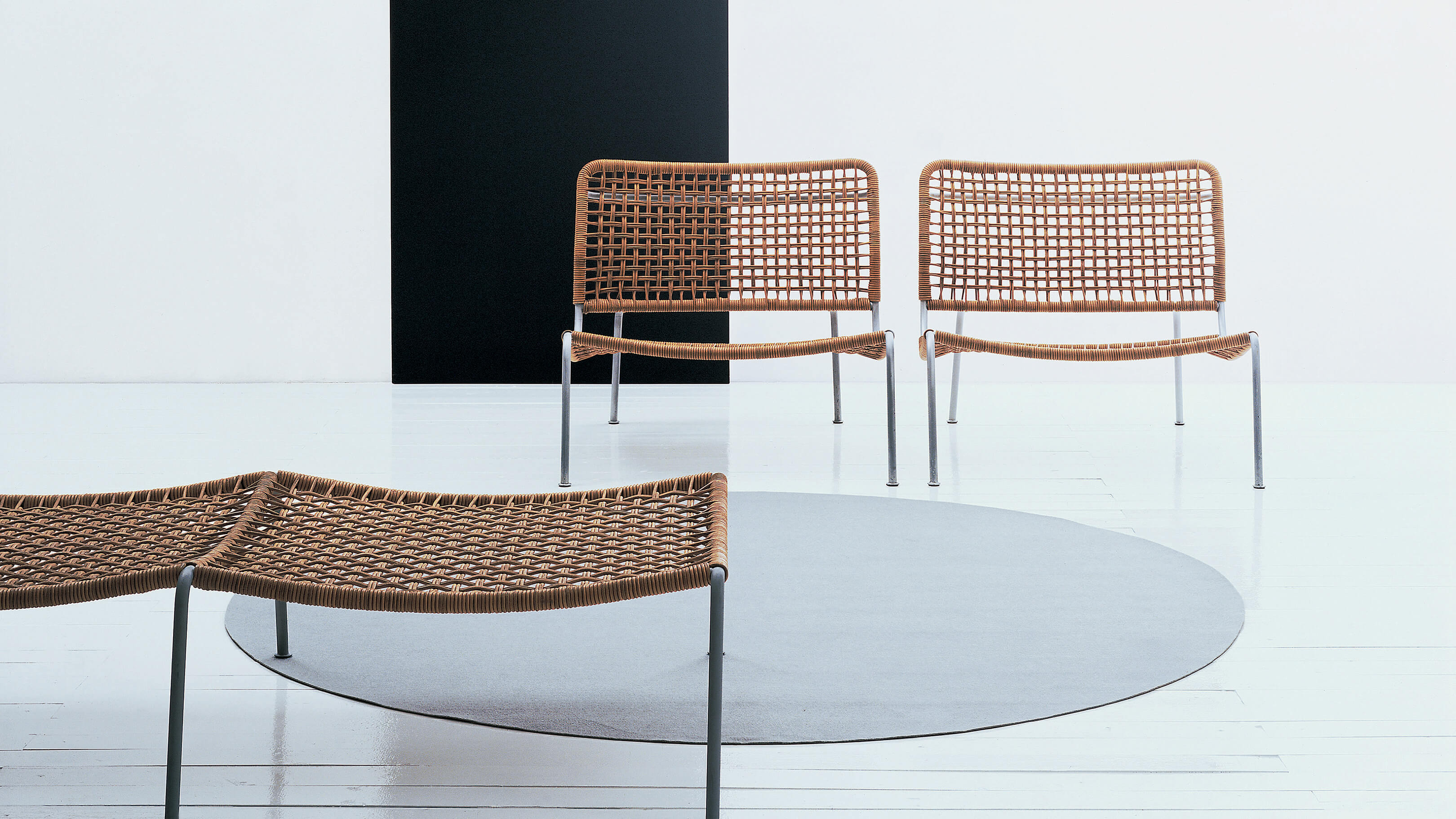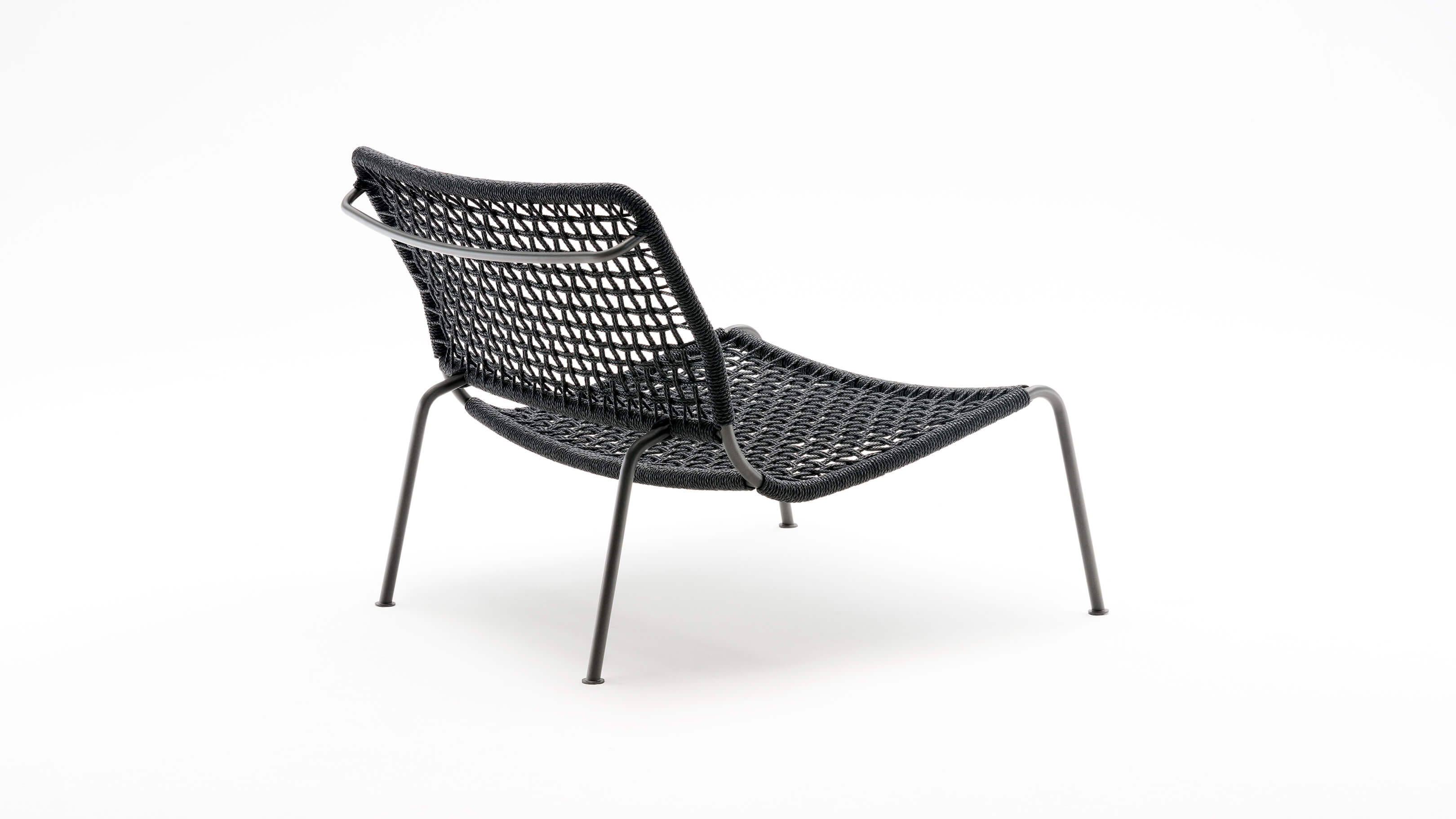 The Frog chair, low to the ground with wide legs to support its generous seat and slightly reclined back, offers an inviting place to relax. The seat and back are made of interwoven leather rope, cotton or PVC straps (transparent or colored) or upholstered in leather for a more sophisticated look.