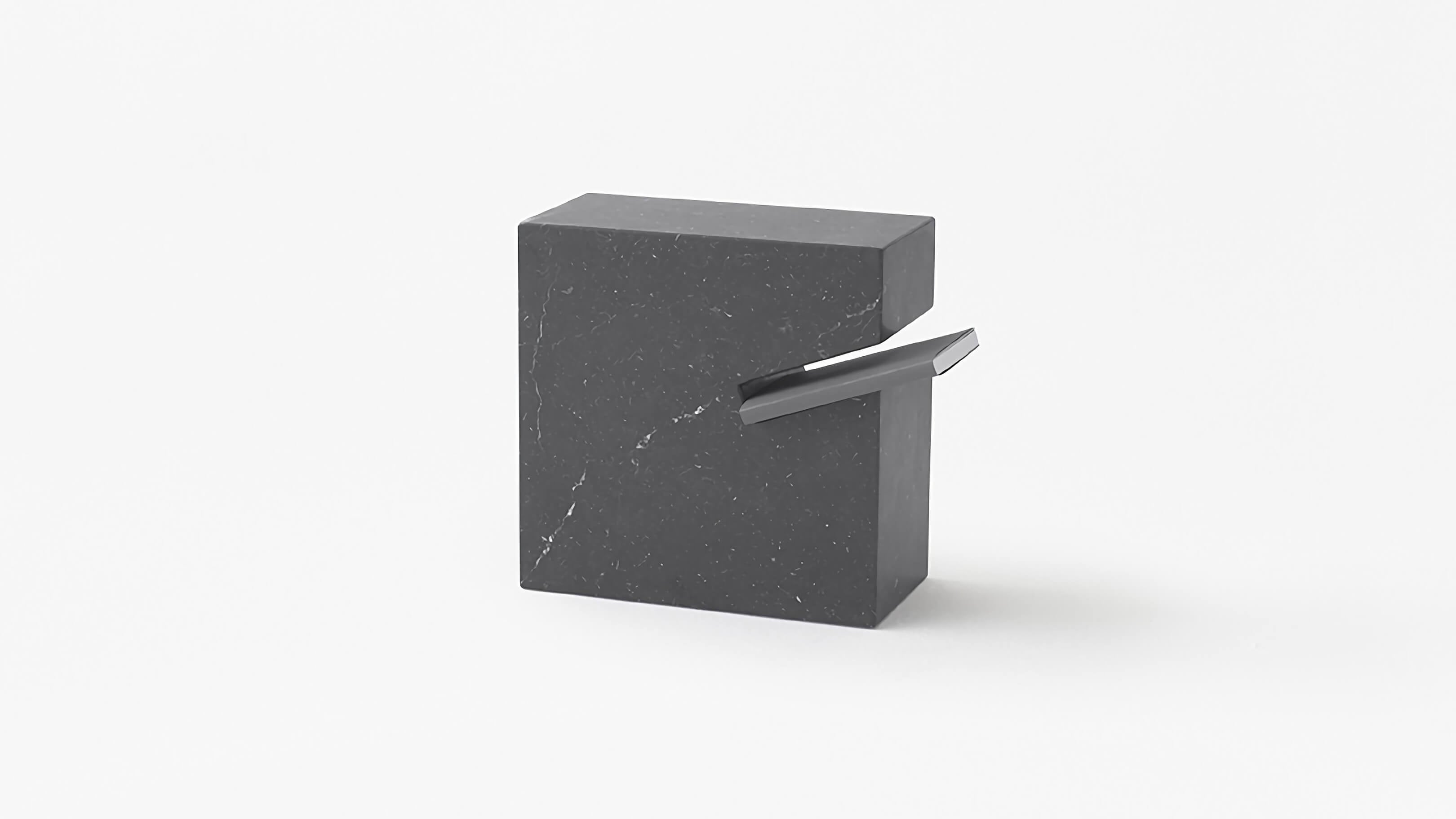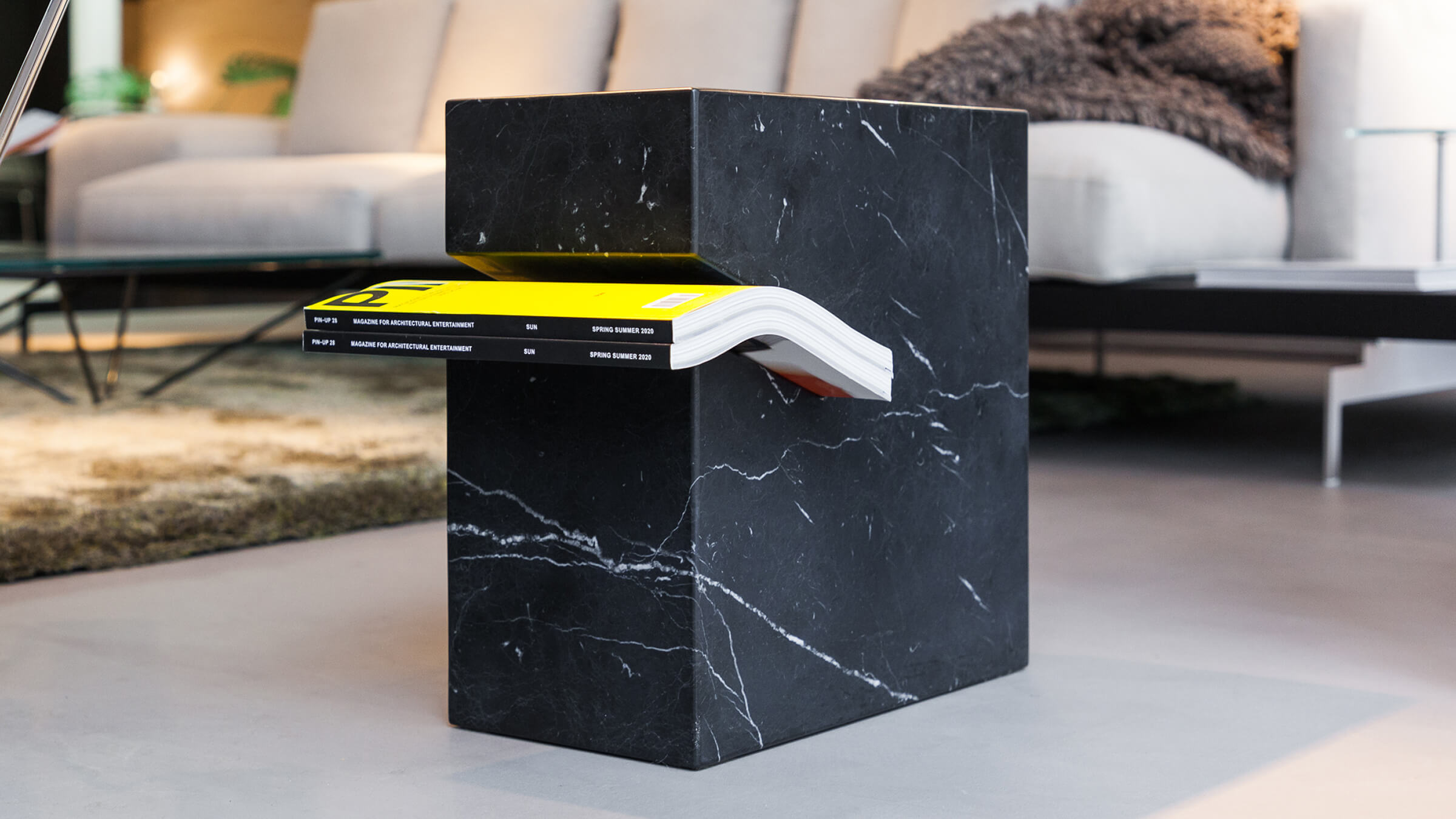 Inspired by the traditional manufacturing techniques for marble furniture, renowned Japanese design studio Nendo has envisioned the Gap Side Table as a statuesque marble block. Featuring precise and harmonious proportions, the form of the table is a direct reference to the way marble manufacturing begins: by cutting marble slabs from a larger block. In typical fashion of the designer, there is a subtle twist within the object giving it a unique appearance. The rectilinear form of the table has been cut with a notch that becomes a functional place to insert books and magazines. This opening creates a unique form that adds intrigue to the side table. The design is intentionally compact yet stabilized by its hefty weight and the narrow top is a perfect place to effortlessly rest a coffee mug or a pair of eye-glasses. Additionally, as there is no unfinished side, the table may be placed in any way. The Gap Side Table is available in white Carrara or black Marquinia versions.