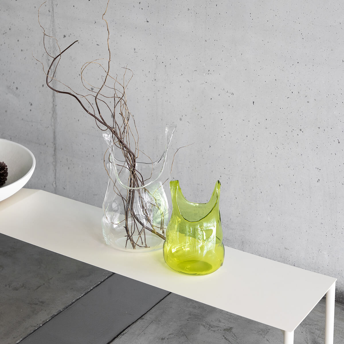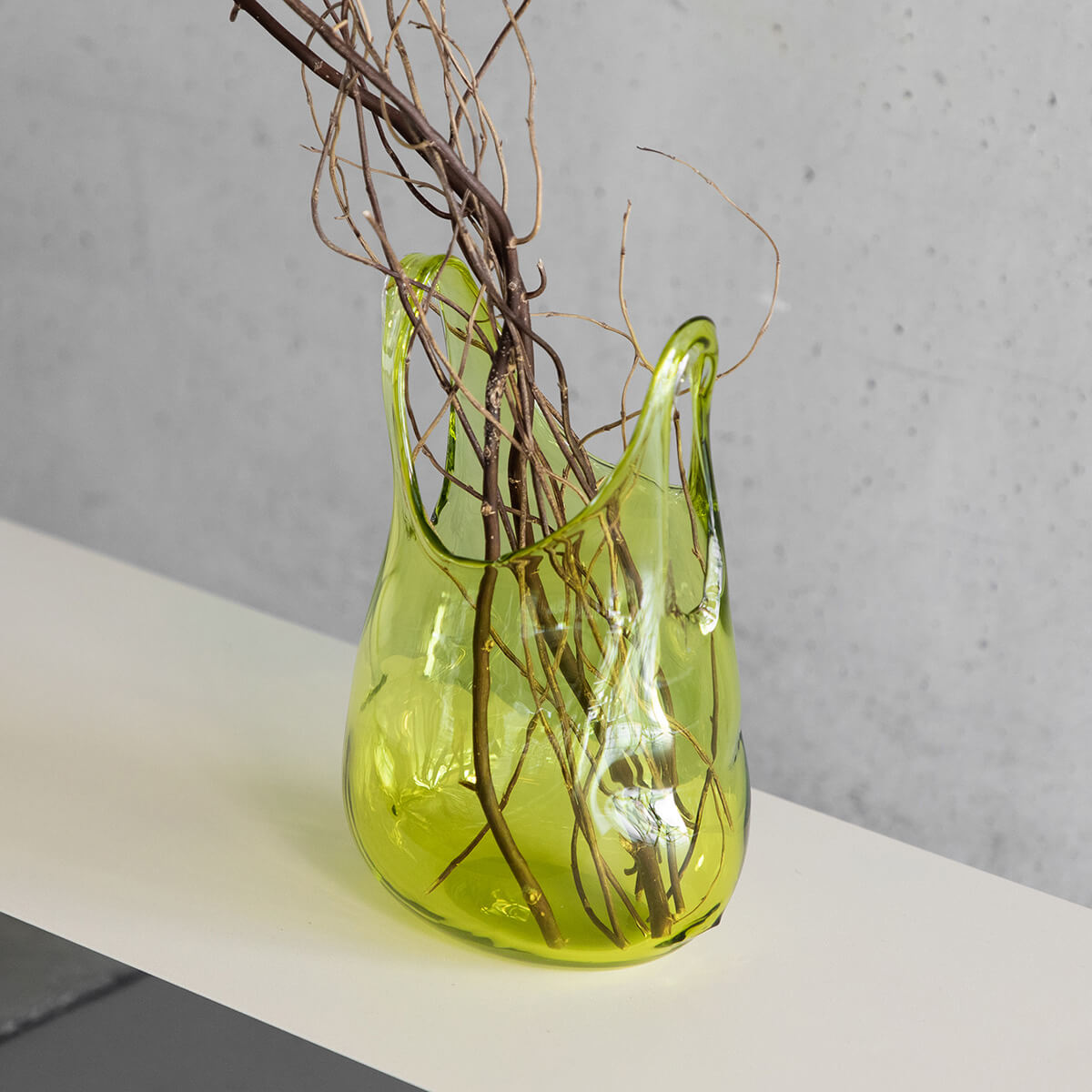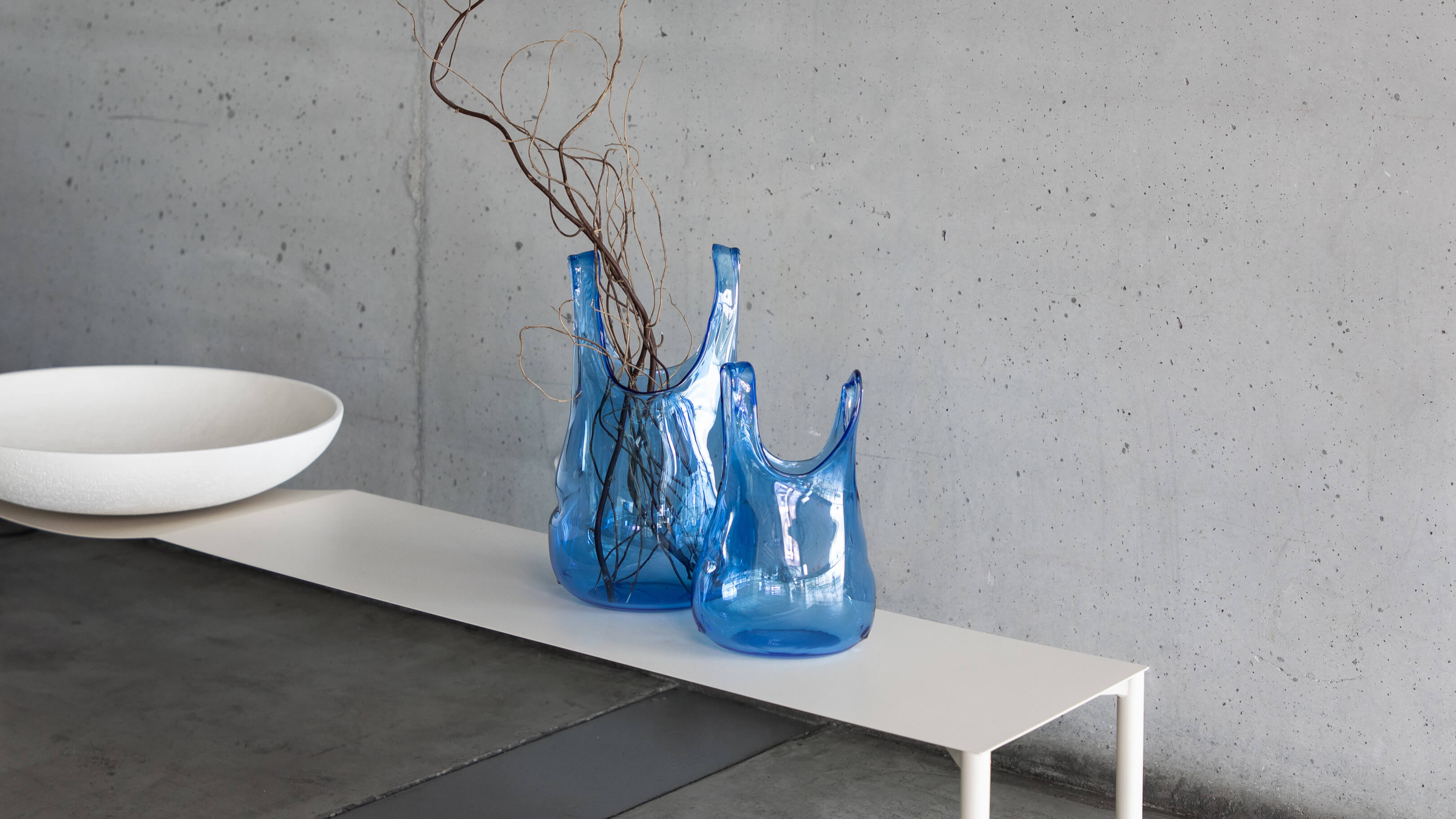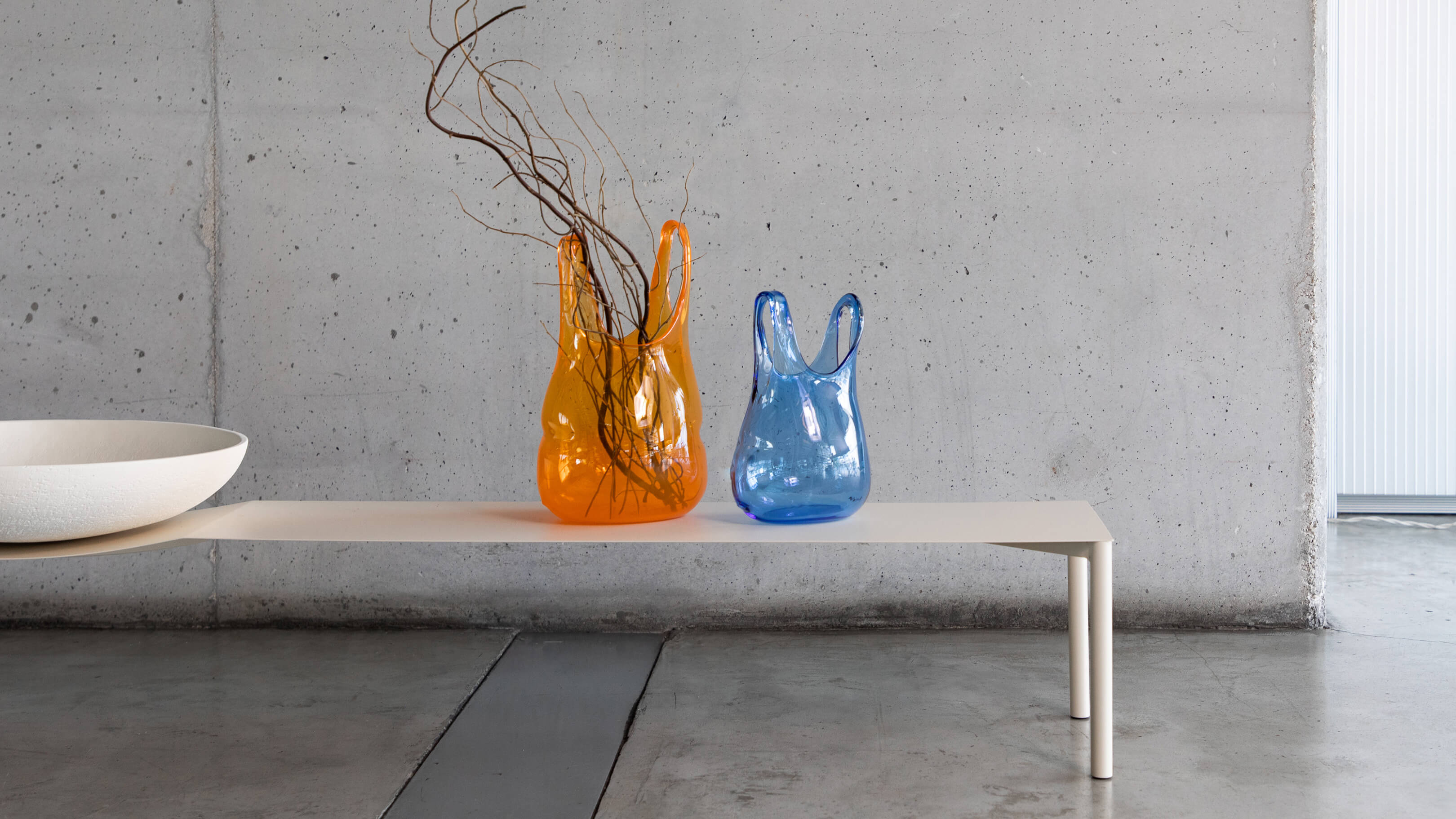 The internationally recognized design choreographs a story of glassmaking and confinement in intimate space, mesmerizing users with its grace and supple form. Available in five colors and two sizes, measurements vary slightly as each piece is made by hand, making every Glass Bag its own unique sculpture.