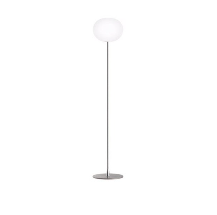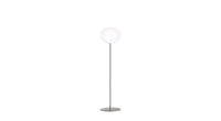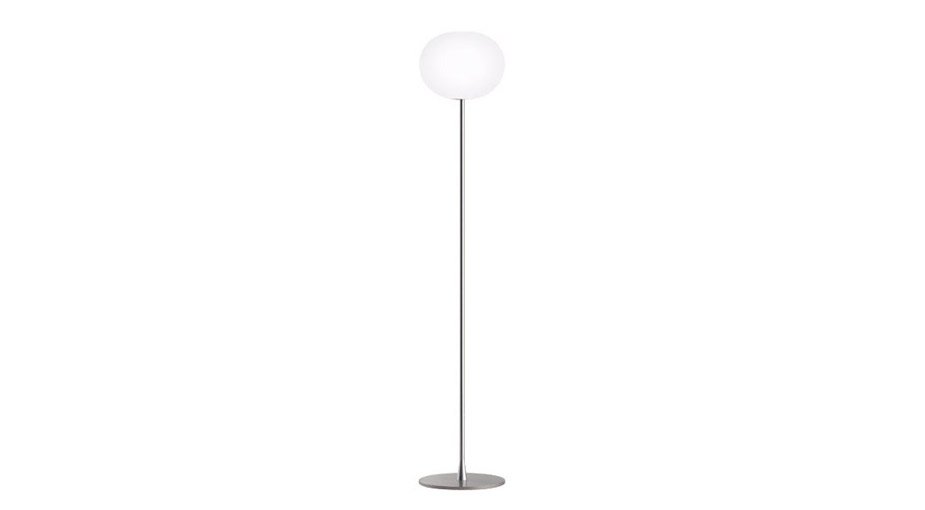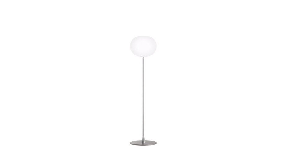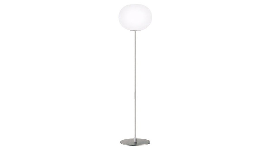 The Flos Glo-Ball floor lamp has a slender stem which provides a stable foundation for the hand-blown, acid-etched Opaline glass sphere