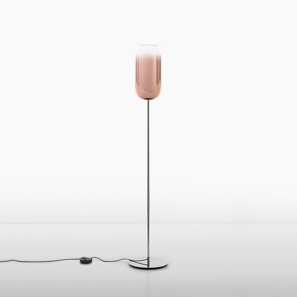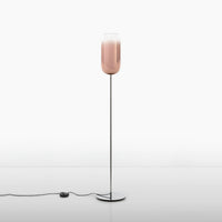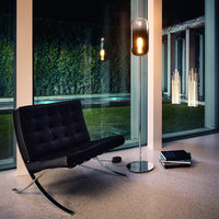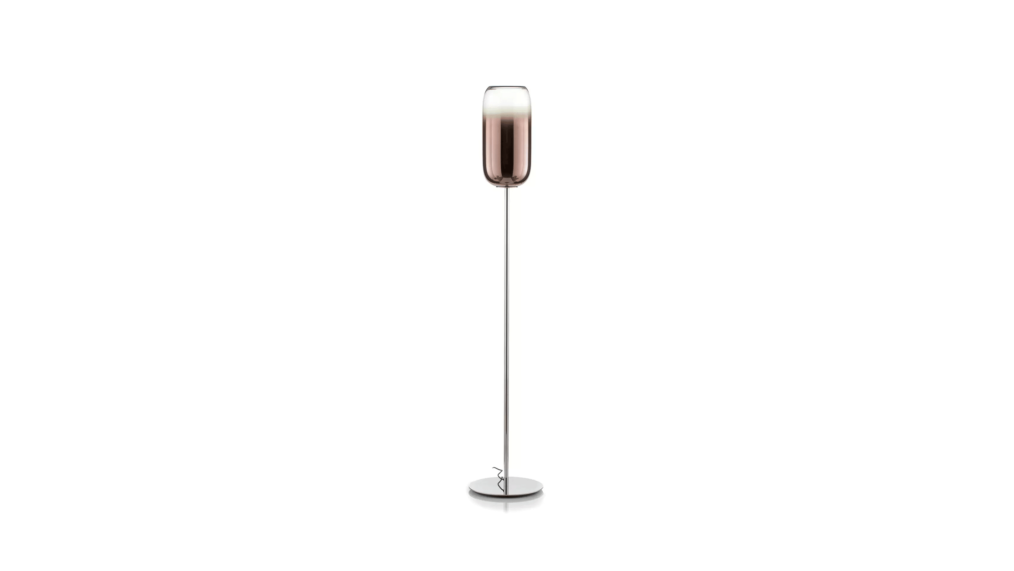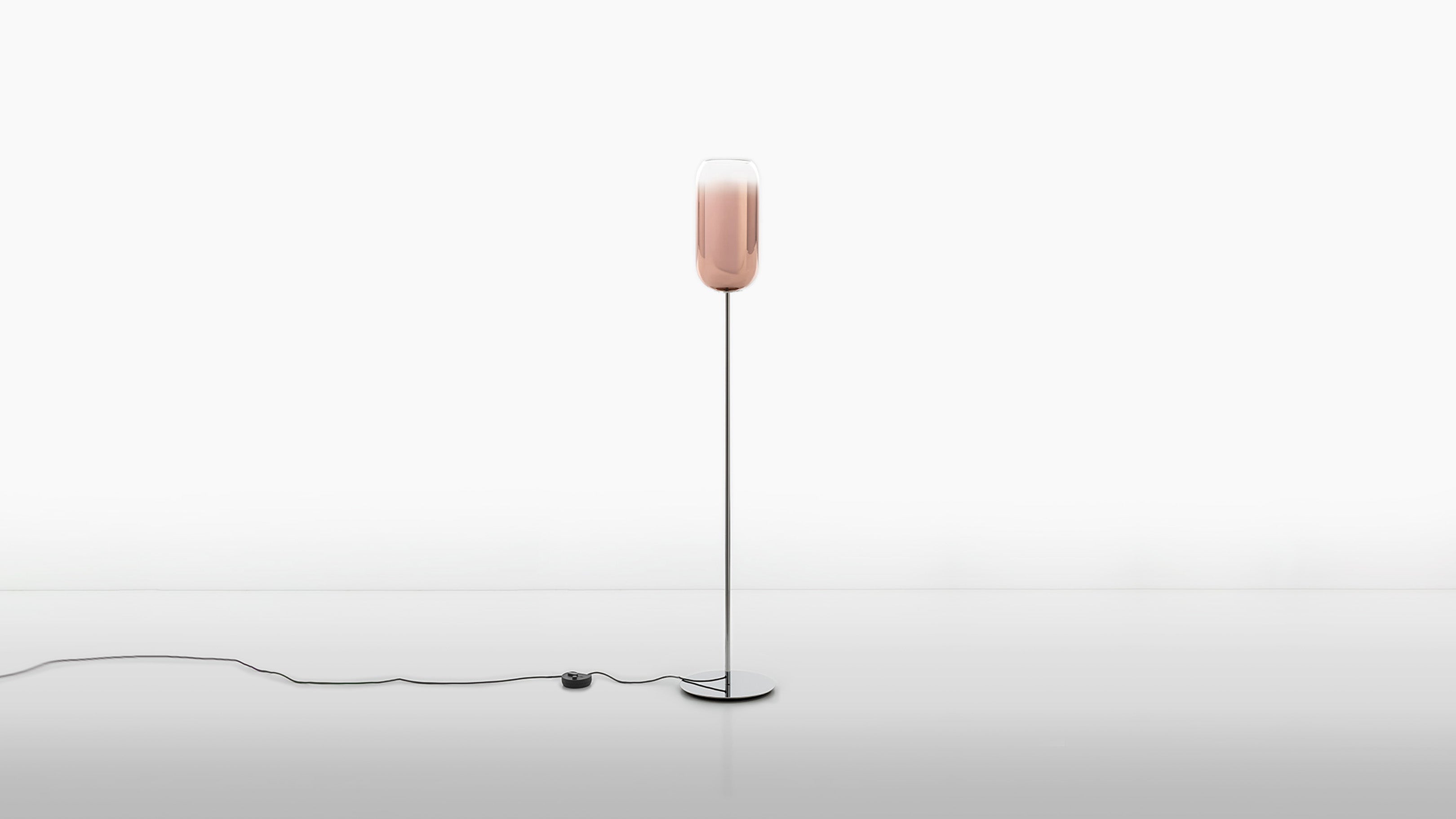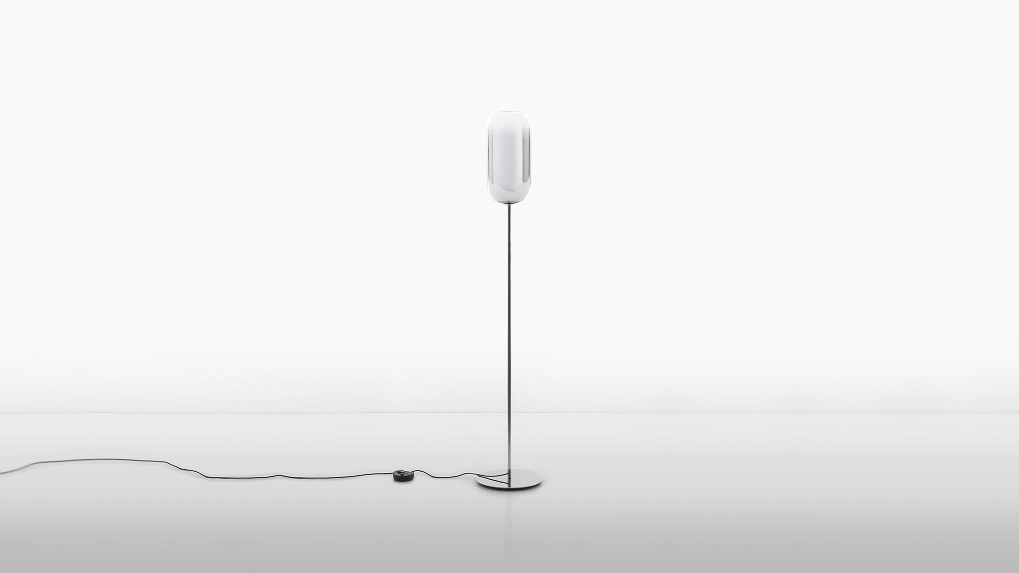 The Gople Floor Lamp, designed by BIG - Bjarke Ingels Group for Artemide, seamlessly blends traditional craftsmanship with modern innovation. Featuring a hand-blown, pill-shaped glass diffuser made using ancient Venetian techniques from Murano, each Gople Lamp is unique. Available in white, or with blue, copper, bronze, and silver finishes achieved through a sustainable PVD (Physical Vapor Deposition) process, the lamp emits a soft, diffused glow that creates a warm and inviting ambiance. The Gople Lamp family offers various models, including the RWB version, which combines controlled red, white, and blue light emission, making it perfect for both living spaces and environments where light affects plant growth.