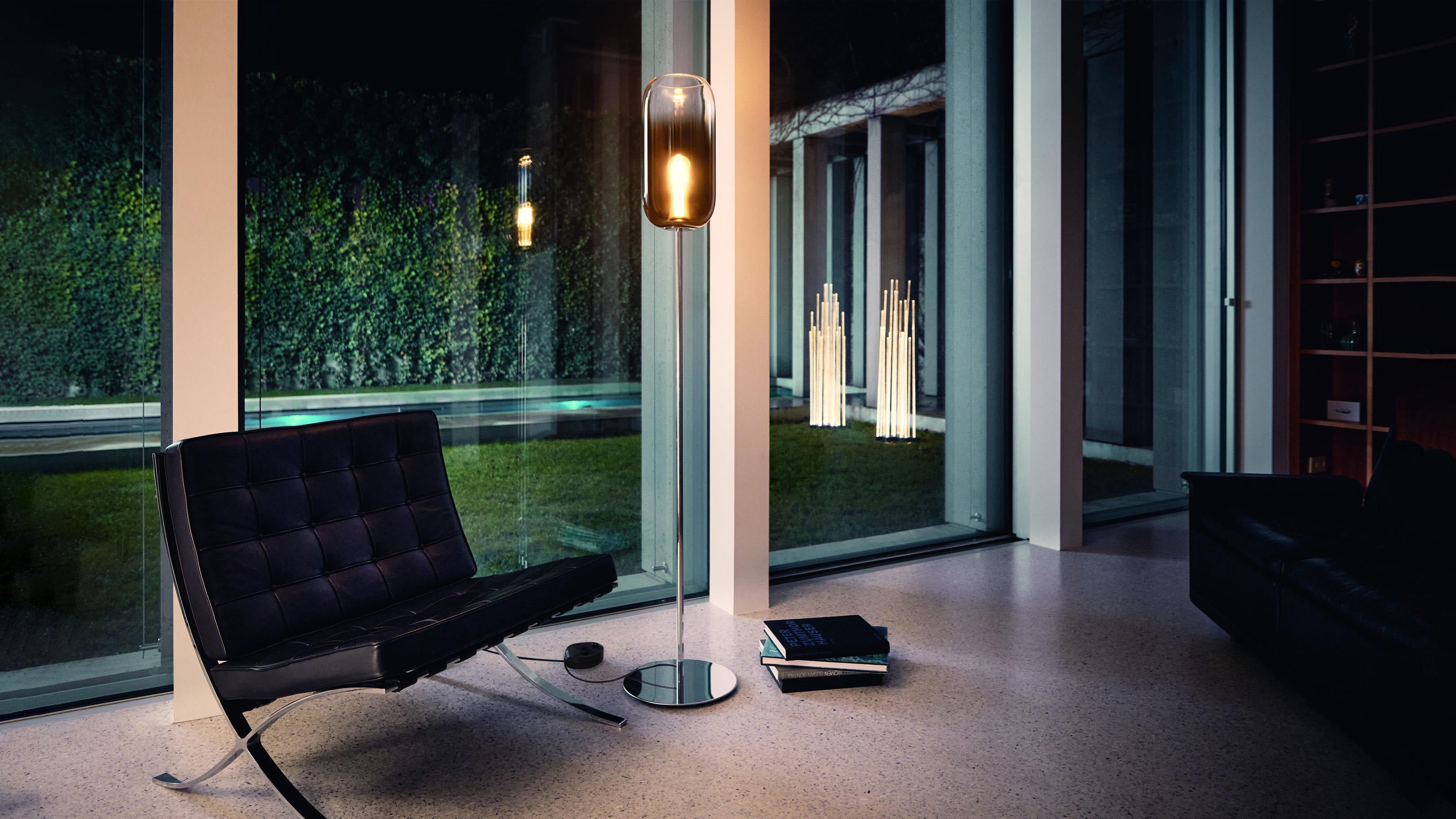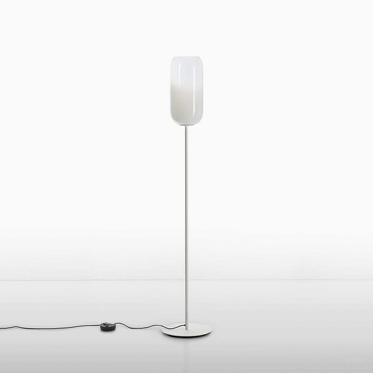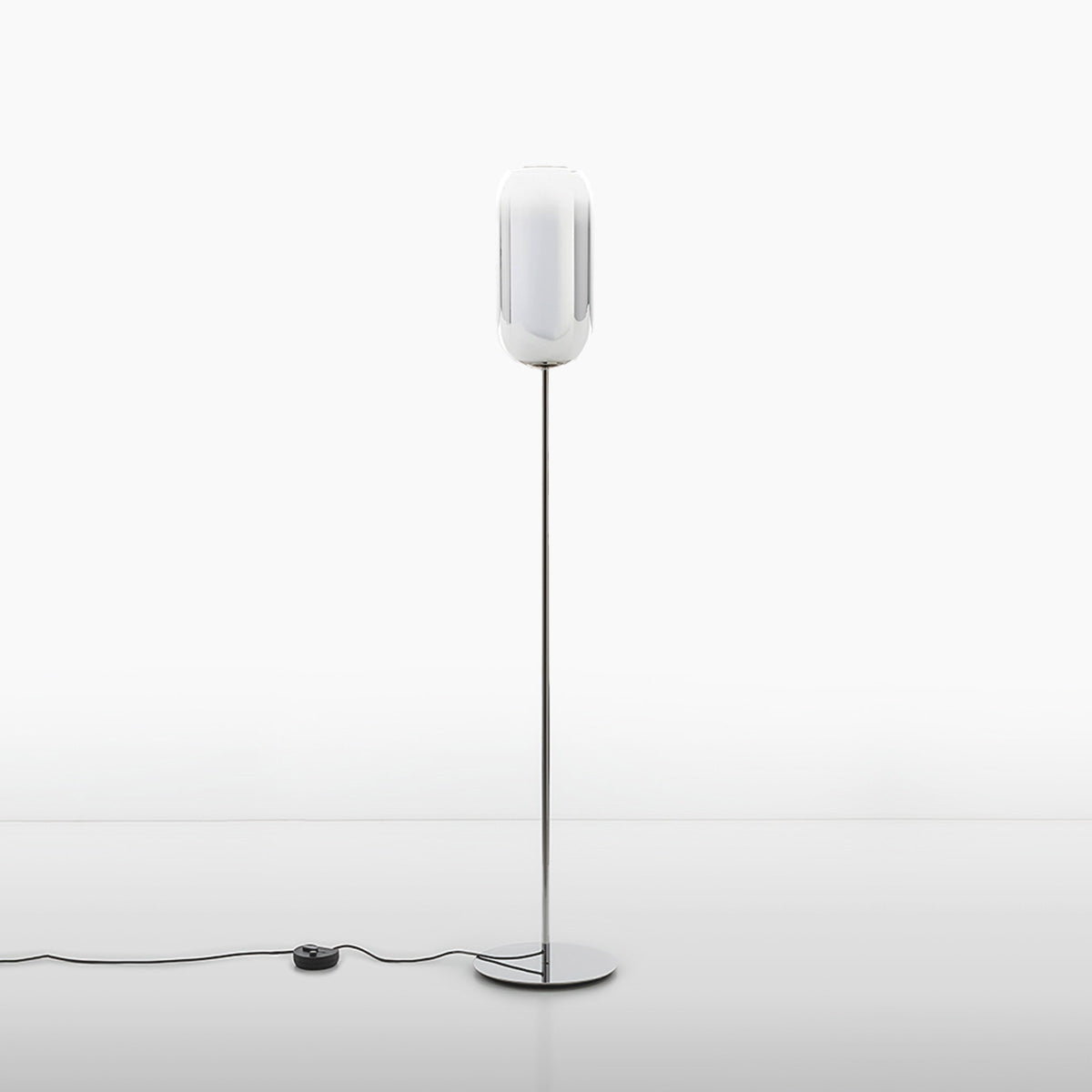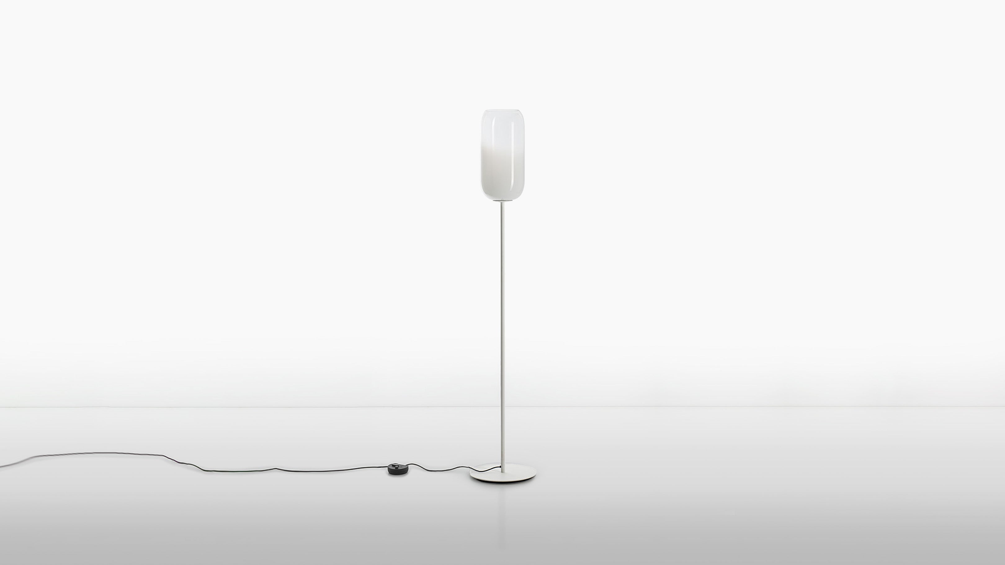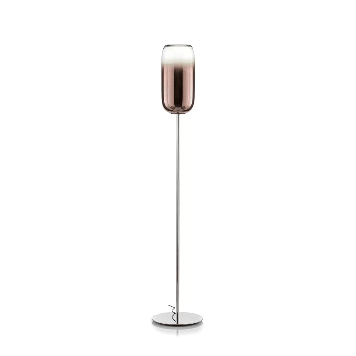 The Gople Floor Lamp, designed by BIG - Bjarke Ingels Group for Artemide, seamlessly blends traditional craftsmanship with modern innovation. Featuring a hand-blown, pill-shaped glass diffuser made using ancient Venetian techniques from Murano, each Gople Lamp is unique. Available in white, or with blue, copper, bronze, and silver finishes achieved through a sustainable PVD (Physical Vapor Deposition) process, the lamp emits a soft, diffused glow that creates a warm and inviting ambiance. The Gople Lamp family offers various models, including the RWB version, which combines controlled red, white, and blue light emission, making it perfect for both living spaces and environments where light affects plant growth.
