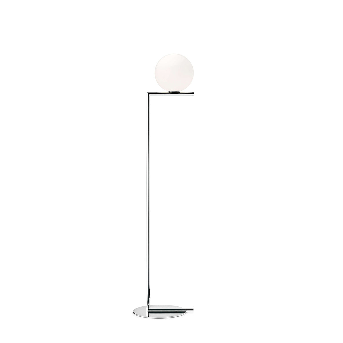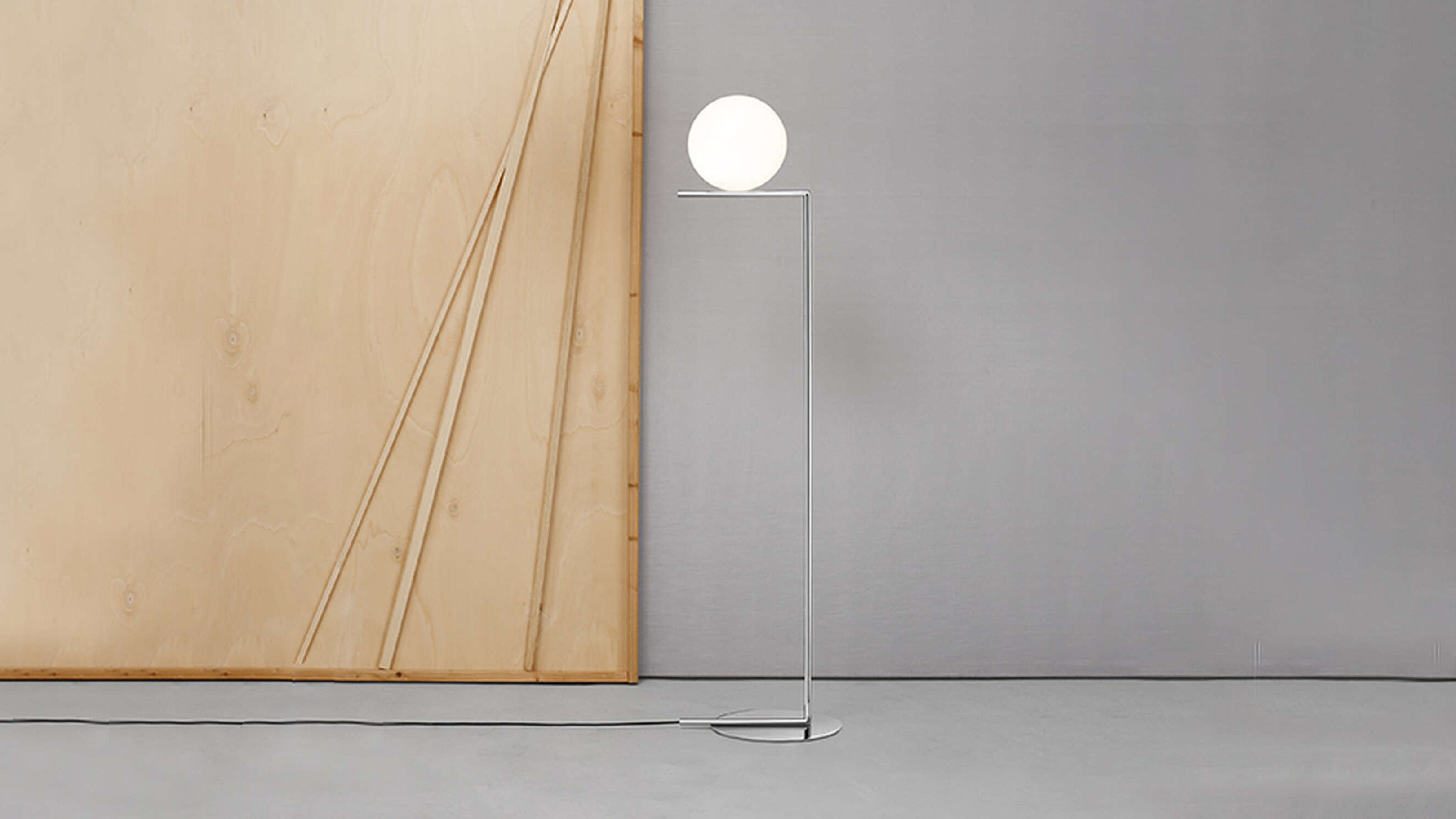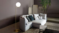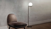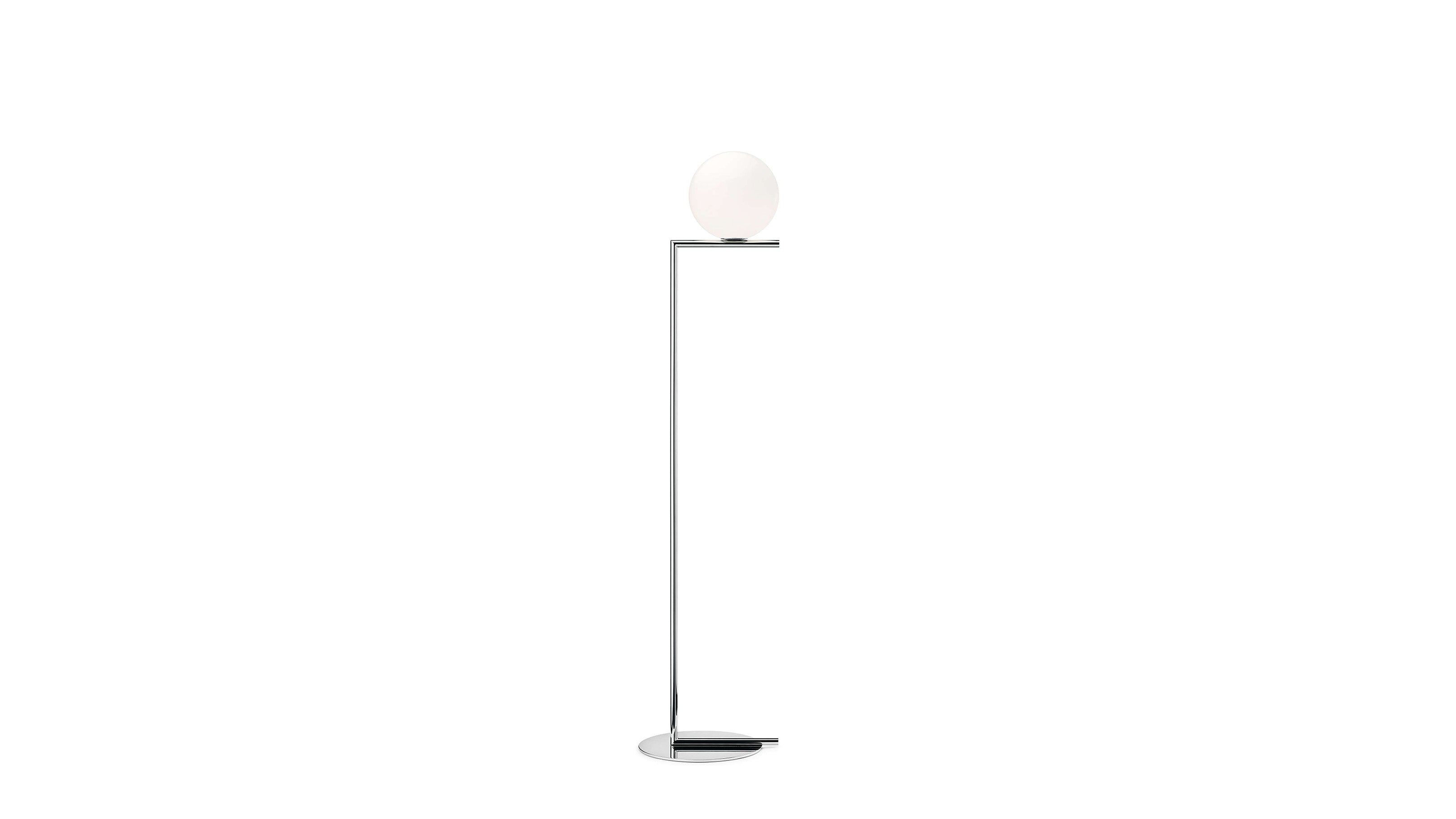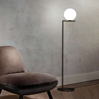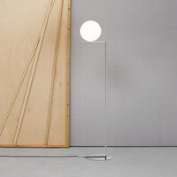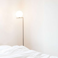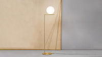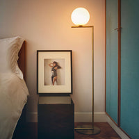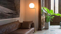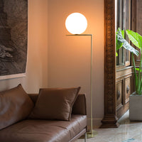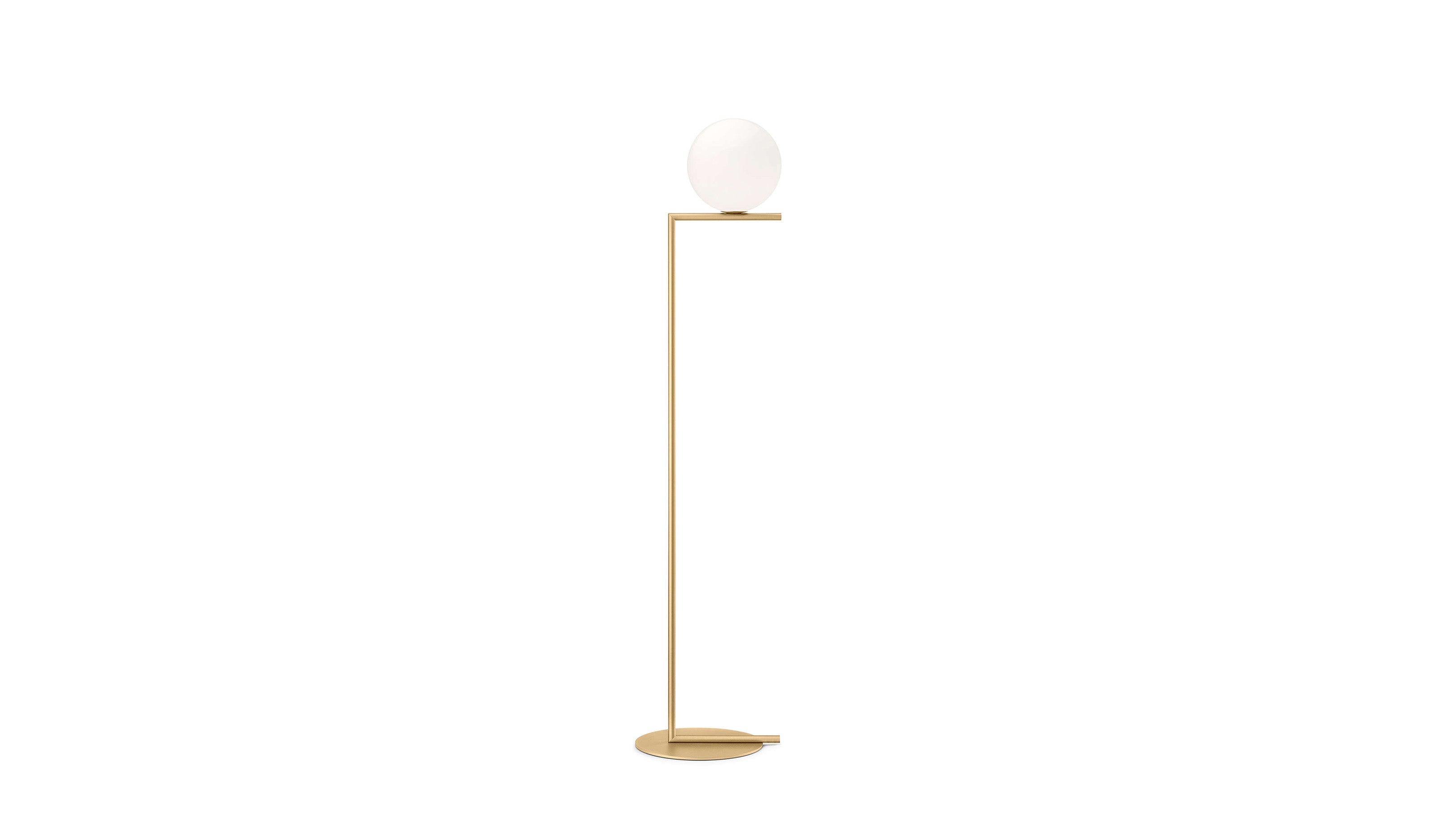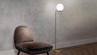The Flos IC Lights F1 Floor Lamp is a masterful combination of industrial elegance and functional design, created by renowned designer Michael Anastassiades. This contemporary piece stands tall at 53 inches, featuring a delicately balanced opaline glass sphere that seems to hover atop a slender brass-finished steel frame. Inspired by the art of juggling, it embodies a moment of poise and grace, delivering a warm, diffused glow perfect for cozy interiors. Equipped with a dimmer for adjustable lighting, this minimalist lamp is a stunning addition to modern living rooms, bedrooms, or office spaces.