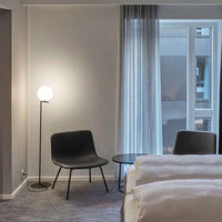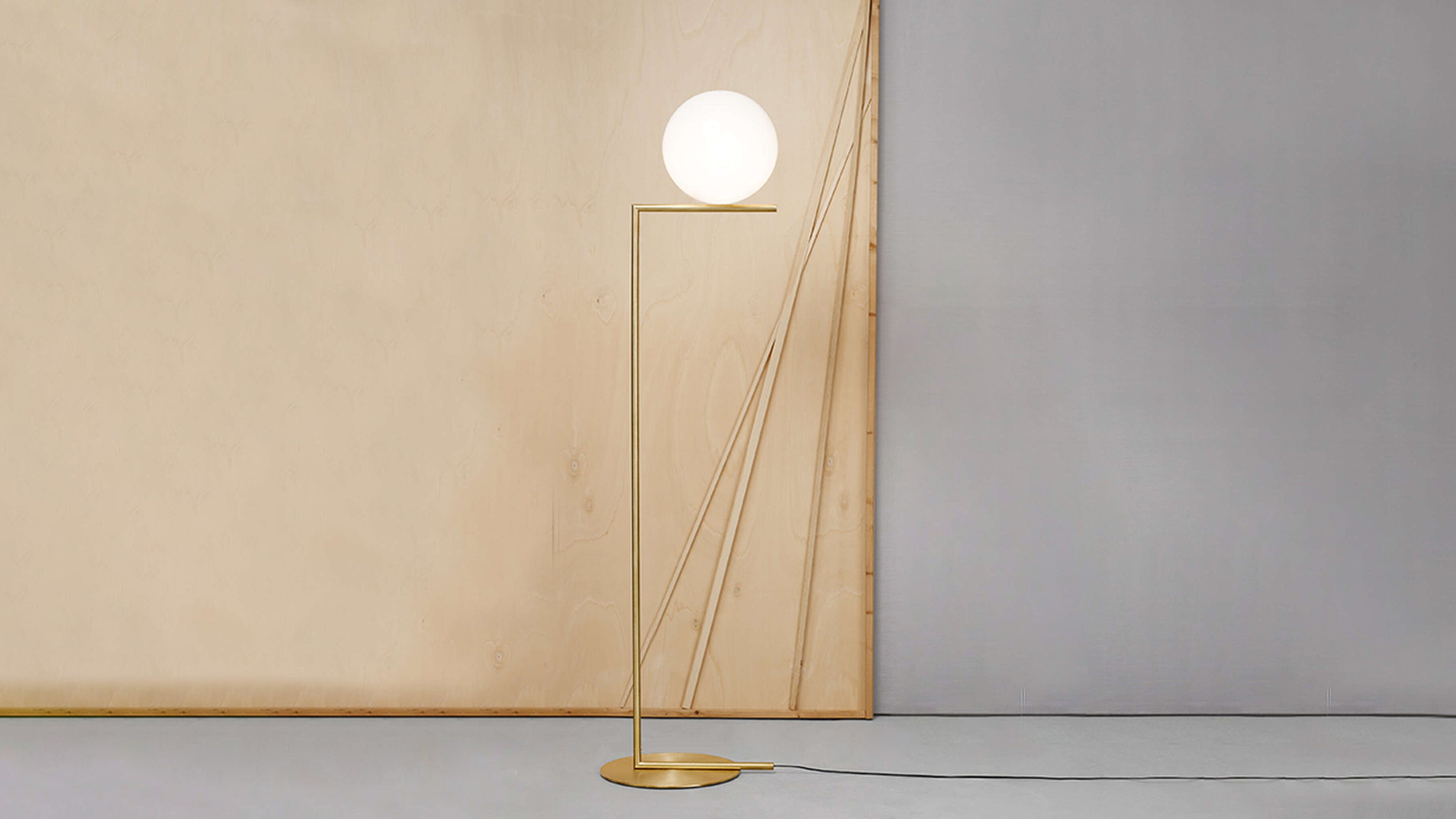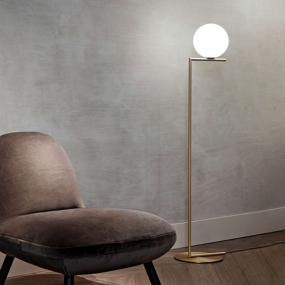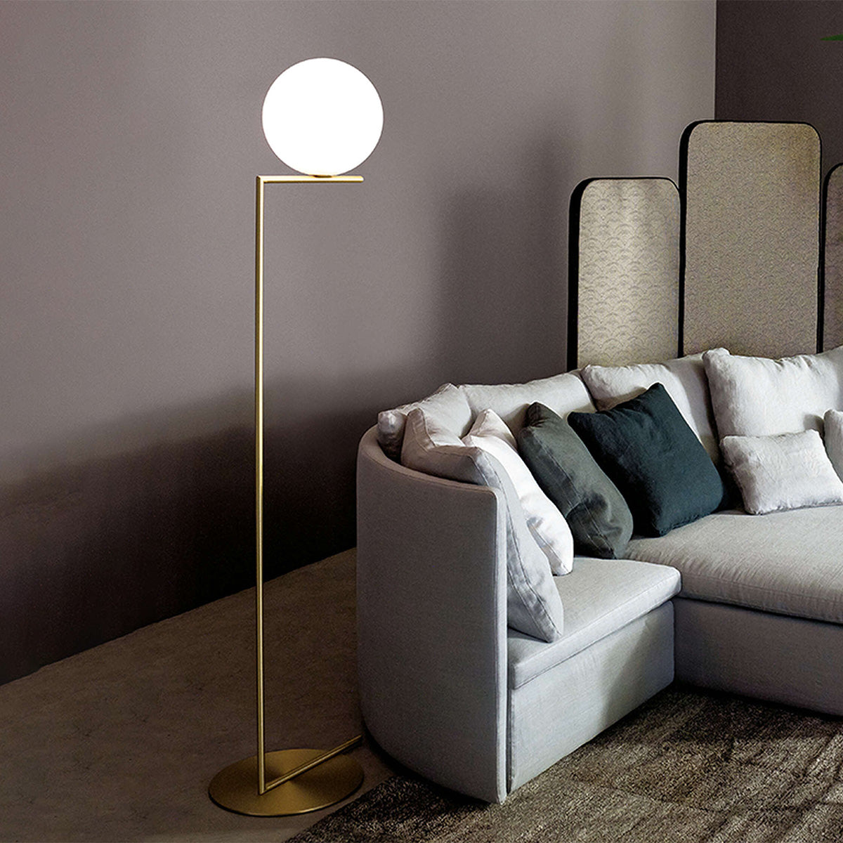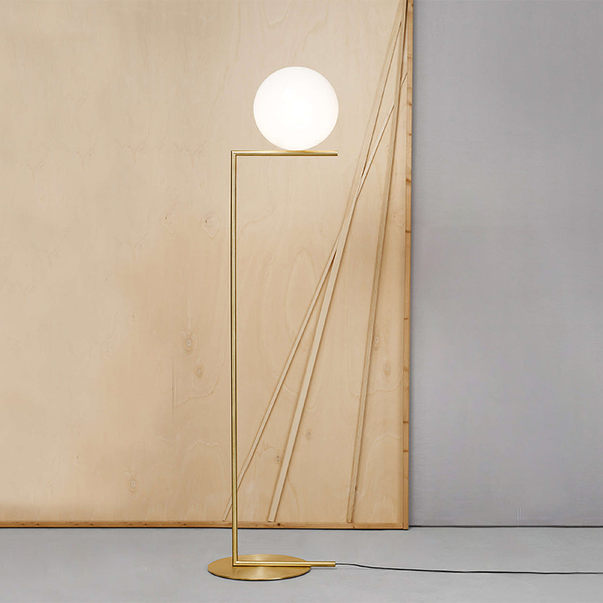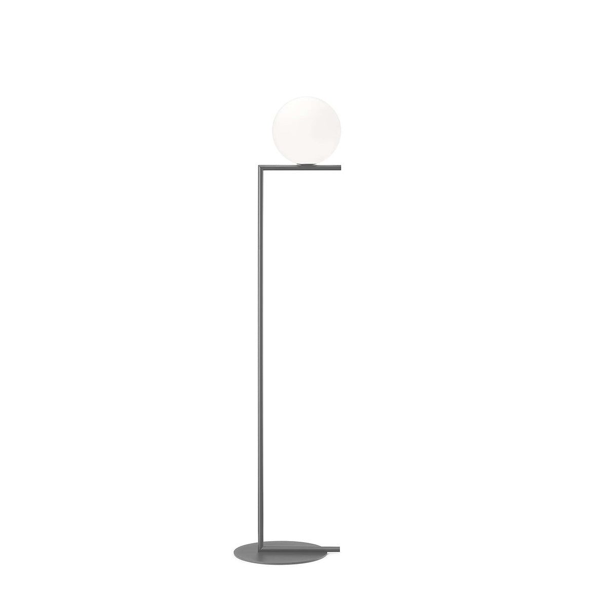The Flos IC Lights F1 Floor Lamp is a masterful combination of industrial elegance and functional design, created by renowned designer Michael Anastassiades. This contemporary piece stands tall at 53 inches, featuring a delicately balanced opaline glass sphere that seems to hover atop a slender brass-finished steel frame. Inspired by the art of juggling, it embodies a moment of poise and grace, delivering a warm, diffused glow perfect for cozy interiors. Equipped with a dimmer for adjustable lighting, this minimalist lamp is a stunning addition to modern living rooms, bedrooms, or office spaces.