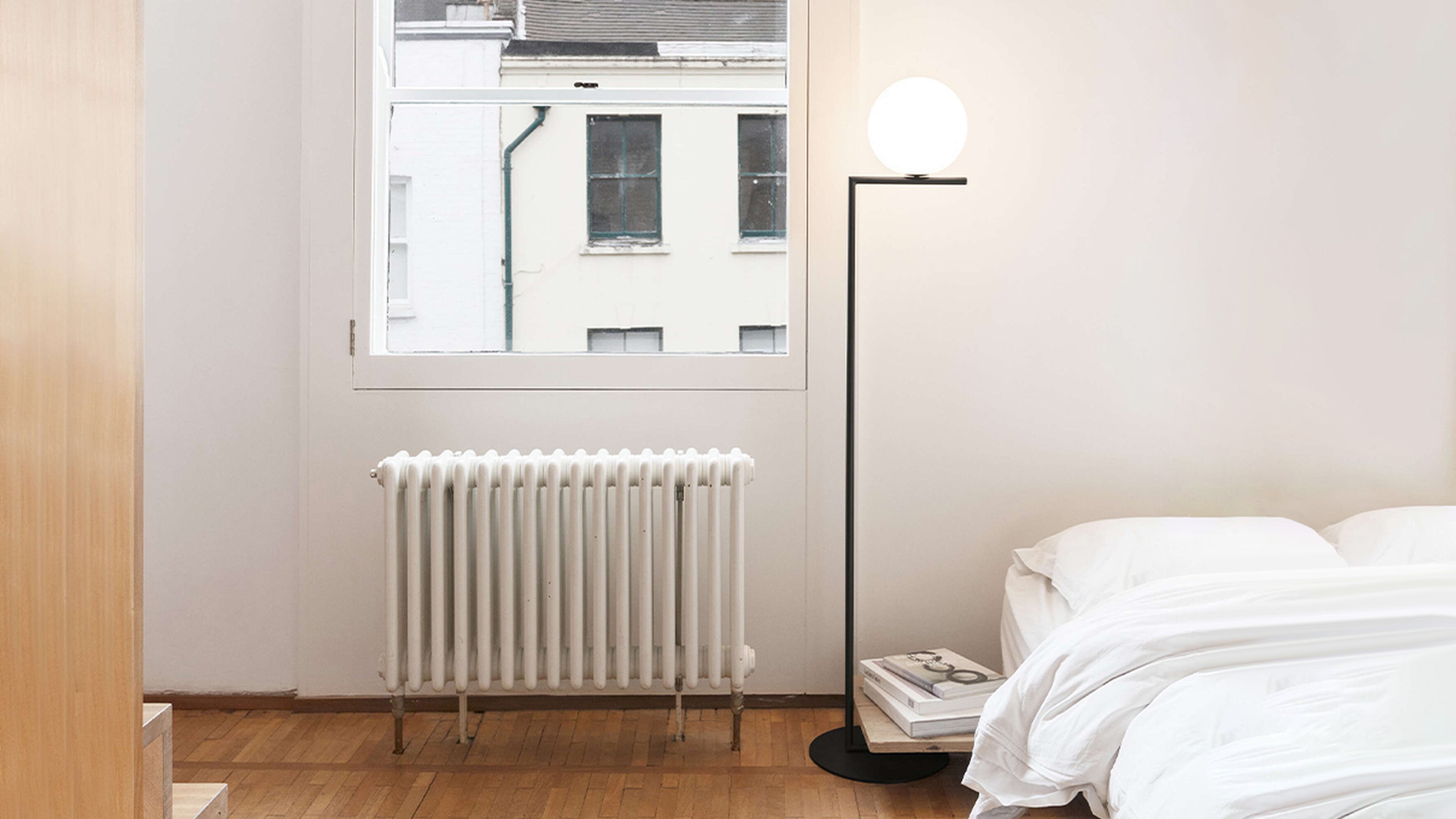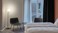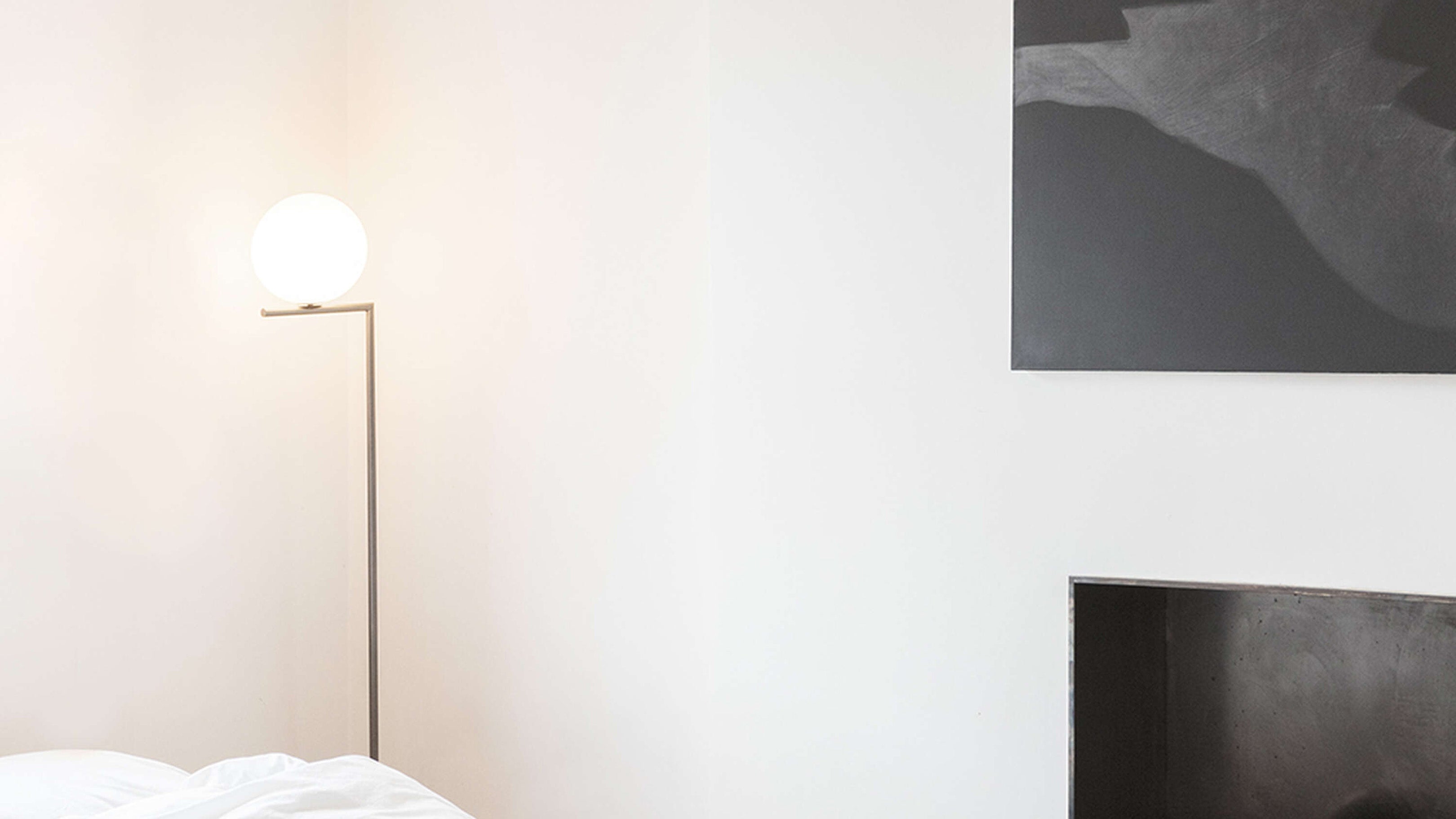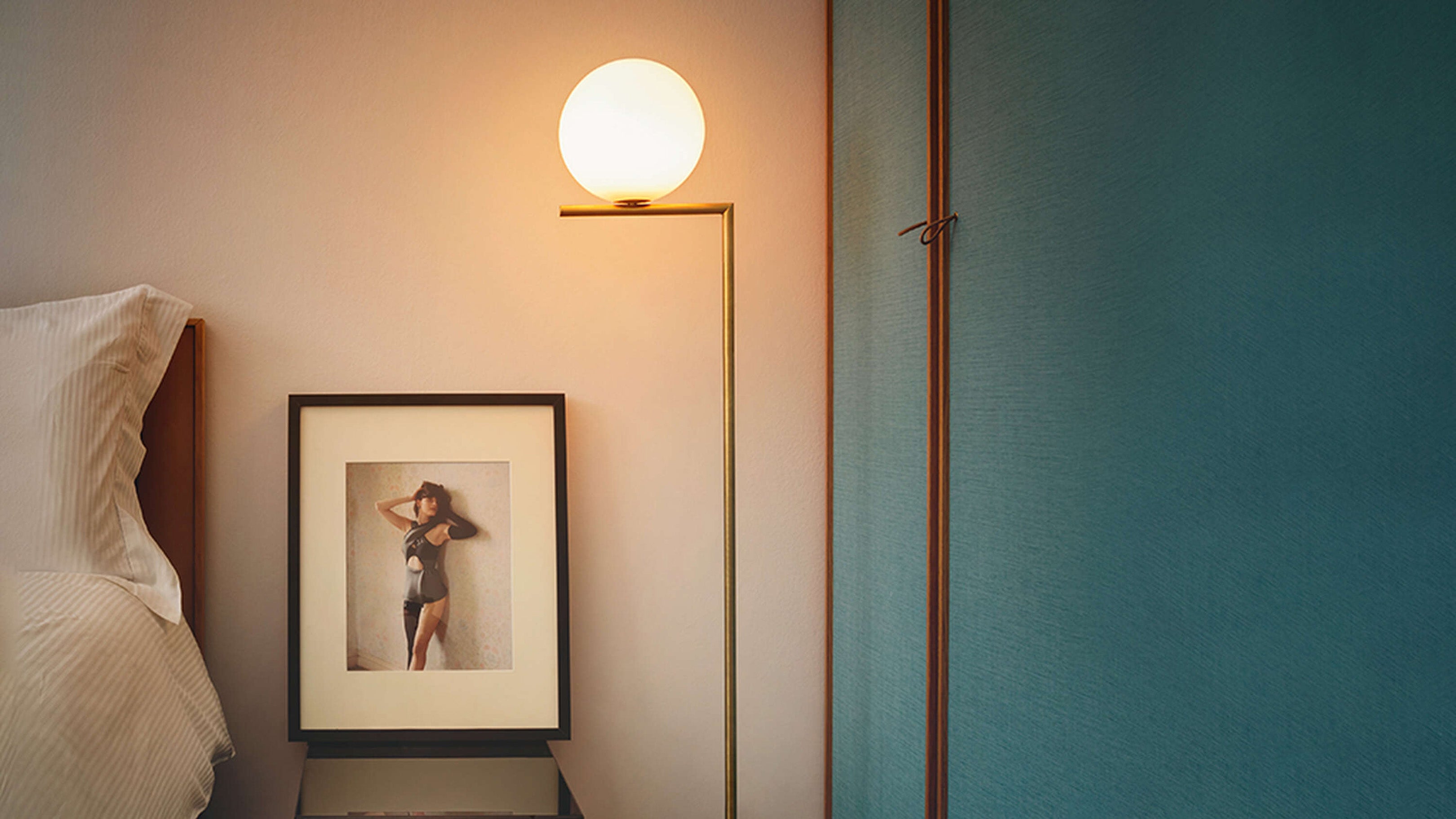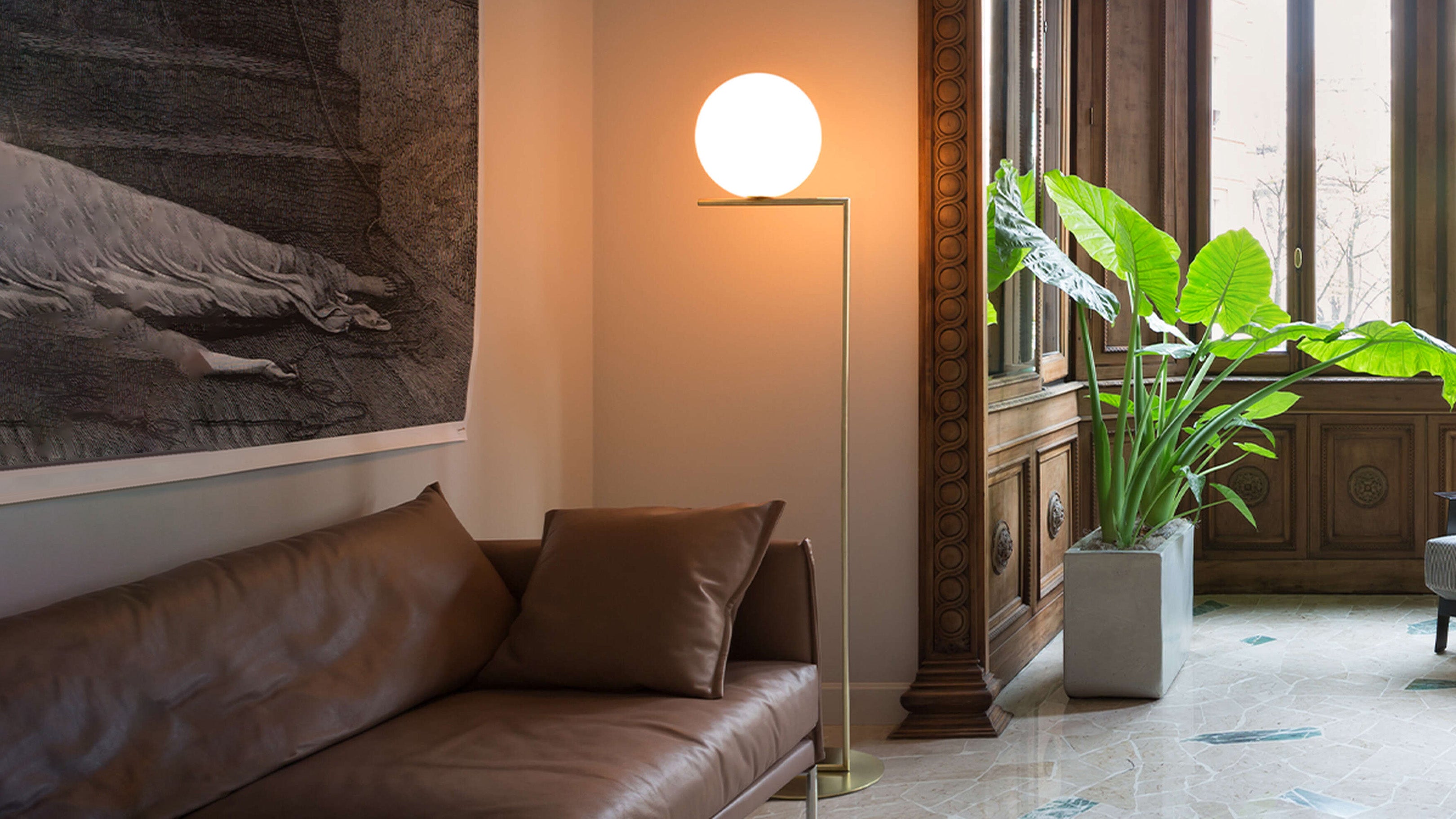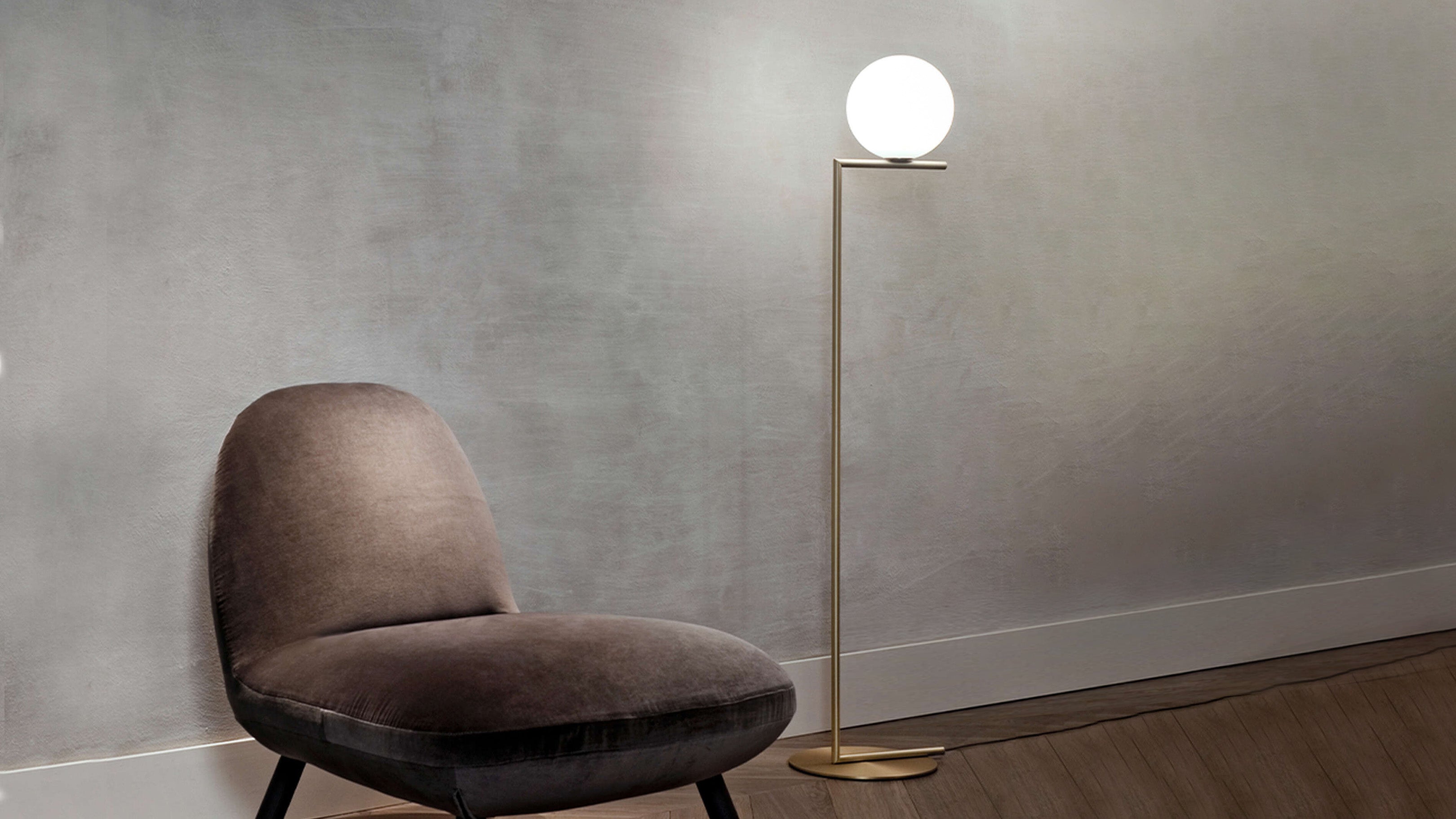 The Flos IC Lights F1 Floor Lamp is a masterful combination of industrial elegance and functional design, created by renowned designer Michael Anastassiades. This contemporary piece stands tall at 53 inches, featuring a delicately balanced opaline glass sphere that seems to hover atop a slender brass-finished steel frame. Inspired by the art of juggling, it embodies a moment of poise and grace, delivering a warm, diffused glow perfect for cozy interiors. Equipped with a dimmer for adjustable lighting, this minimalist lamp is a stunning addition to modern living rooms, bedrooms, or office spaces.