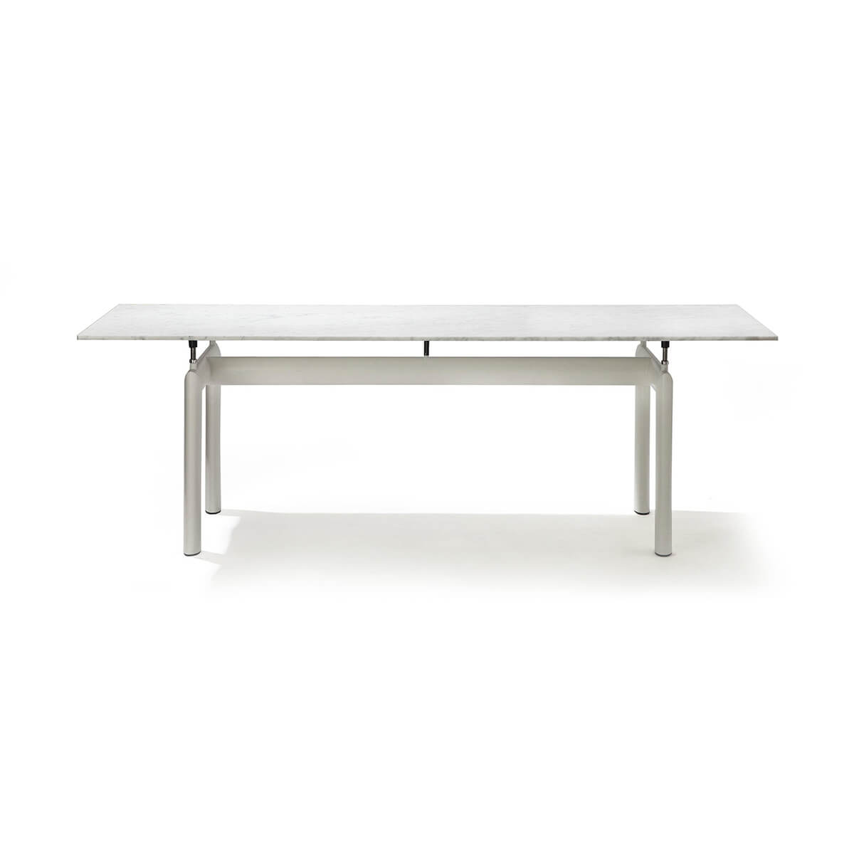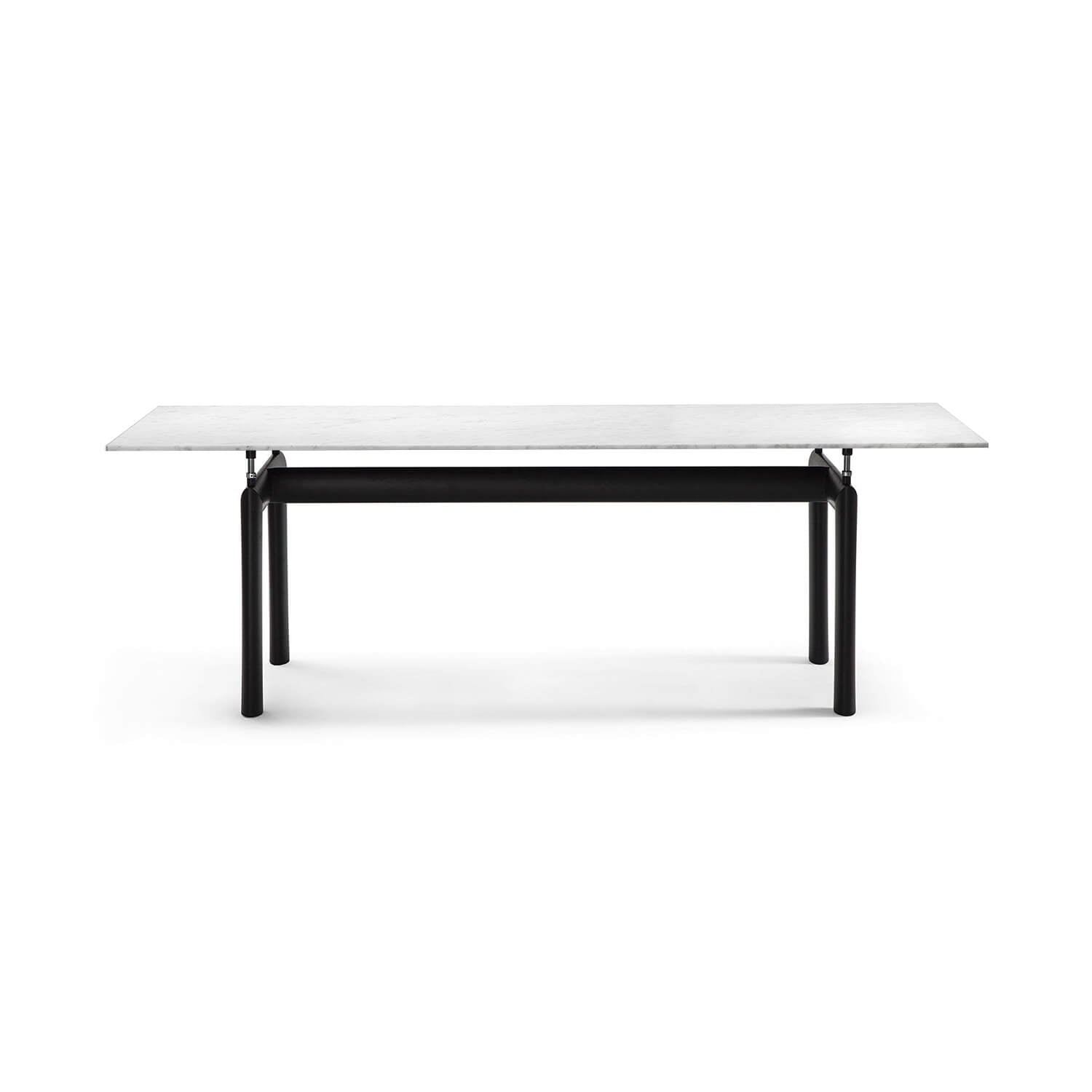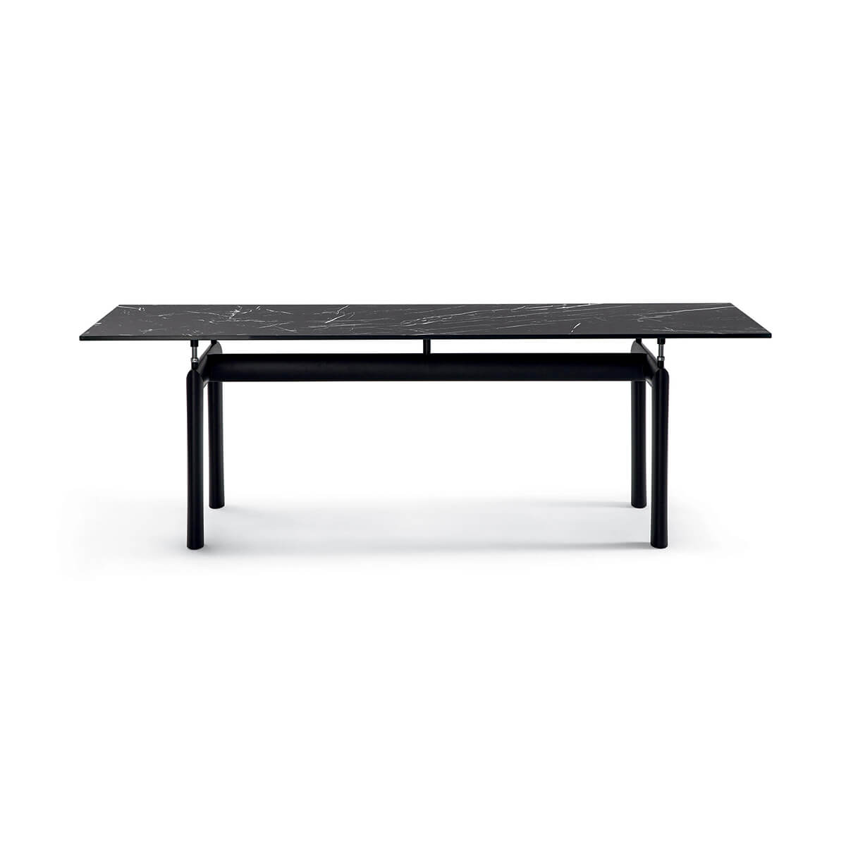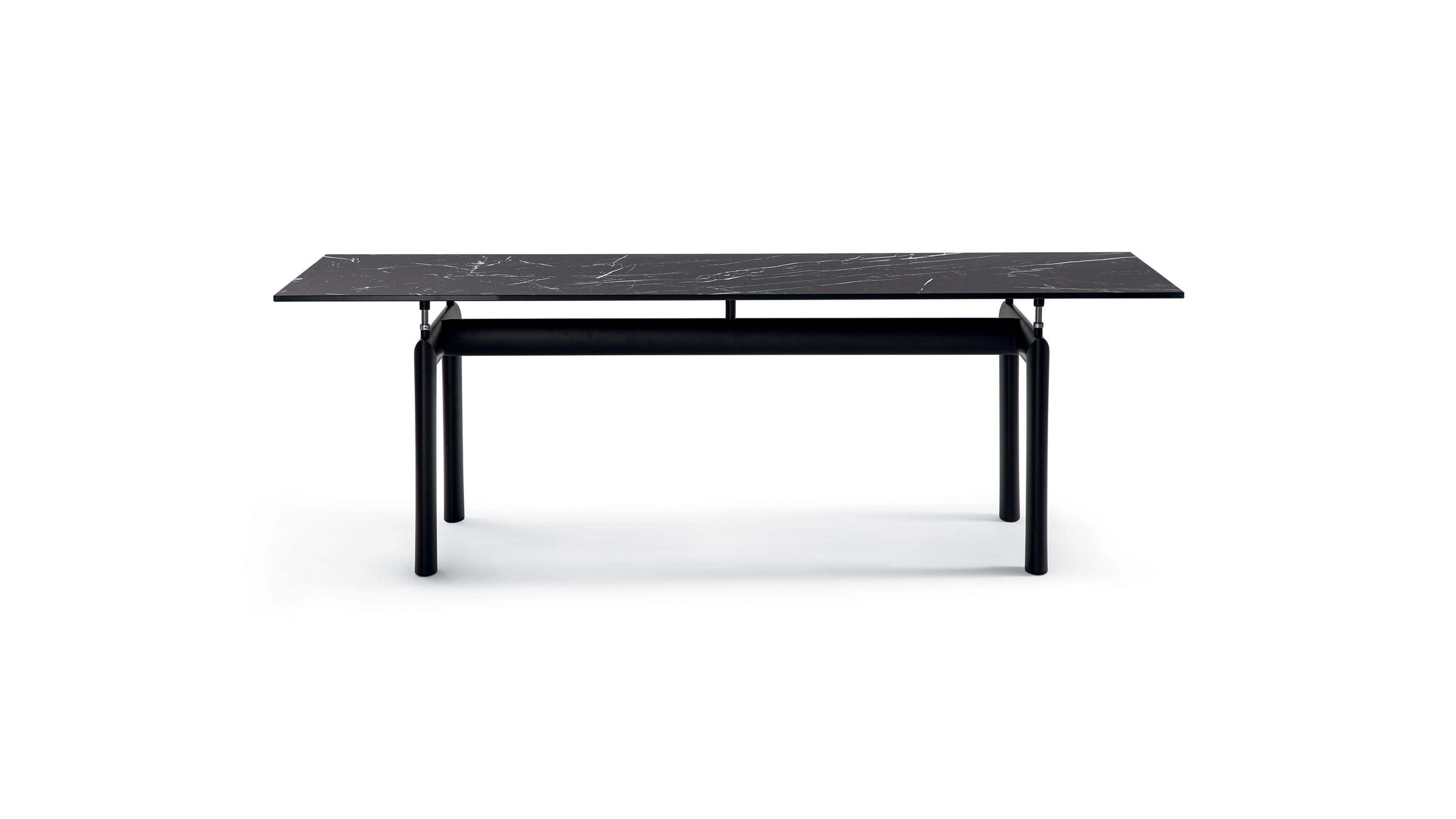 An iconic design by a master of modern architecture, the LC6 Table made by Cassina expresses a dynamic distinction between its load-bearing base and the top that is to be supported. Designed by Le Corbusier, the table is completely autonomous and this is highlighted by the addition of the four middle support pieces used to adjust the height and keep the slim rectangular top in place over its heavy base.