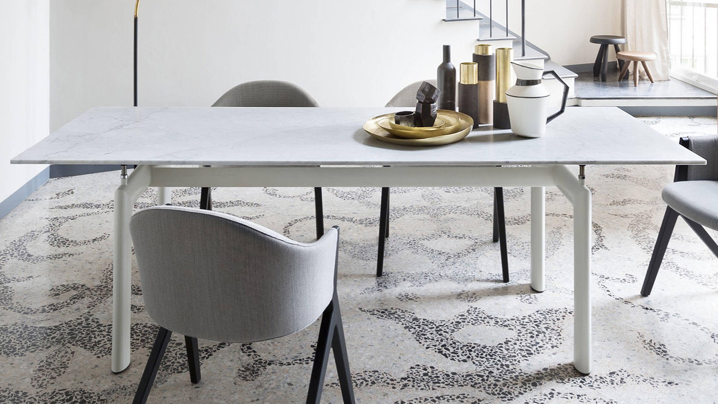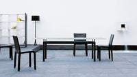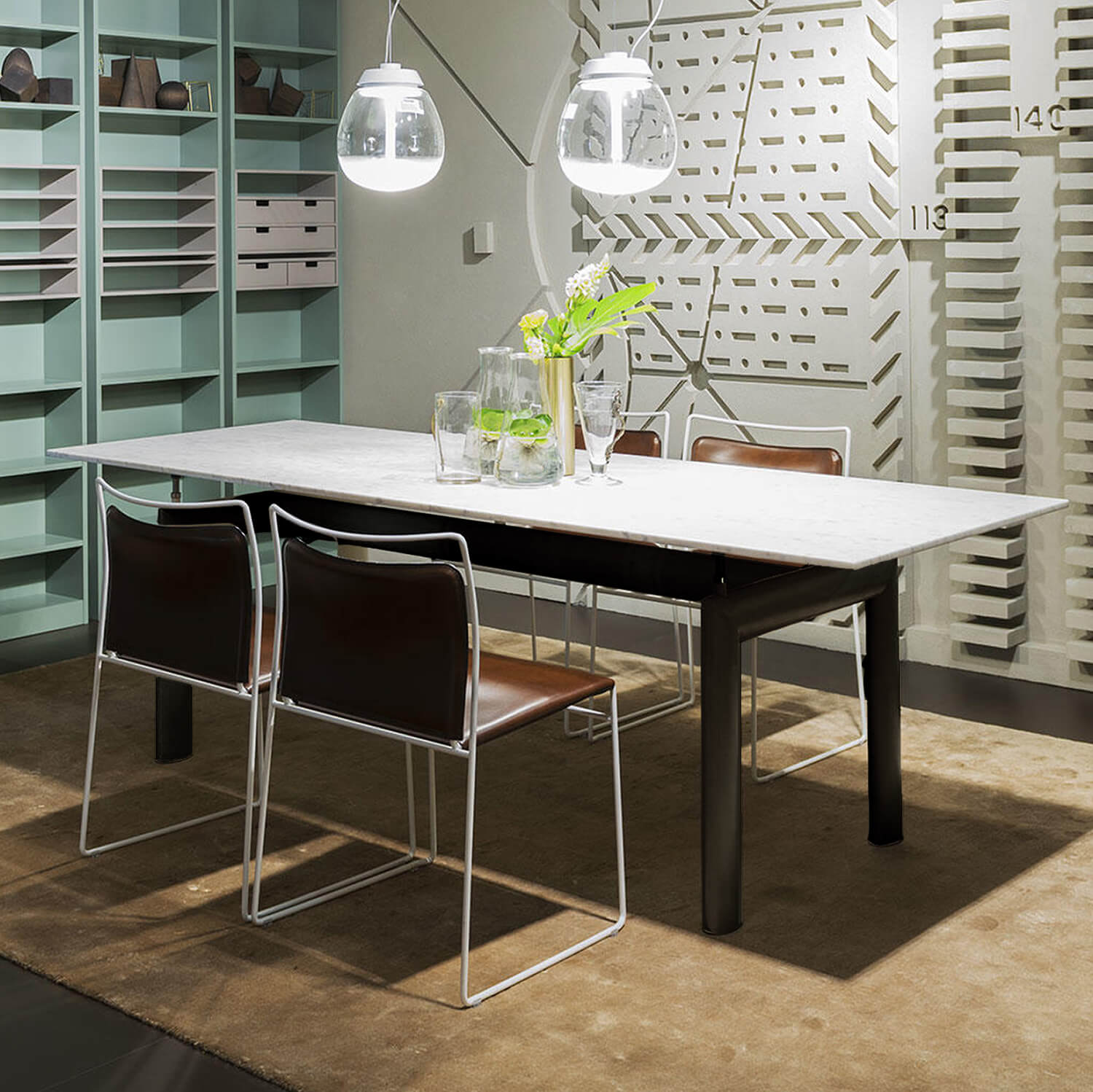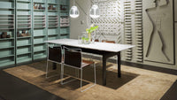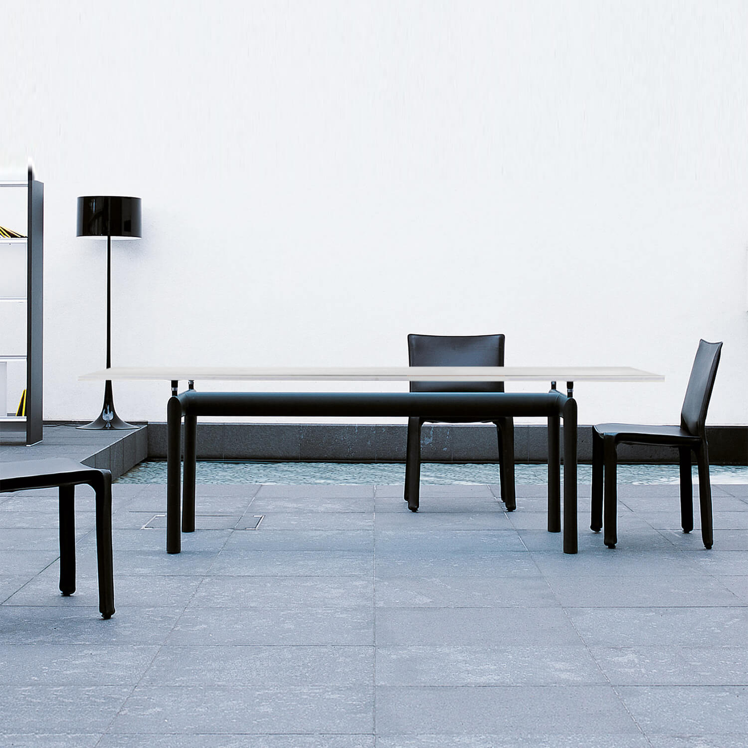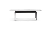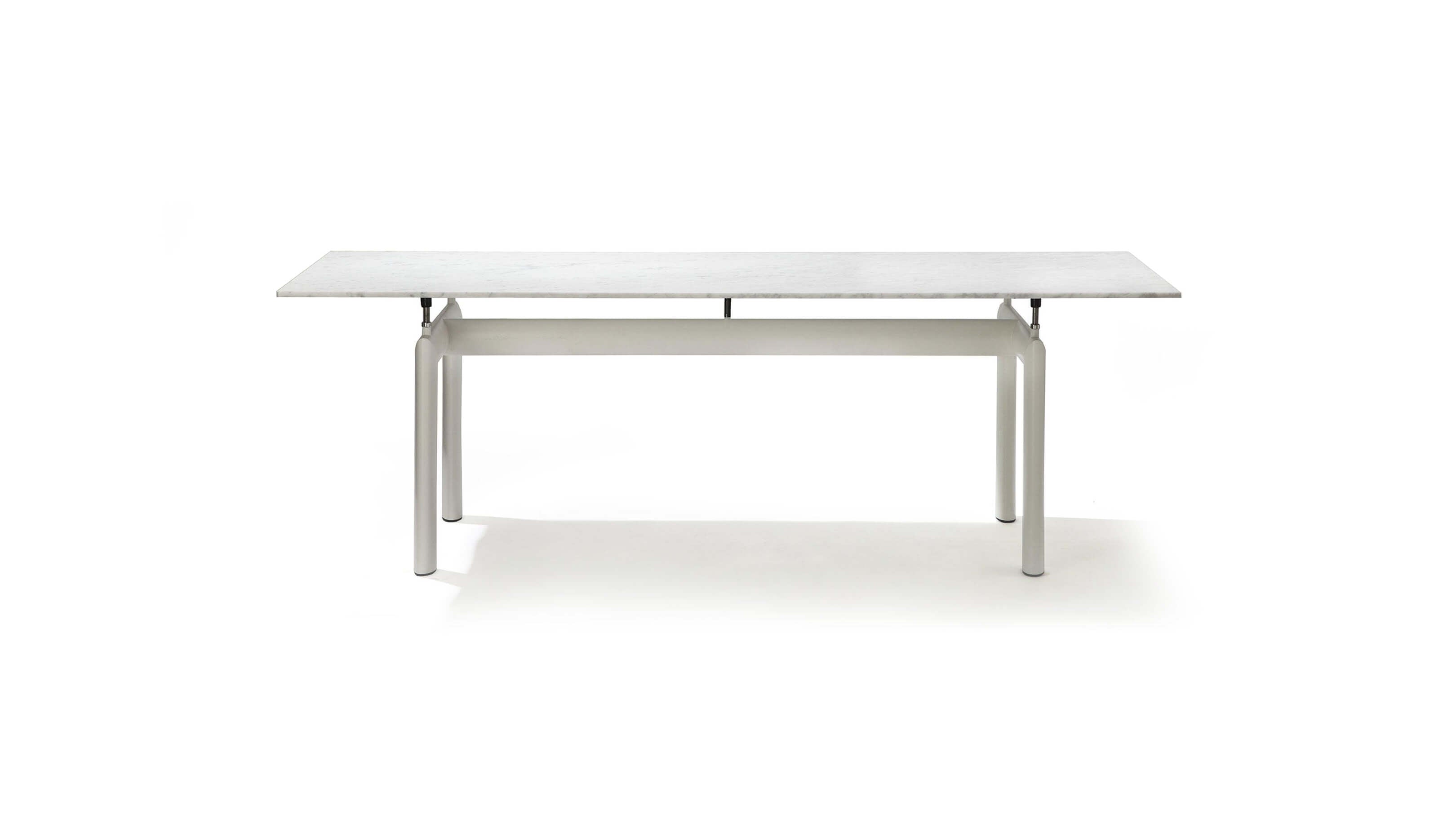An iconic design by a master of modern architecture, the LC6 Table made by Cassina expresses a dynamic distinction between its load-bearing base and the top that is to be supported. Designed by Le Corbusier, the table is completely autonomous and this is highlighted by the addition of the four middle support pieces used to adjust the height and keep the slim rectangular top in place over its heavy base.