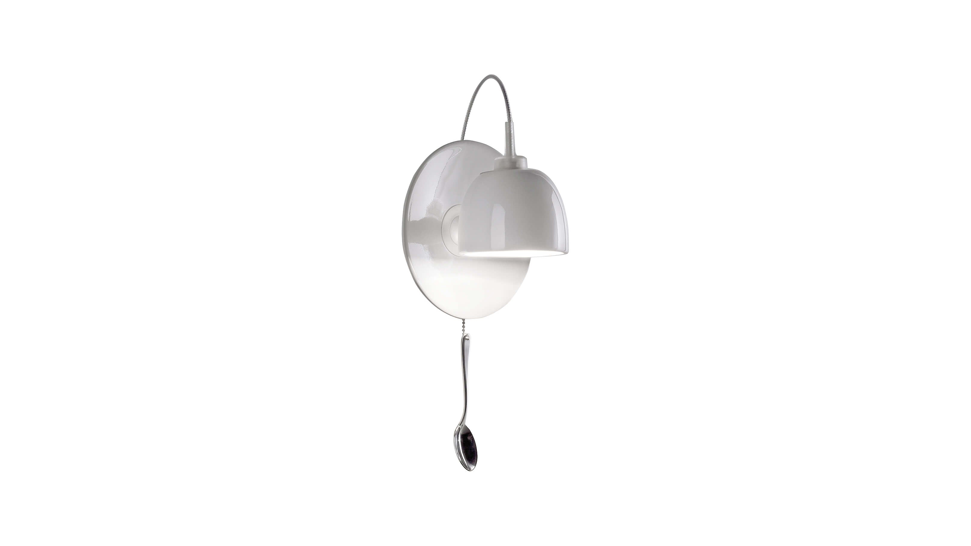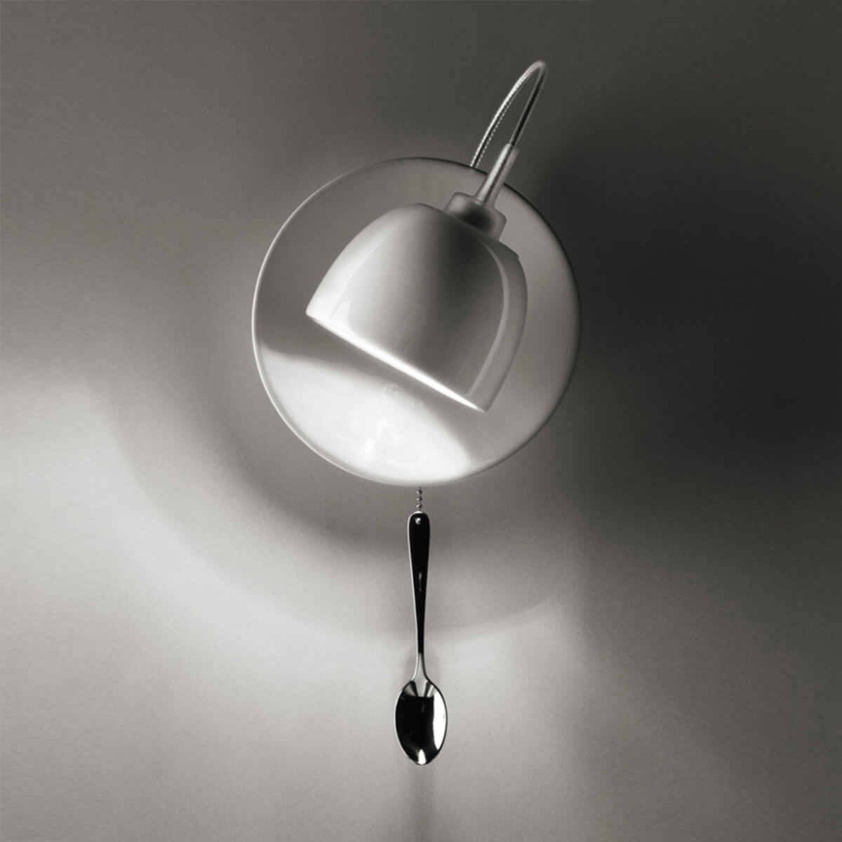 Blurring the boundary between art and functional design, Fabien Dumas and Ingo Maurer have teamed up with Light au Lait, a whimsical wall lamp crafted from a cup, saucer and spoon. The spoon, hanging from a stainless steel chain, may be pulled to turn the light on or off. The lamp swivels through 180° and can be bent down or up to 30° by means of a ball joint. The Light au Lait features an on-wall socket, but can also be mounted with an in-wall socket. The 200 cm cable is equipped with a plug, simplifying the lamp's installation. This wall lamp features Maurer's characteristic poetic approach to design which is sure to delight and add character to any space.