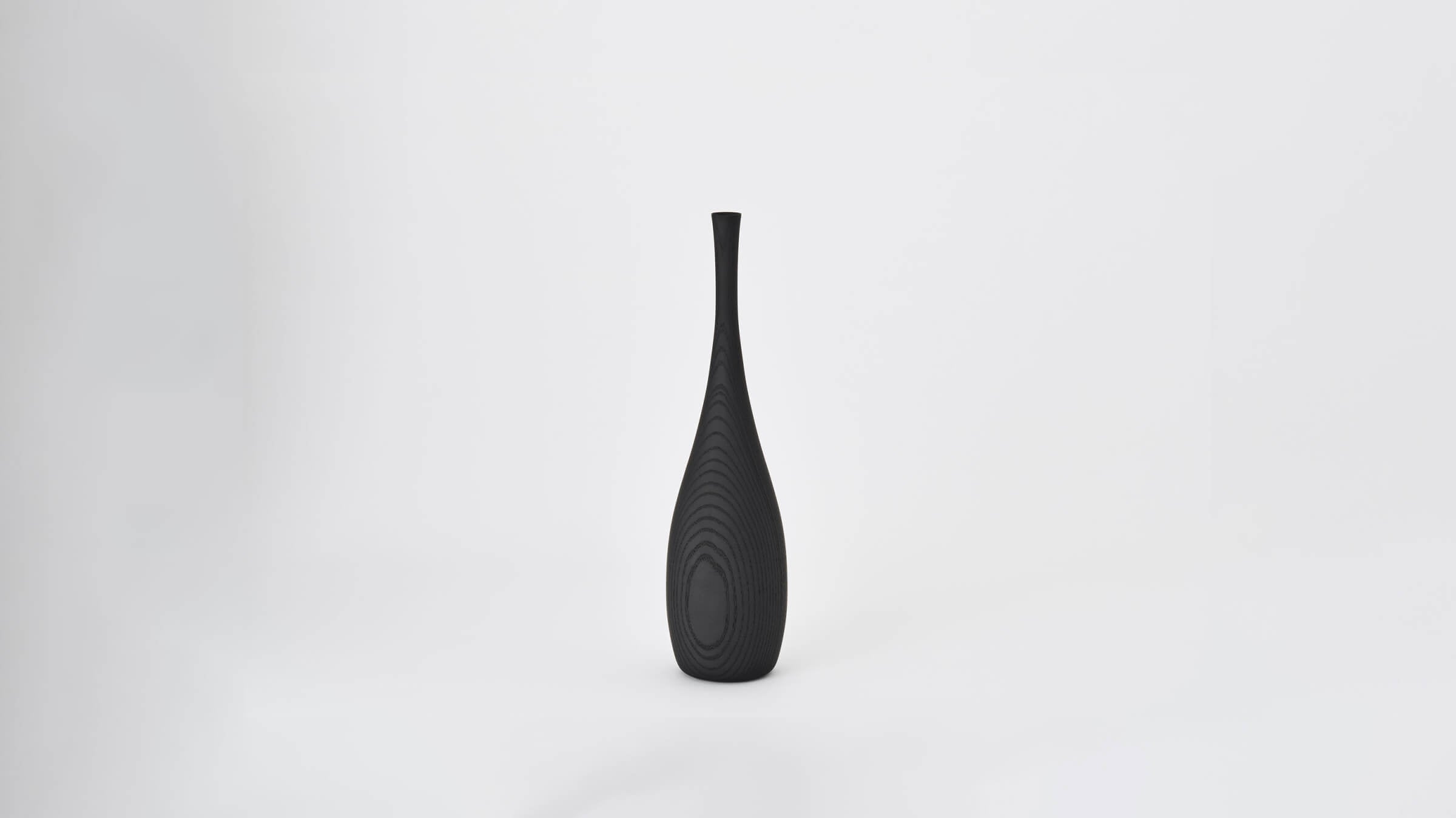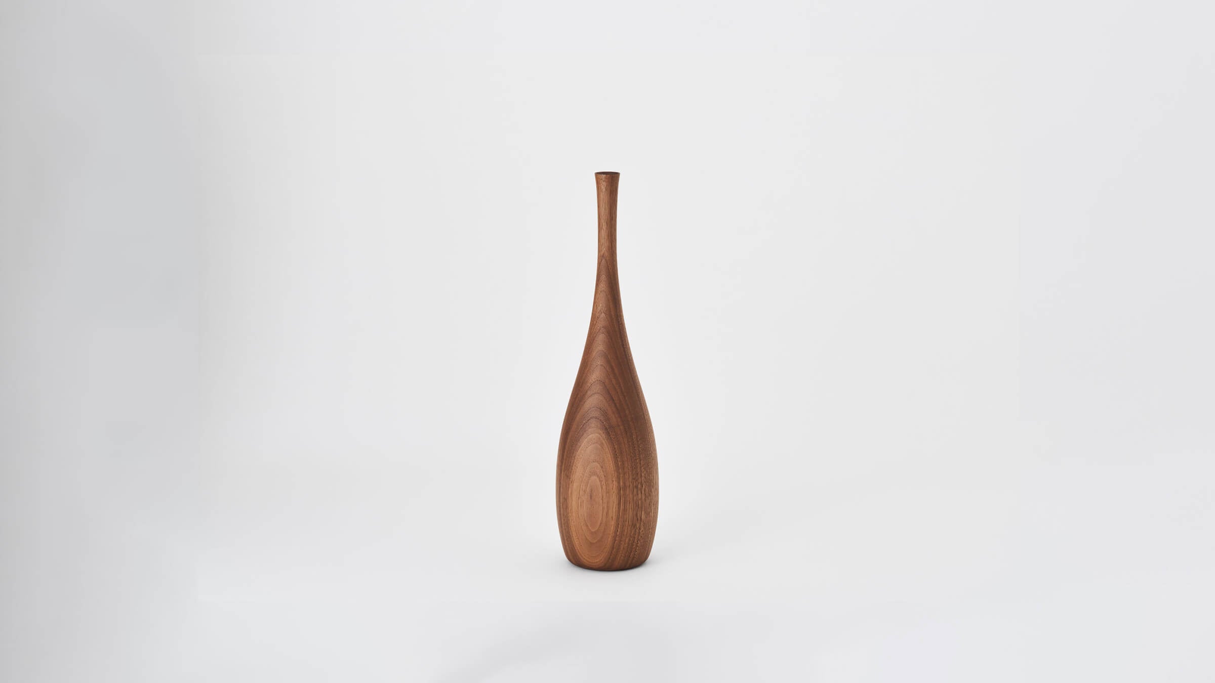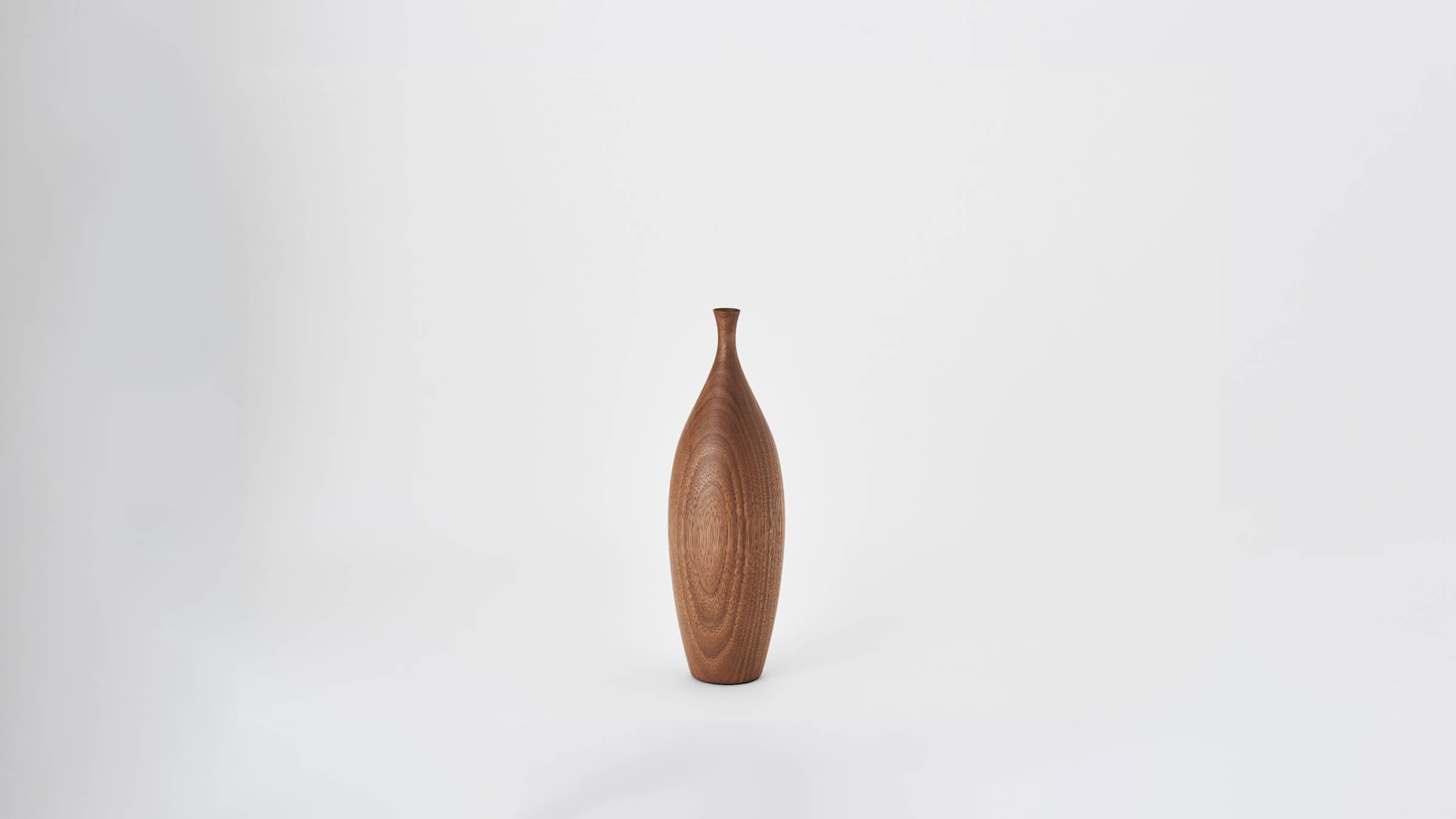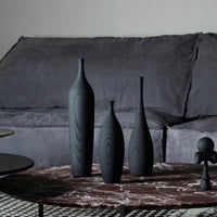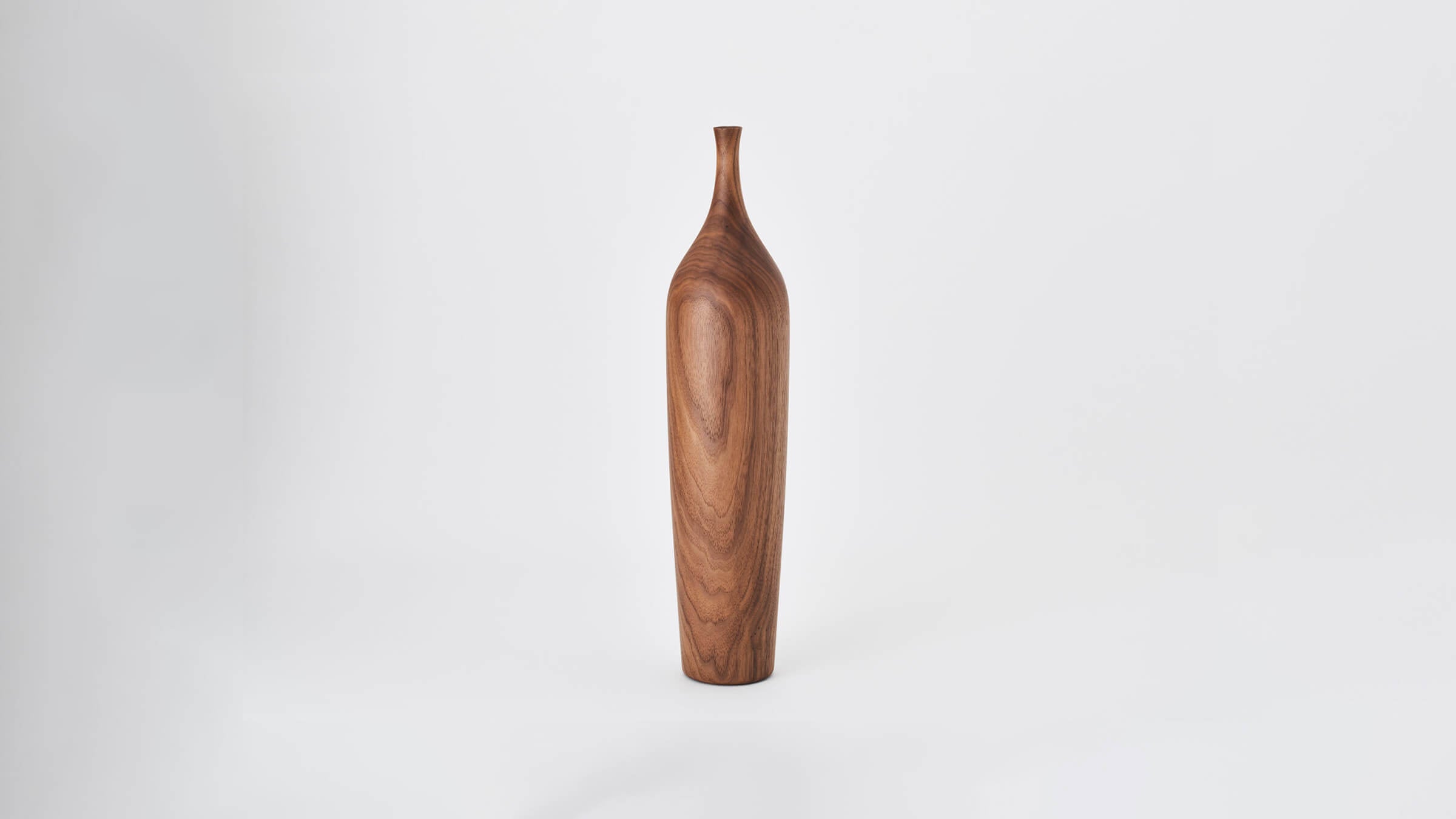 The Linea Vases by Mugen Mosou combine classic shapes with rich, grained wood and smooth curves. Available in both black ash and walnut, the vases come in three shapes and sizes.