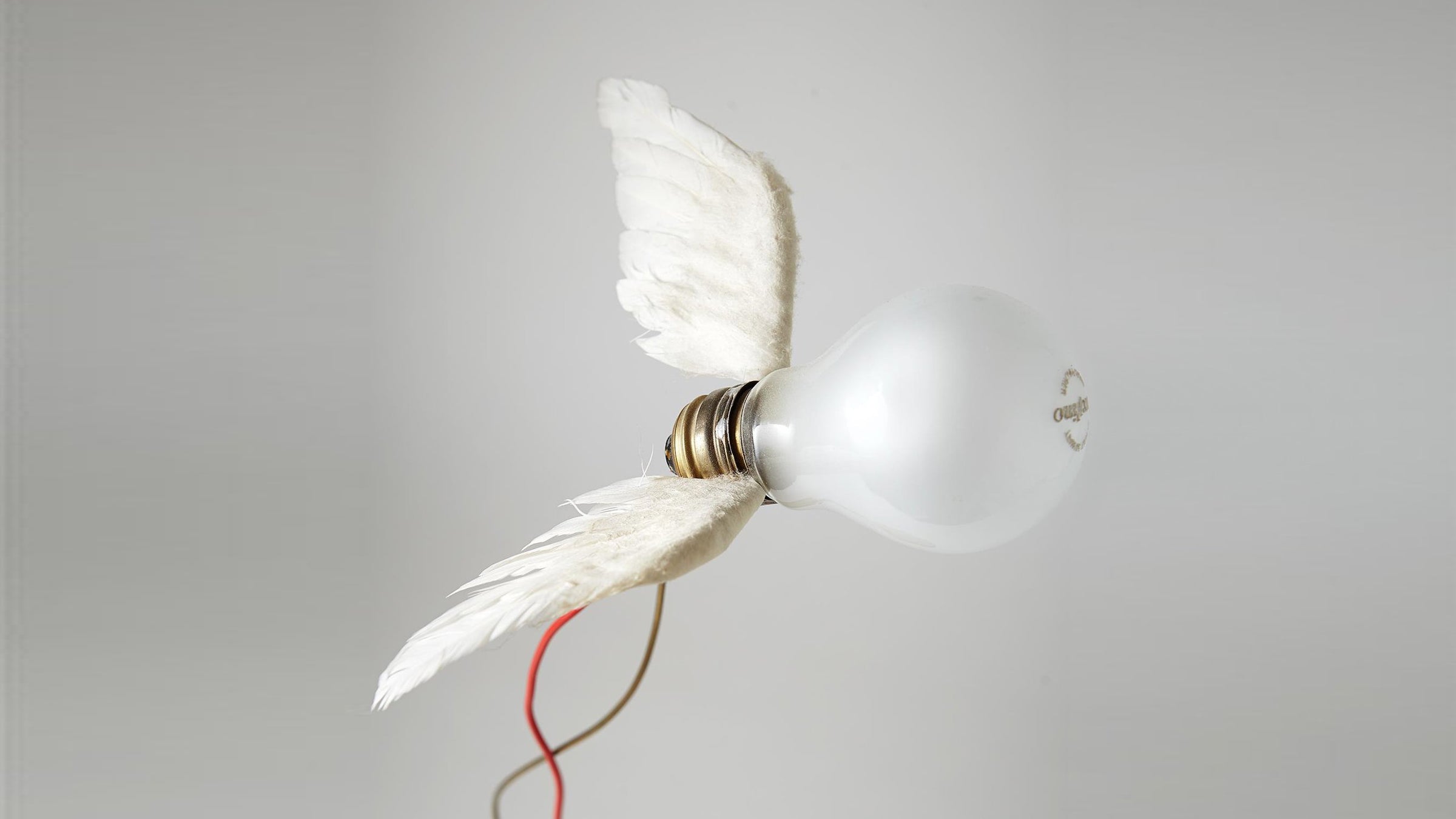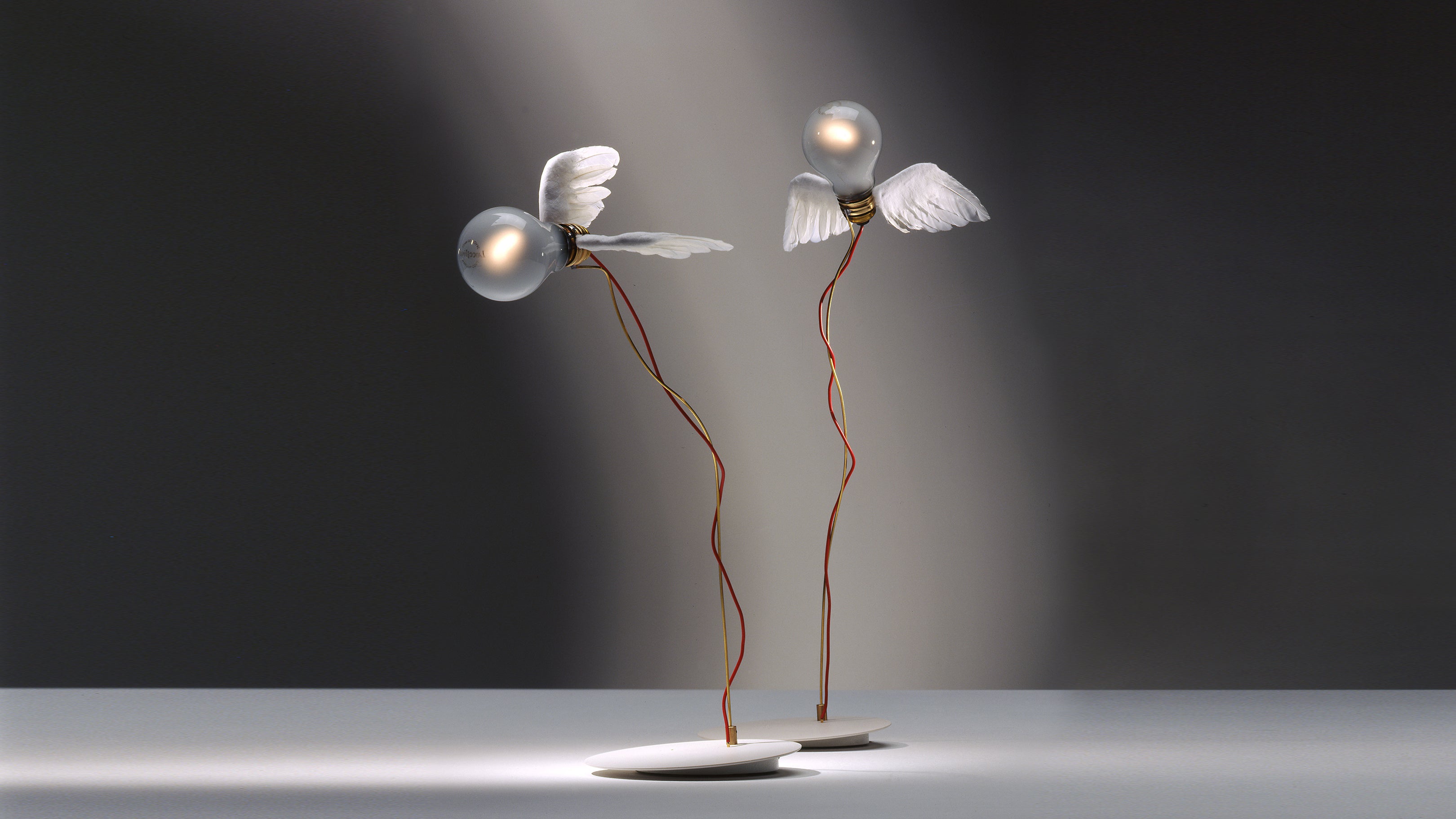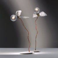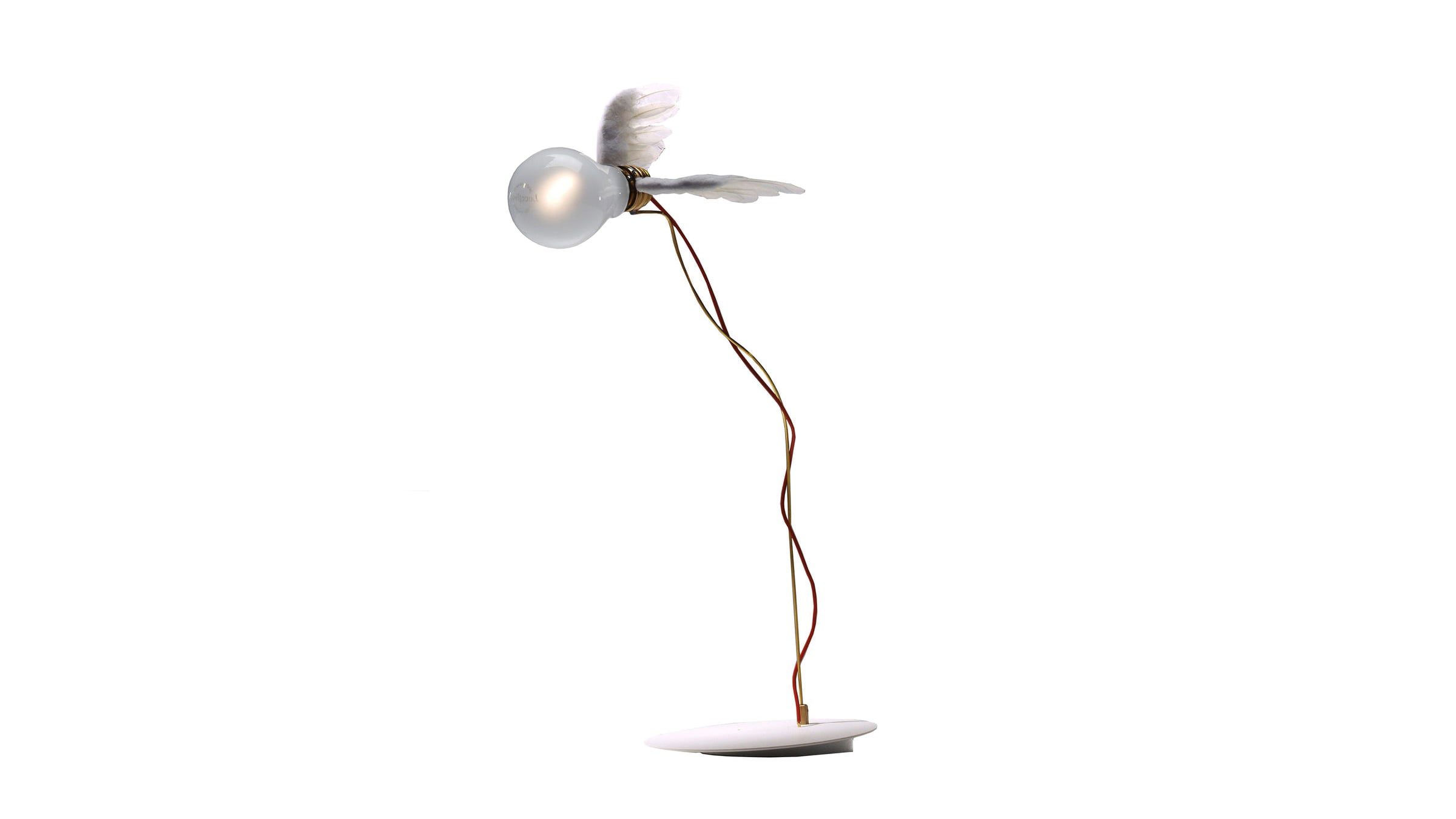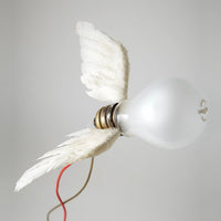 The light bulb is adorned with goose-feather wings and attached to a brass wire. At first glance, Lucellino LED seems to be nothing else but Ingo Maurer's well known trade mark Lucellino, presented in 1992. In redesigning Lucellino as a LED version, it was the designer's main goal to change it as little as possible, except for the light source.