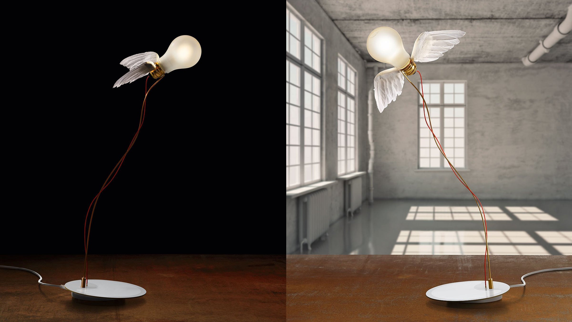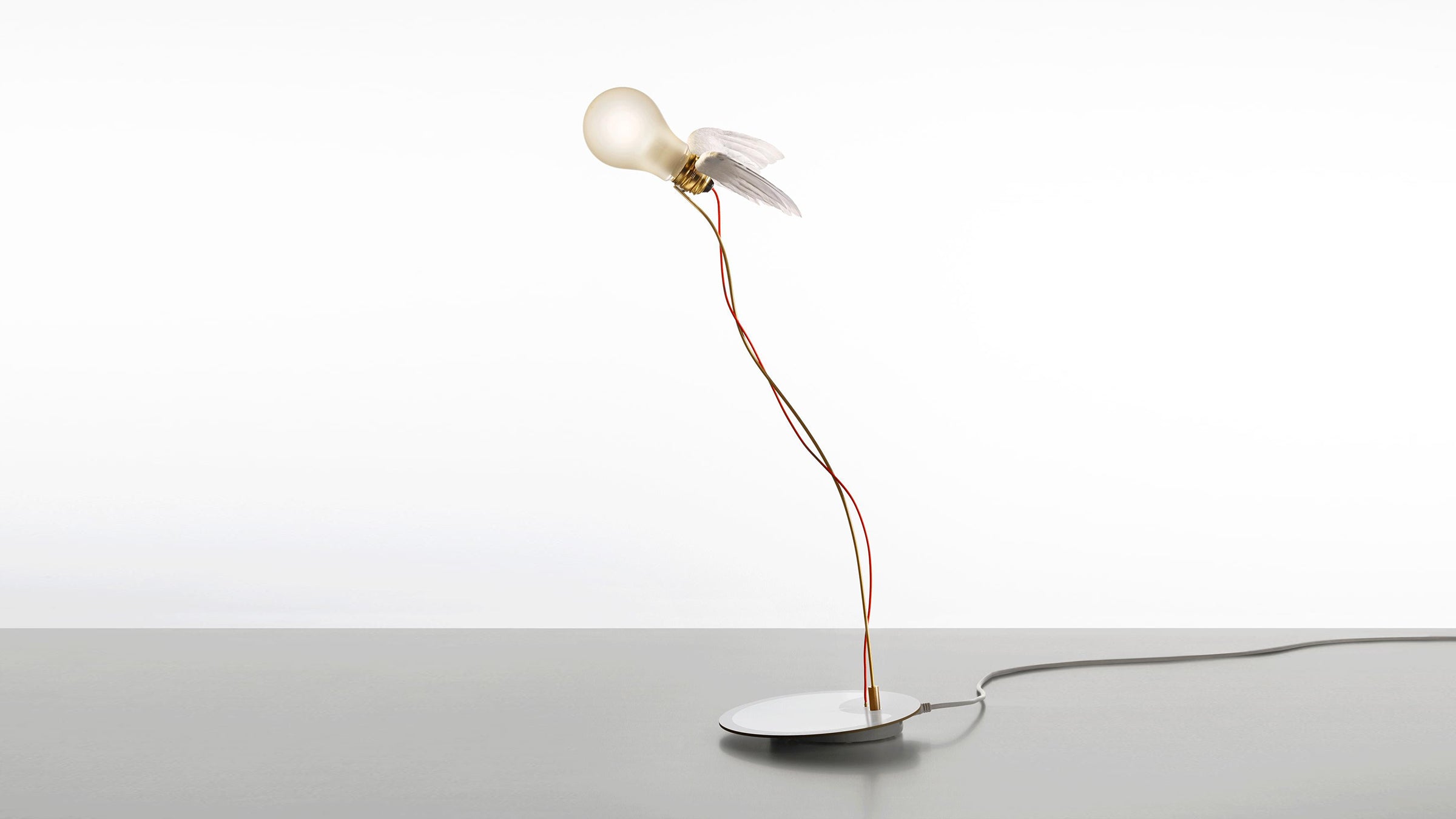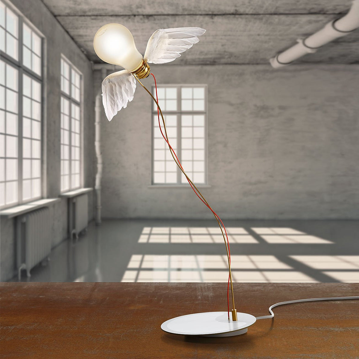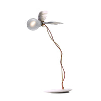 The light bulb is adorned with goose-feather wings and attached to a brass wire. At first glance, Lucellino LED seems to be nothing else but Ingo Maurer's well known trade mark Lucellino, presented in 1992. In redesigning Lucellino as a LED version, it was the designer's main goal to change it as little as possible, except for the light source.