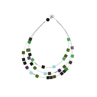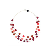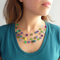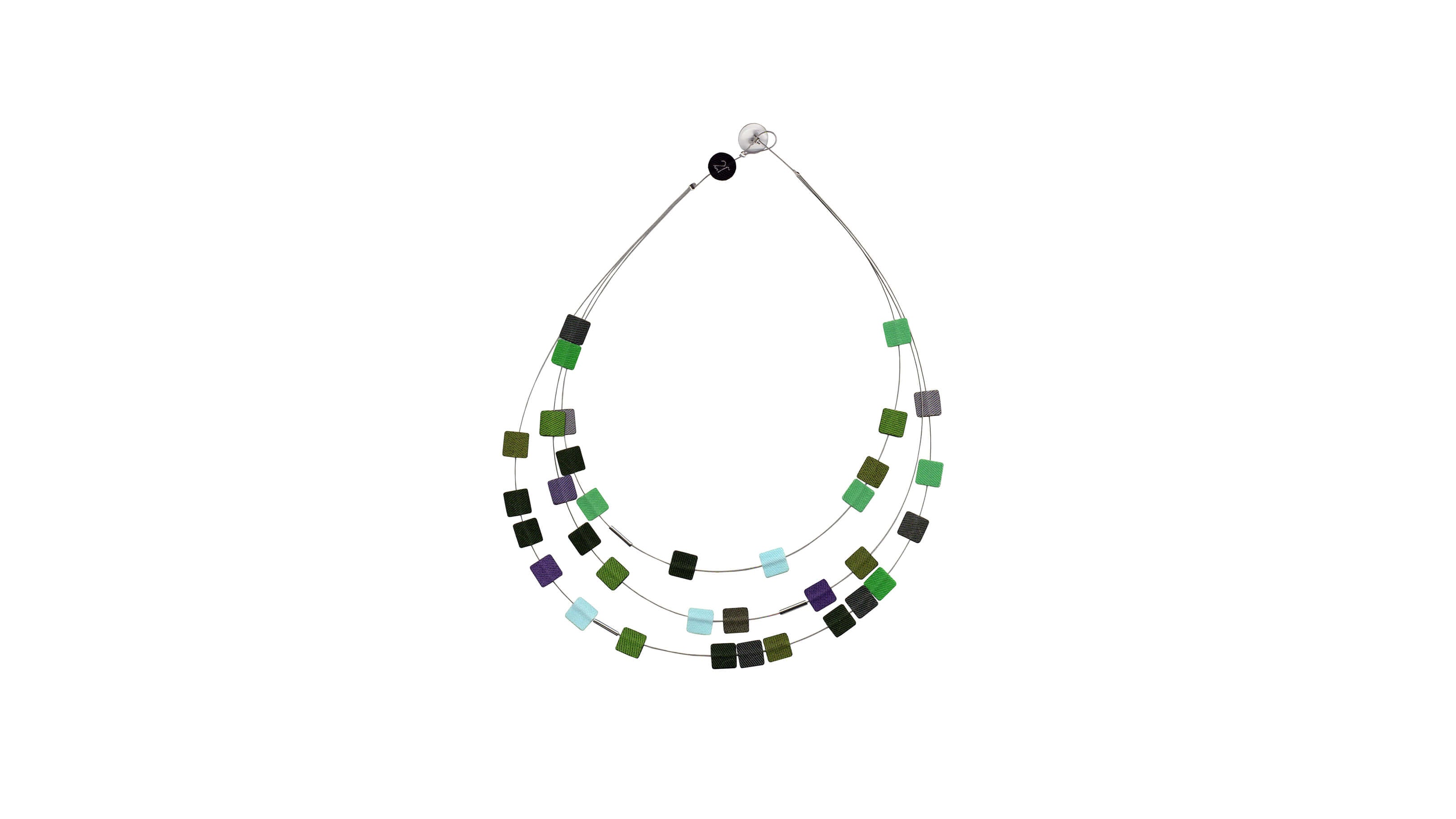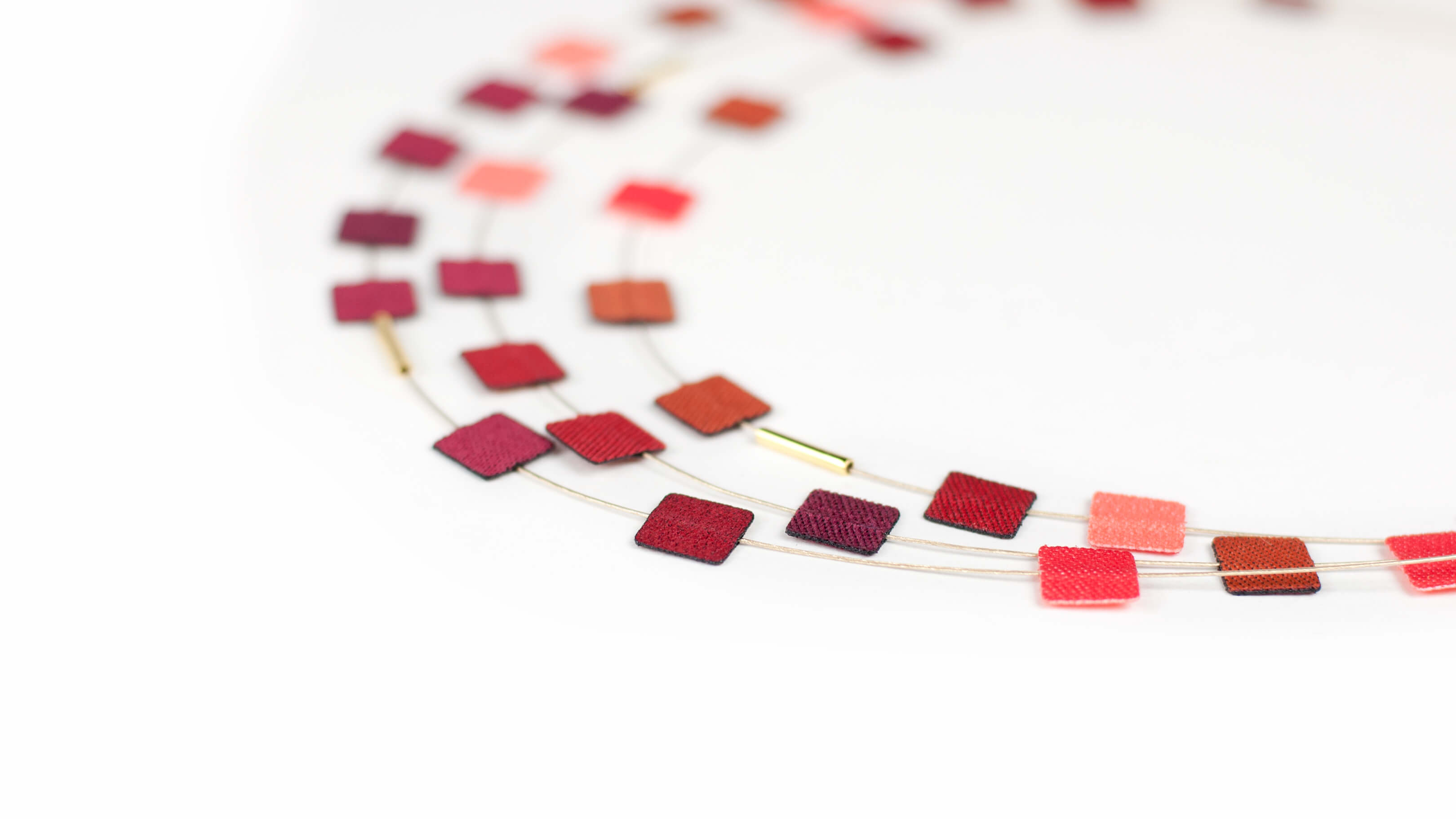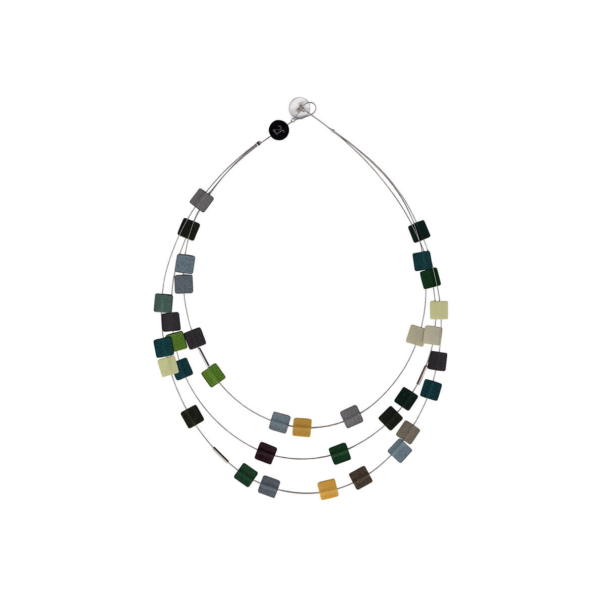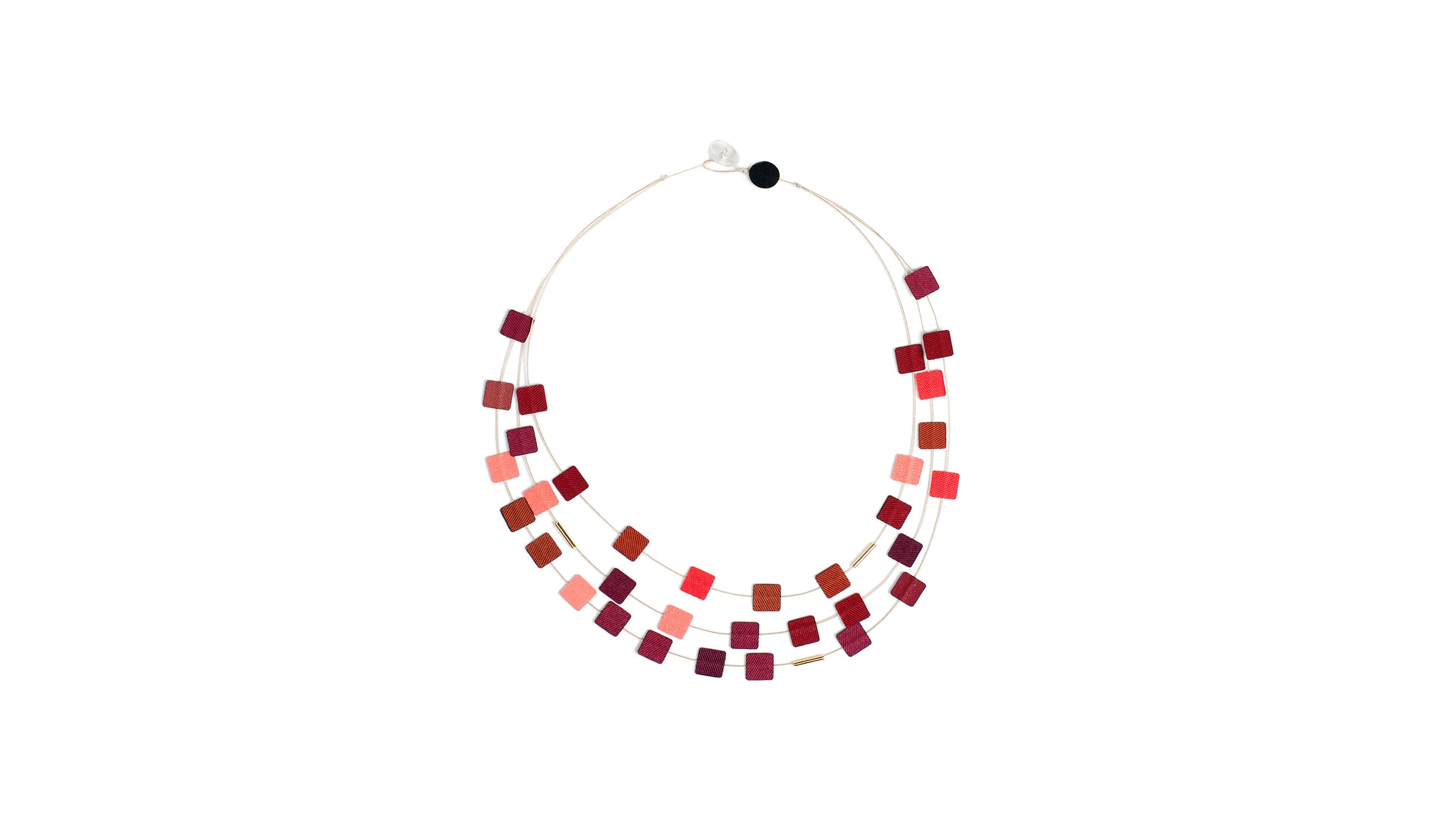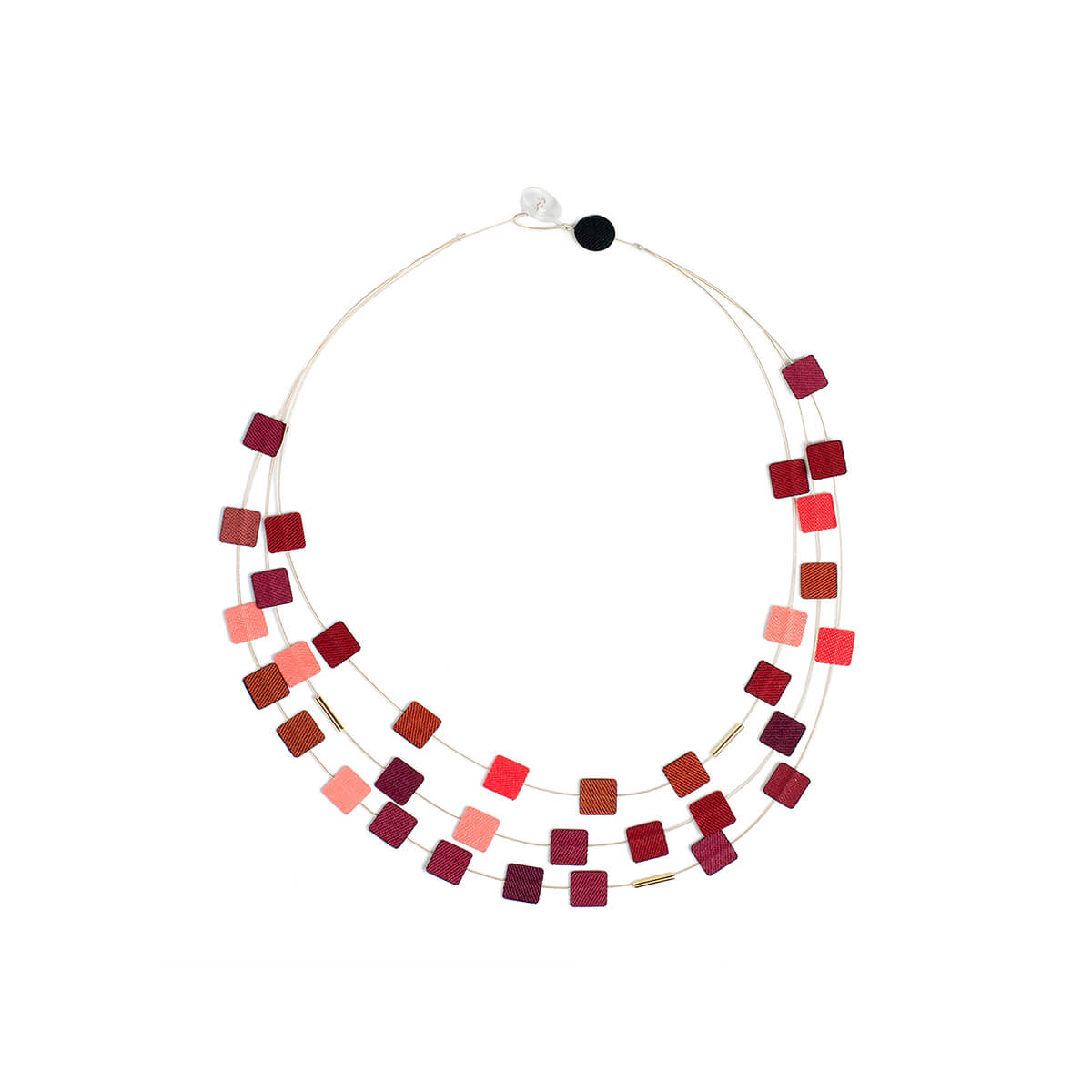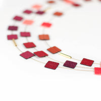 Secured on a sinuous wire, the fabric square pendants are arranged in a rhythmic fashion to create a playful and eye-catching piece of jewelry. When worn, these pendants dance in a joyful manner and create a point of interest on the wearer.