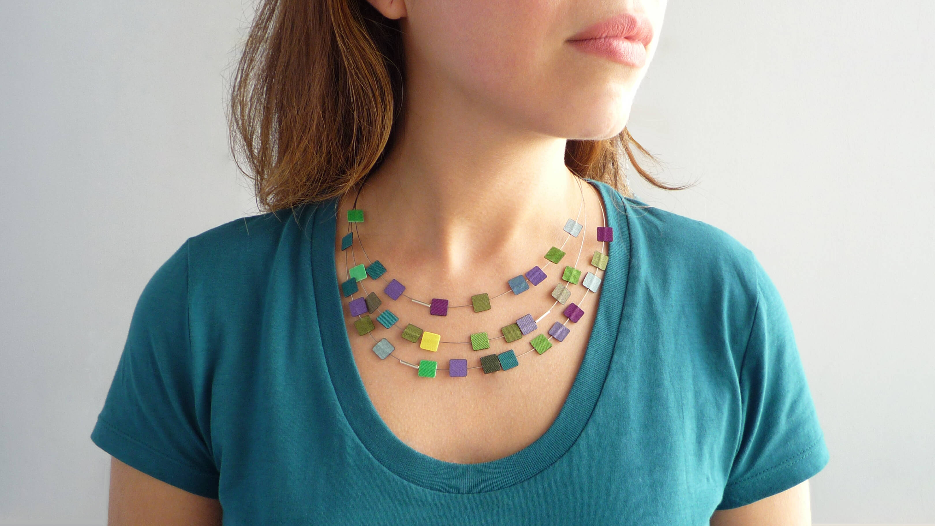 The dynamic jewelry of Uruguayan designer Diana Schimmel features rich color and texture that add interest and uniqueness to each piece. With her Ludo Short Necklace for Dos Riberas, materials are chosen that contrast with each other bringing attention to the necklace.