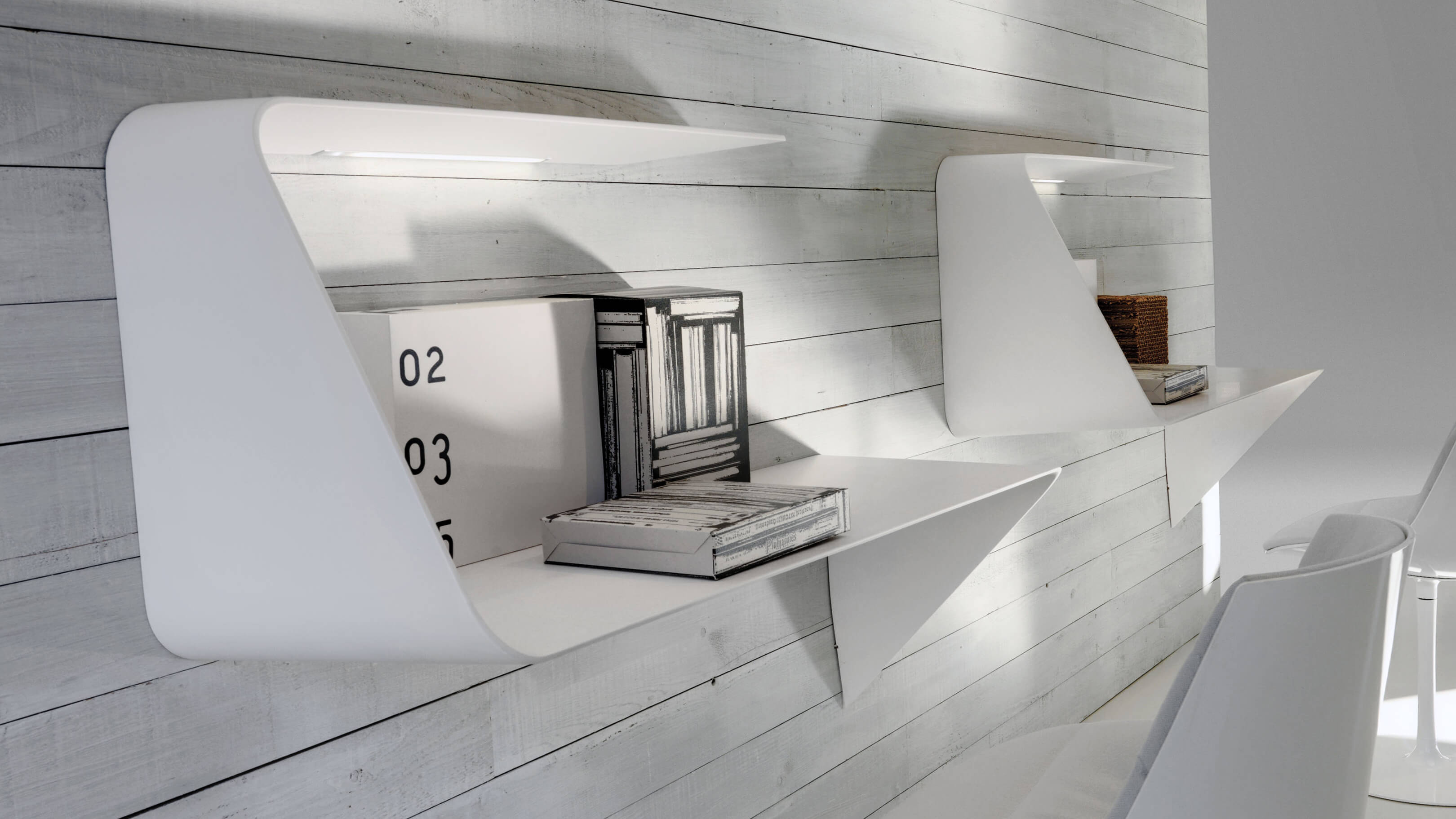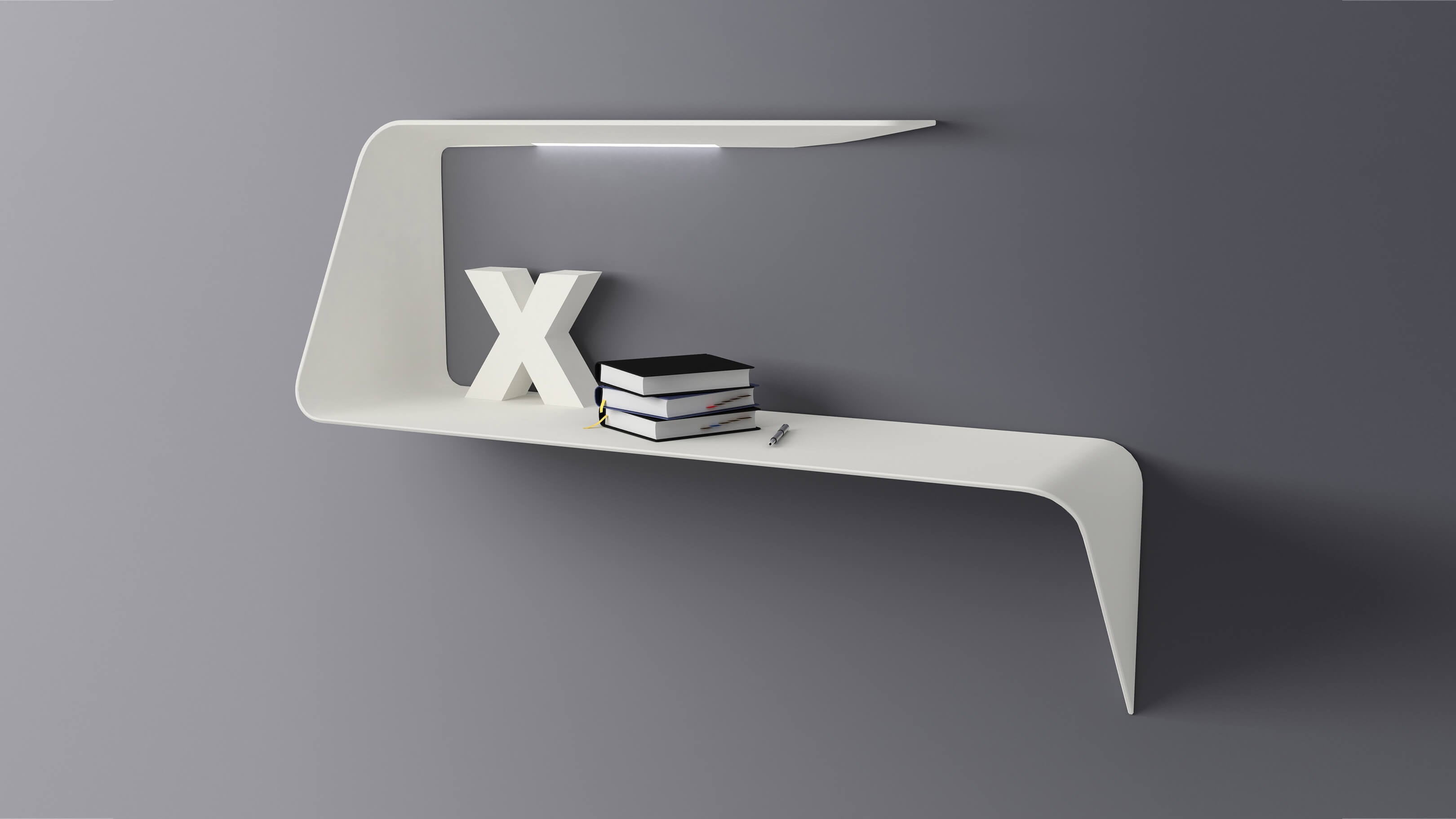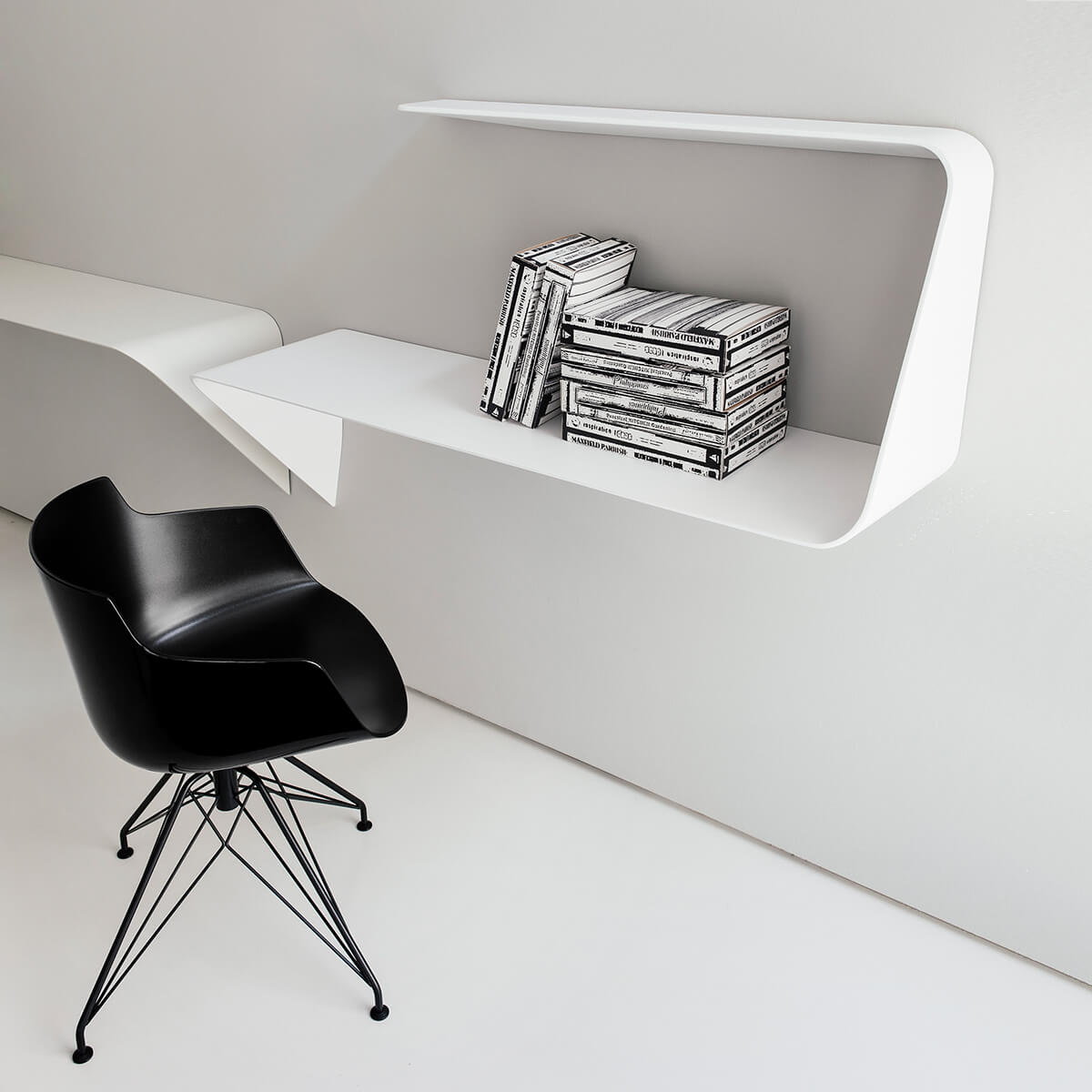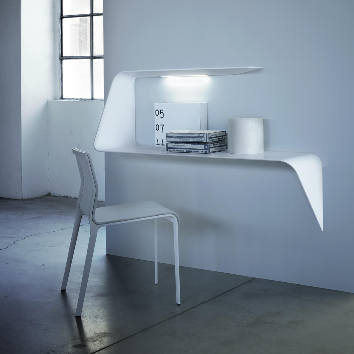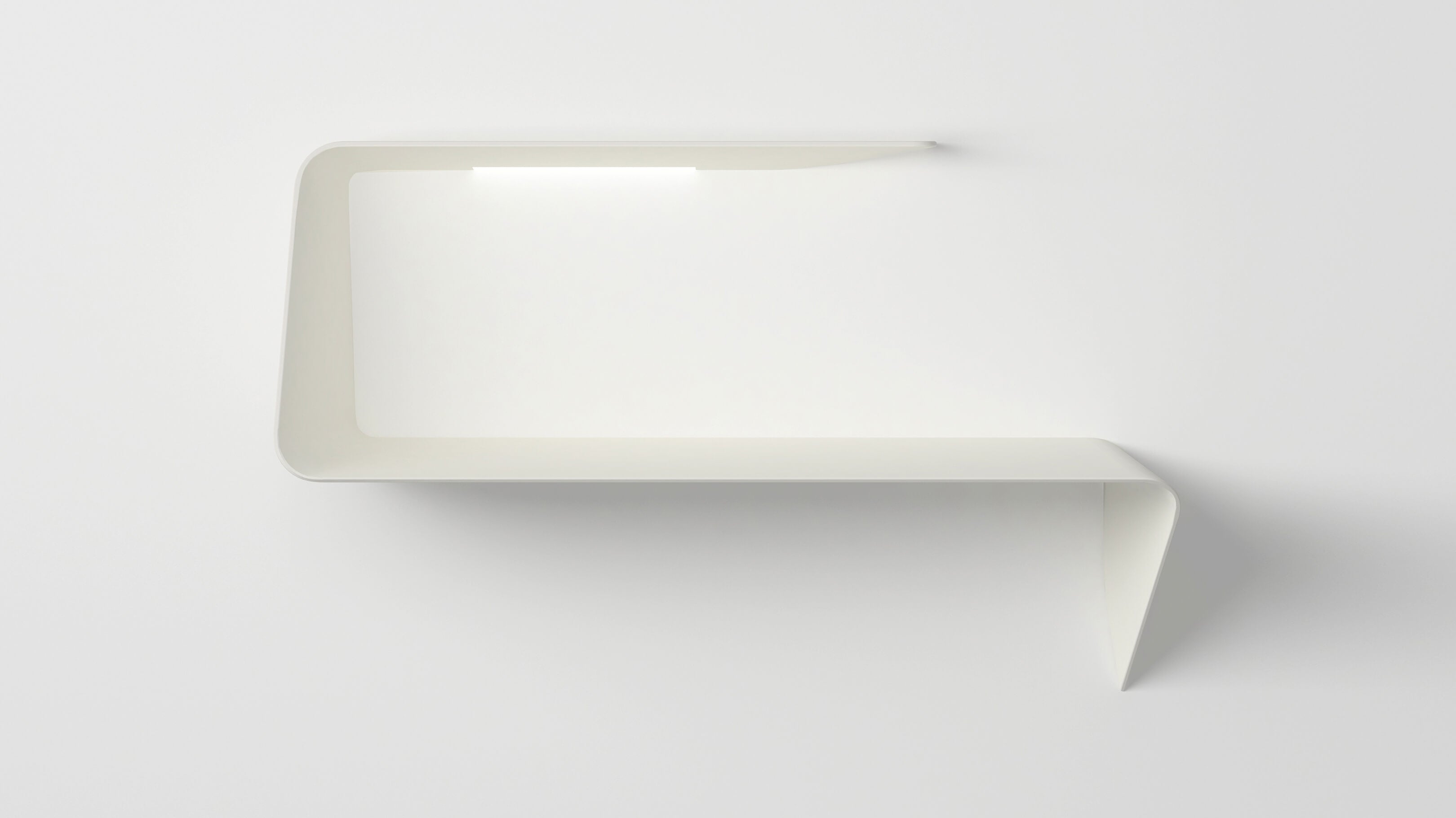 Resulting from a perfect combination of shape, function, and material, Victor Vasilev's Mamba Shelf serves a wall-mounted desk.