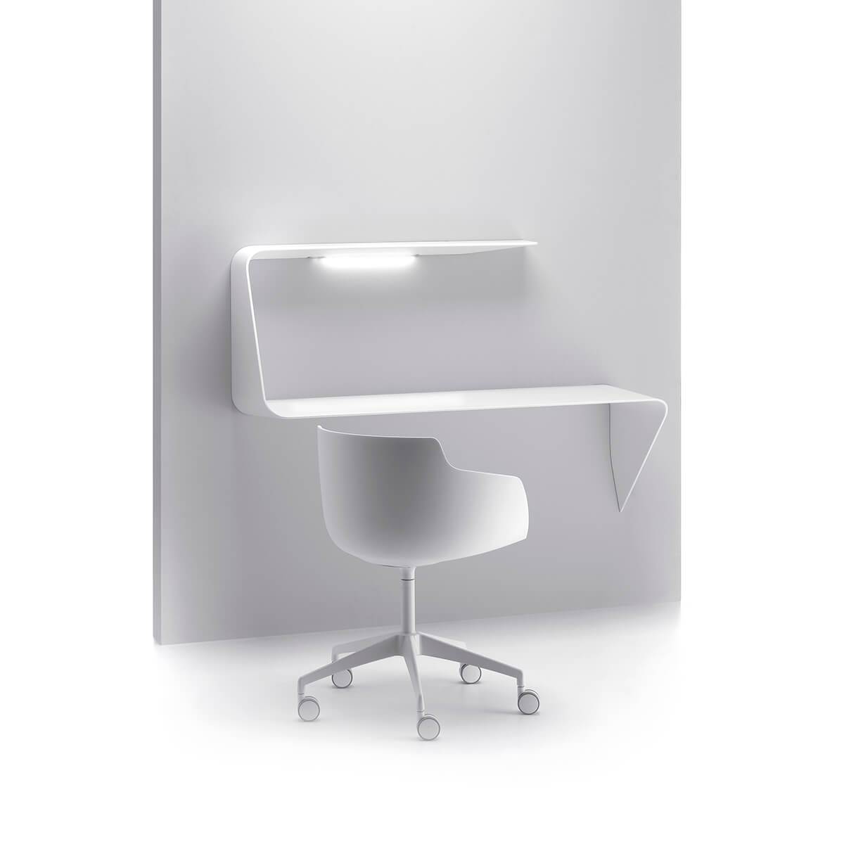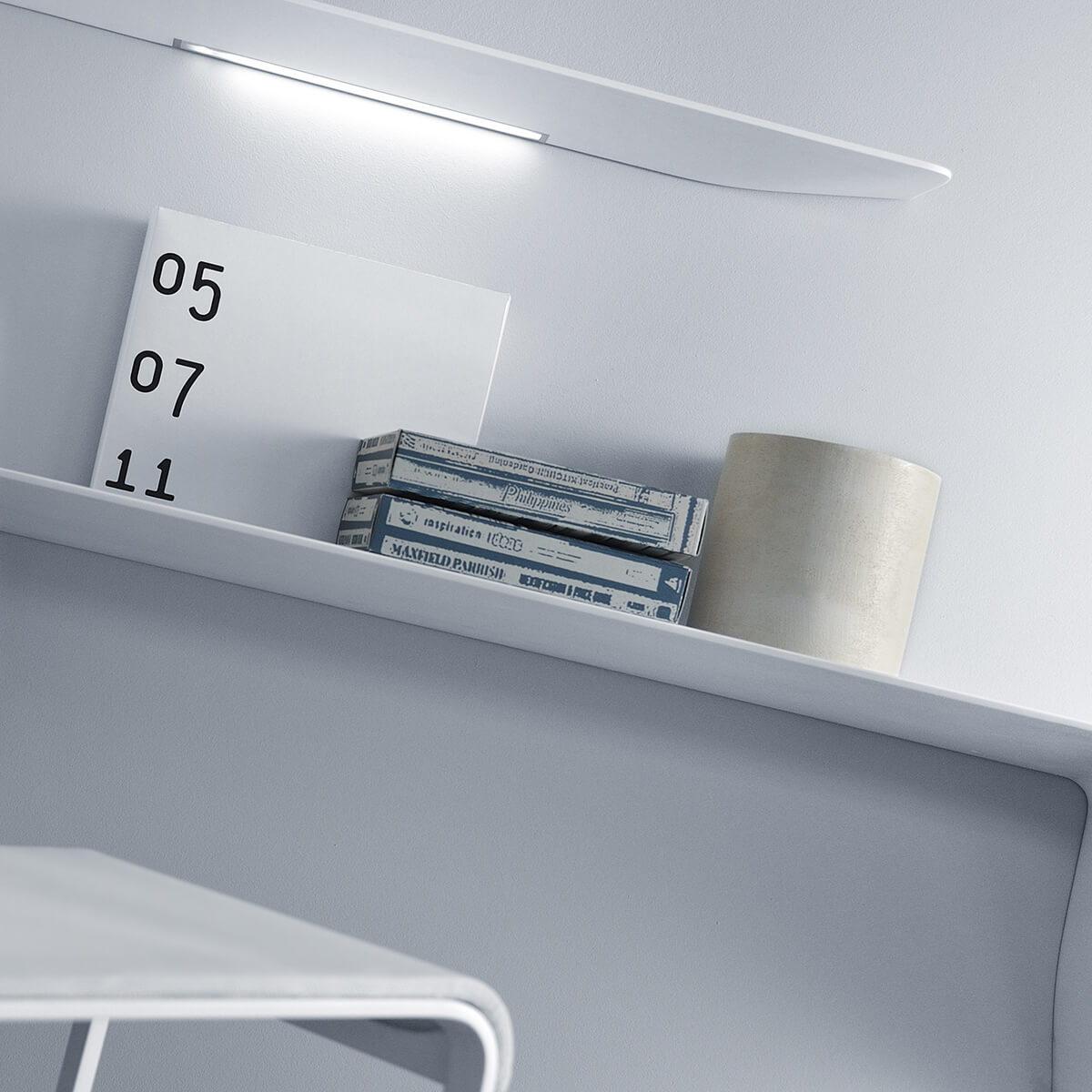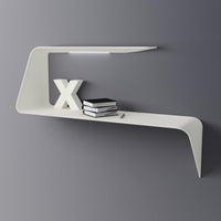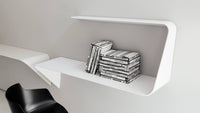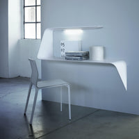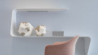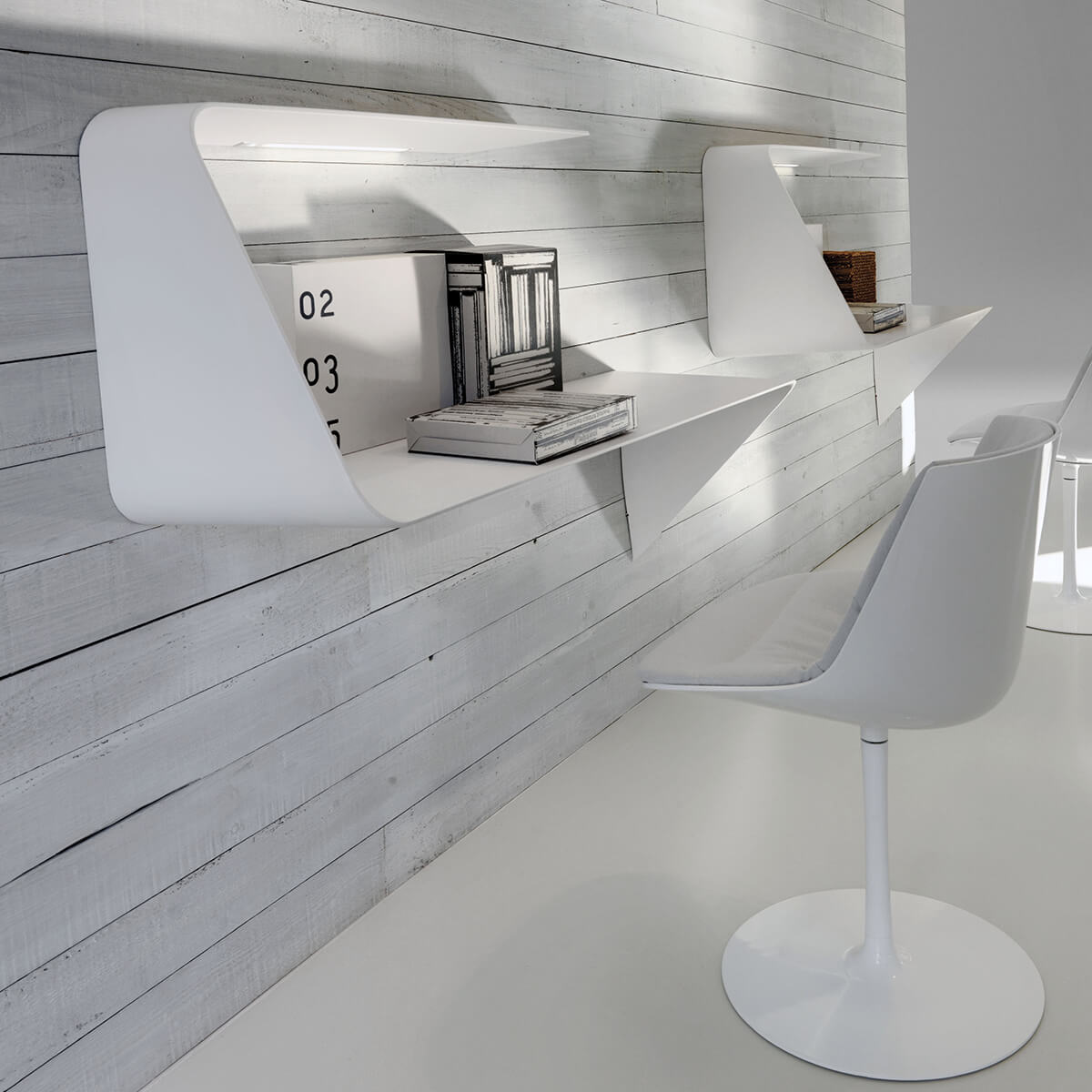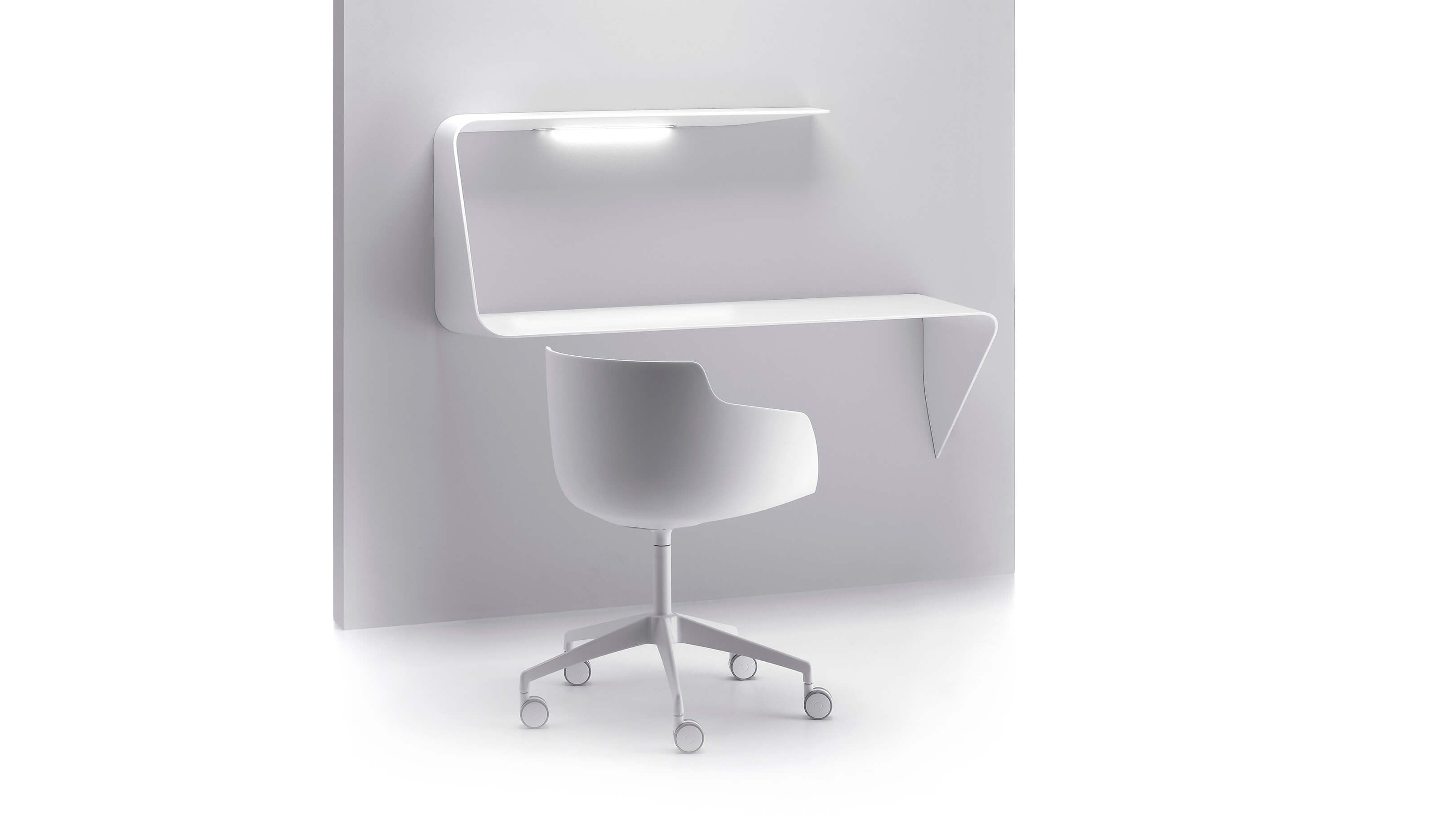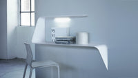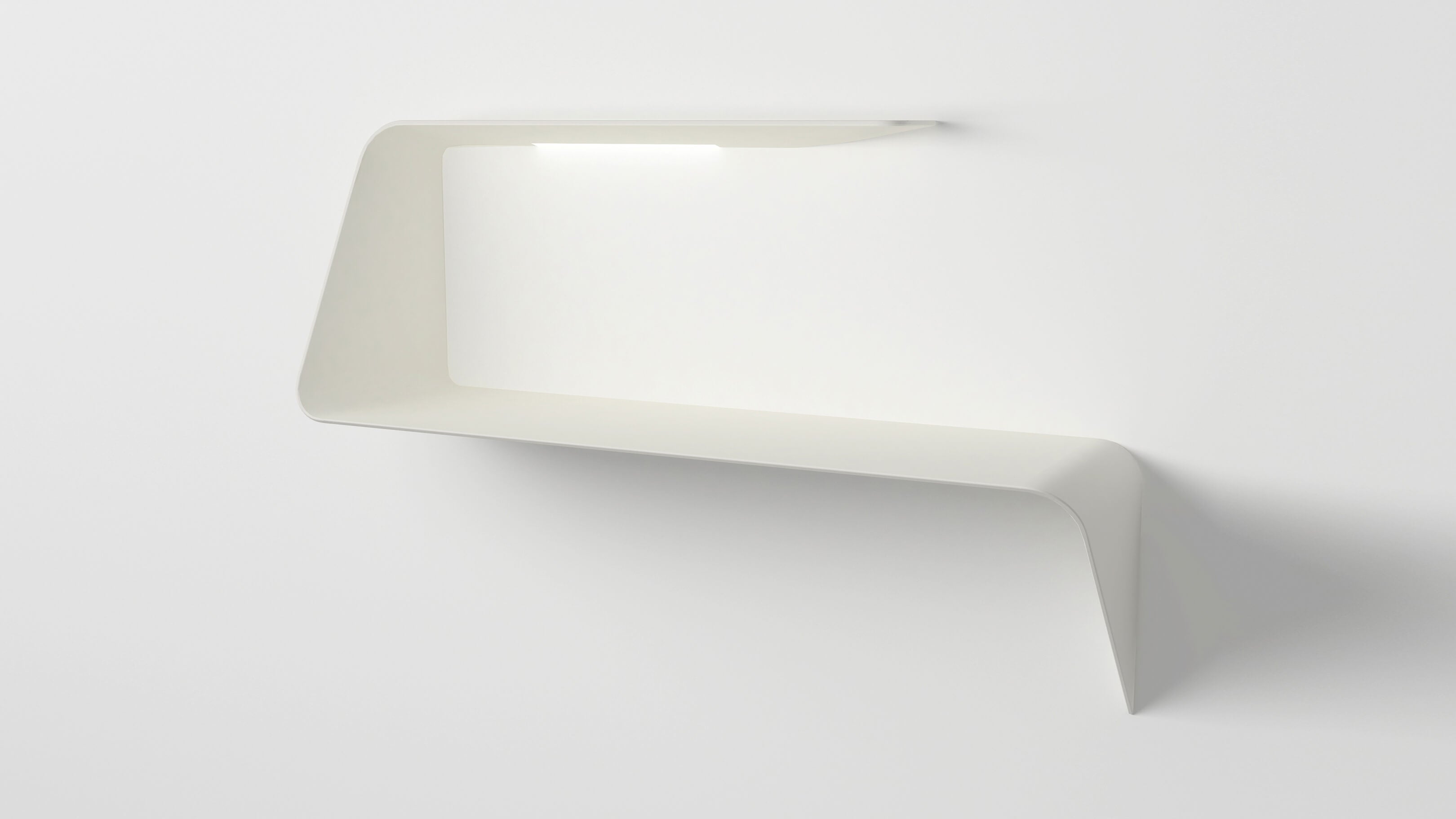 Resulting from a perfect combination of shape, function, and material, Victor Vasilev's Mamba Shelf serves a wall-mounted desk.