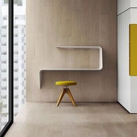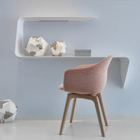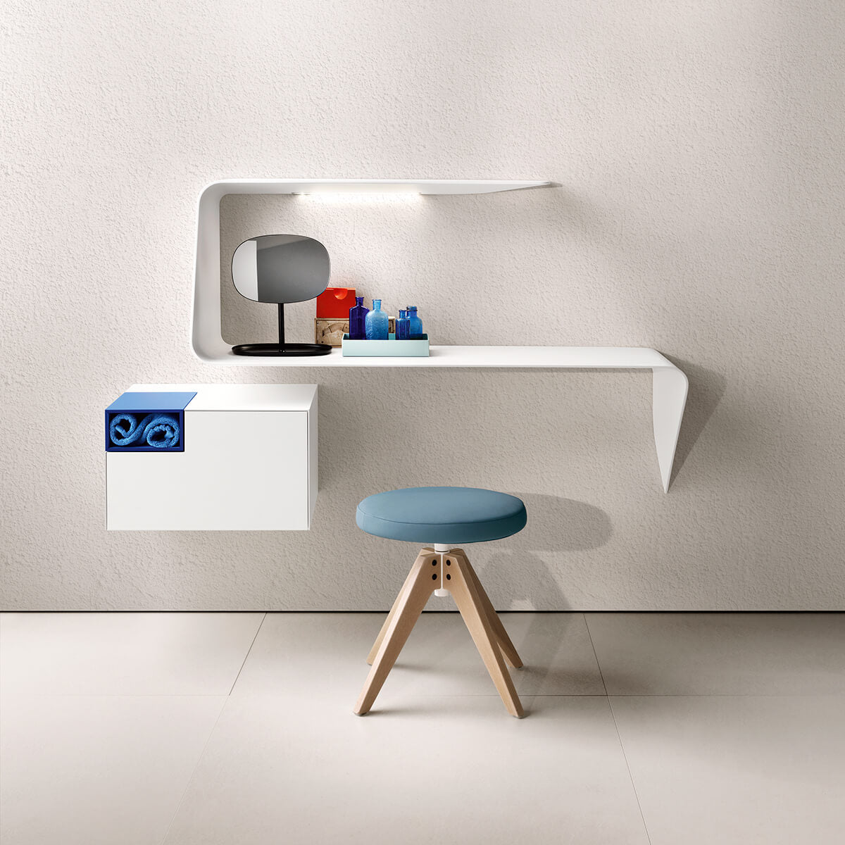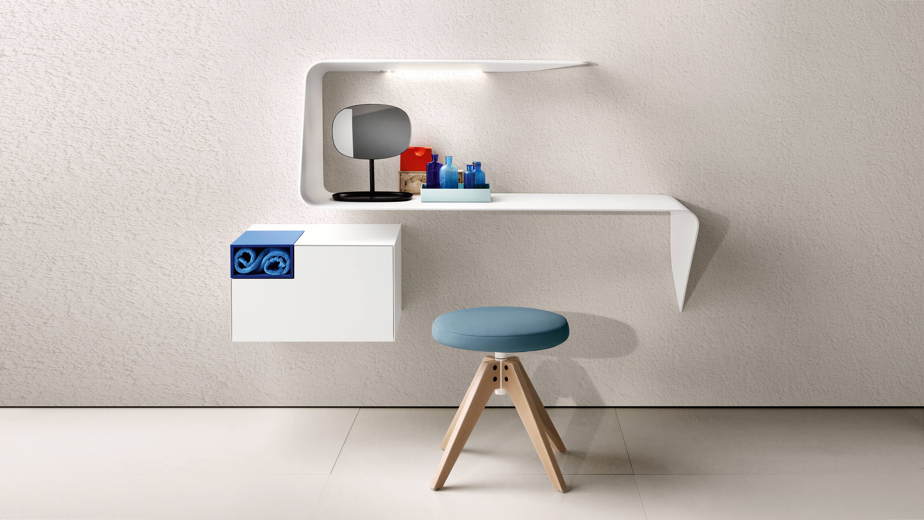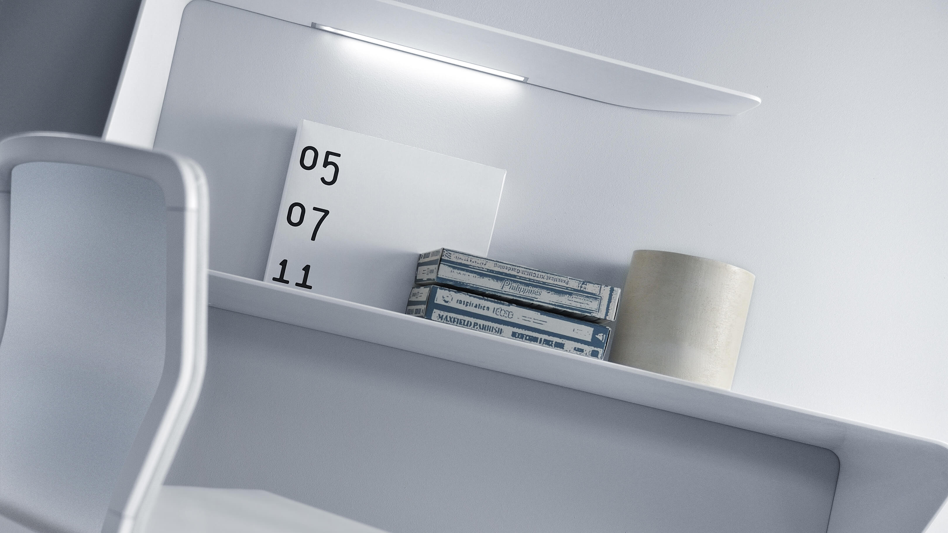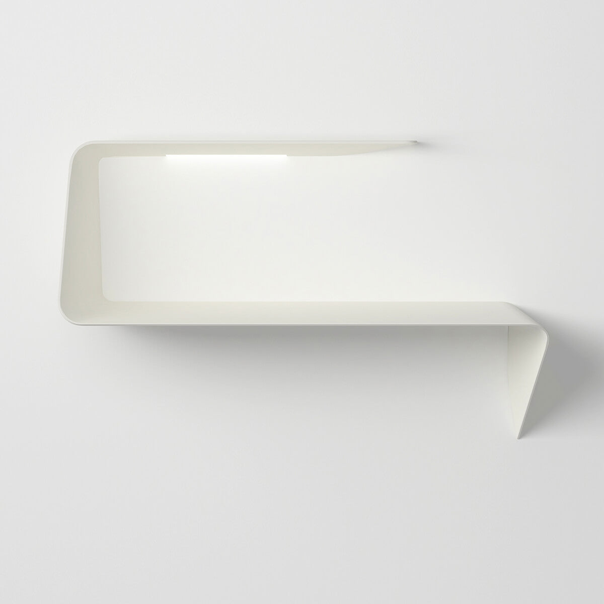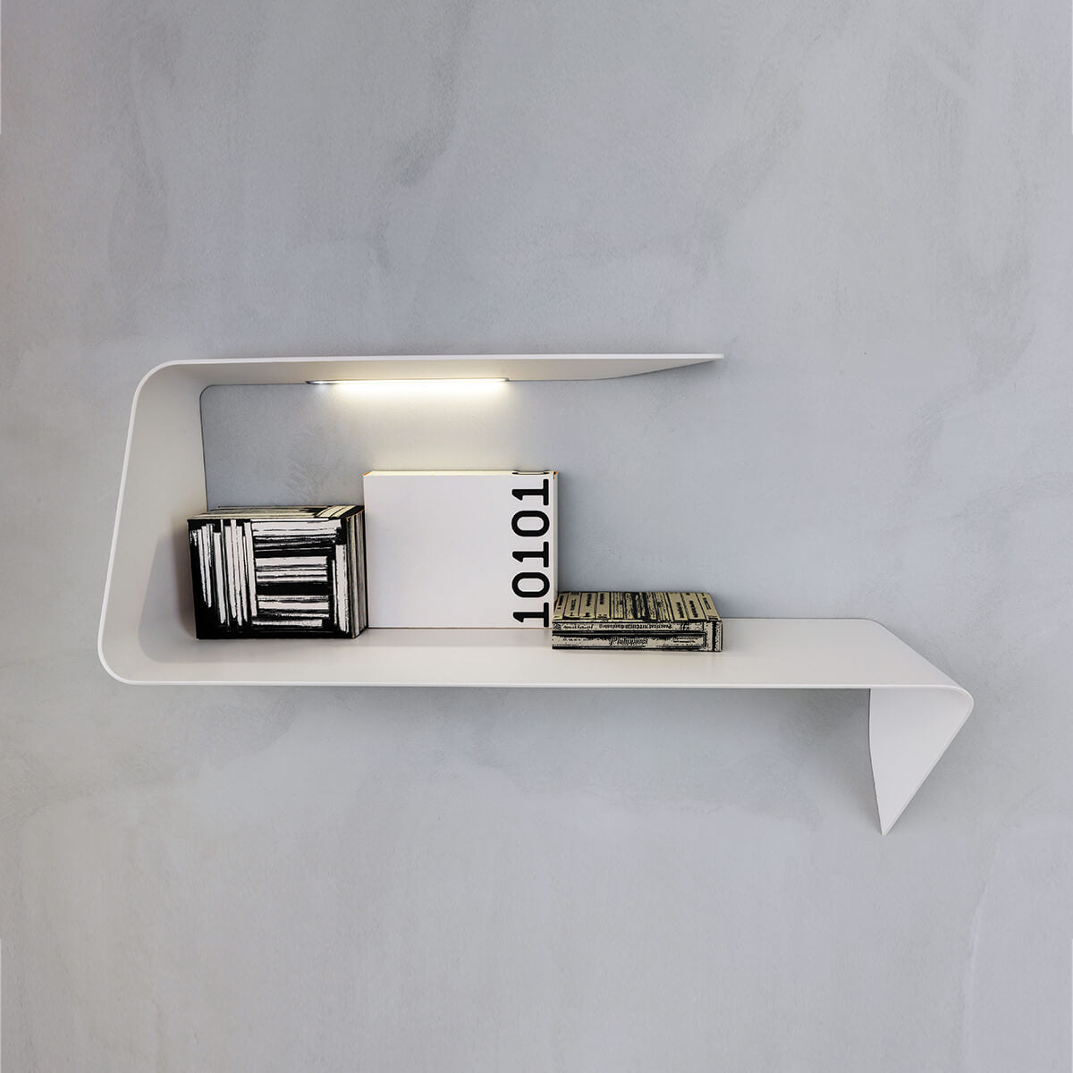 Resulting from a perfect combination of shape, function, and material, Victor Vasilev's Mamba Shelf serves a wall-mounted desk.