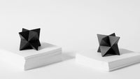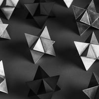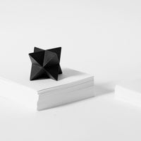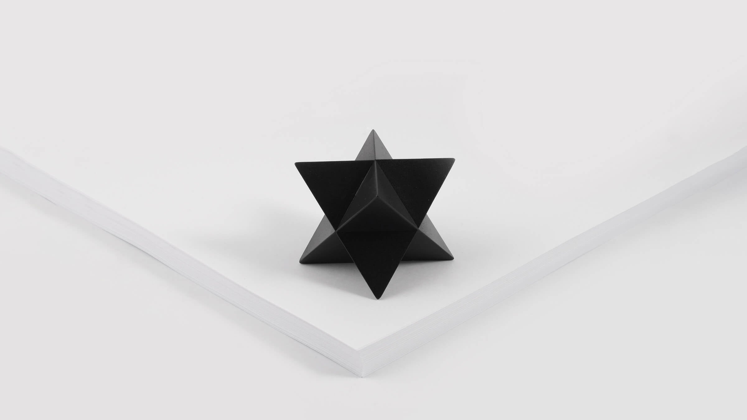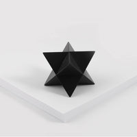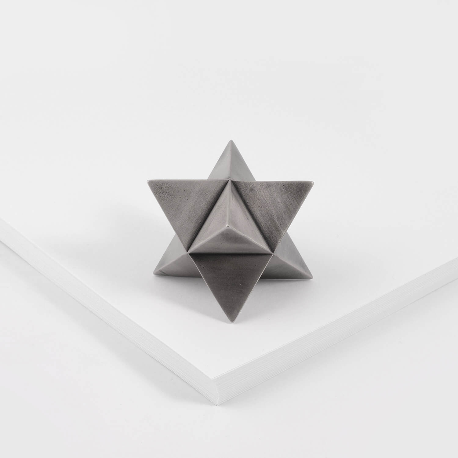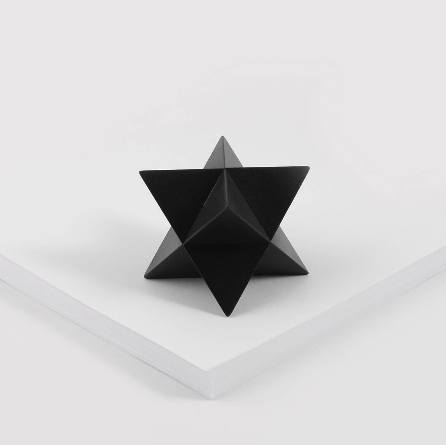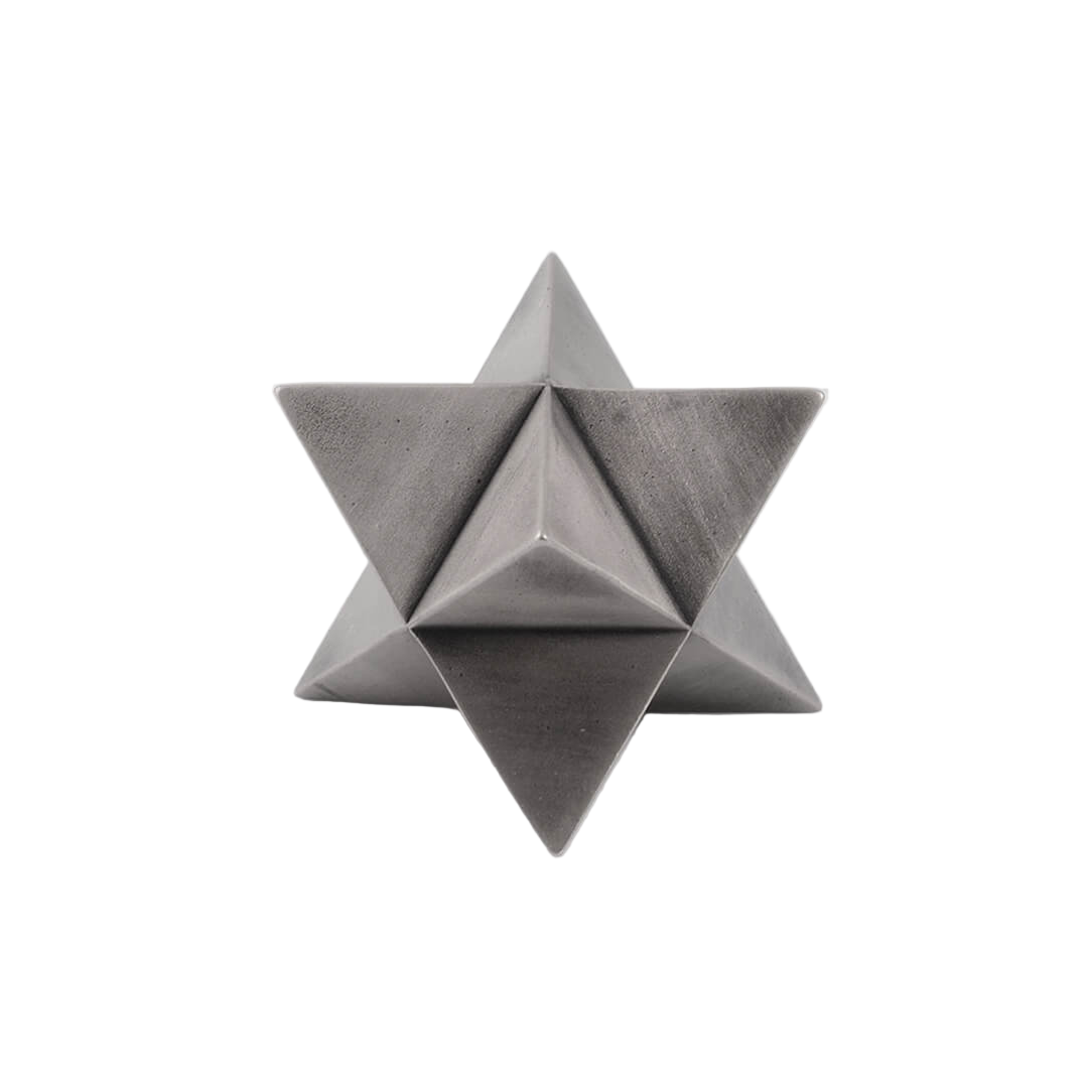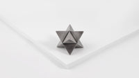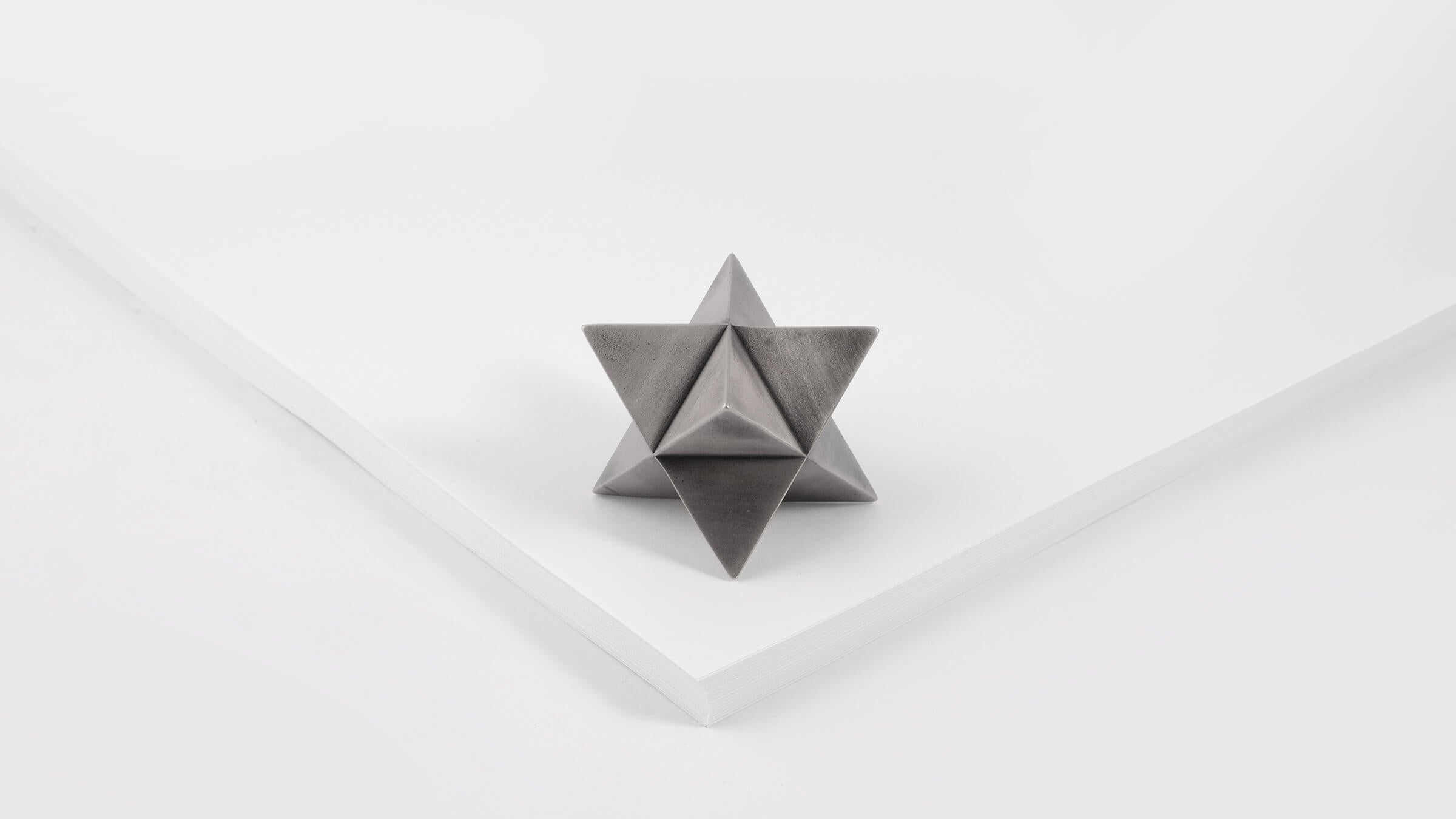 The abstract symbol of a merkaba, crafted into a solid object. One triangular pyramid, a tetrahedron, is immersed into another, symbolizing two poles of creation, matter and spirit. The shape which is thus formed is a star tetrahedron. Made out of solid metal, with a hand polished finish.