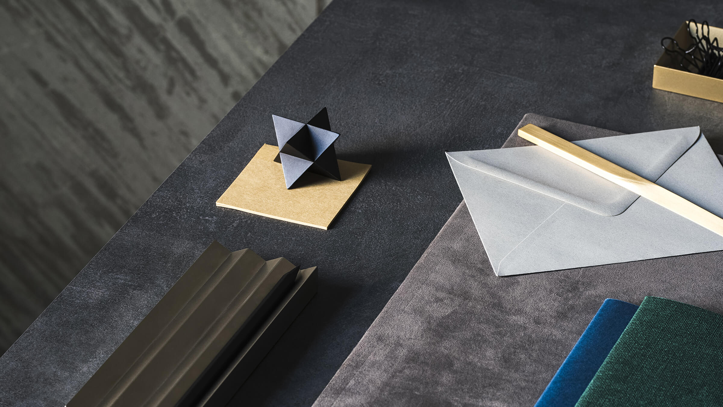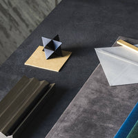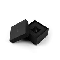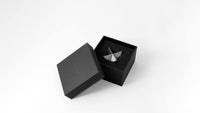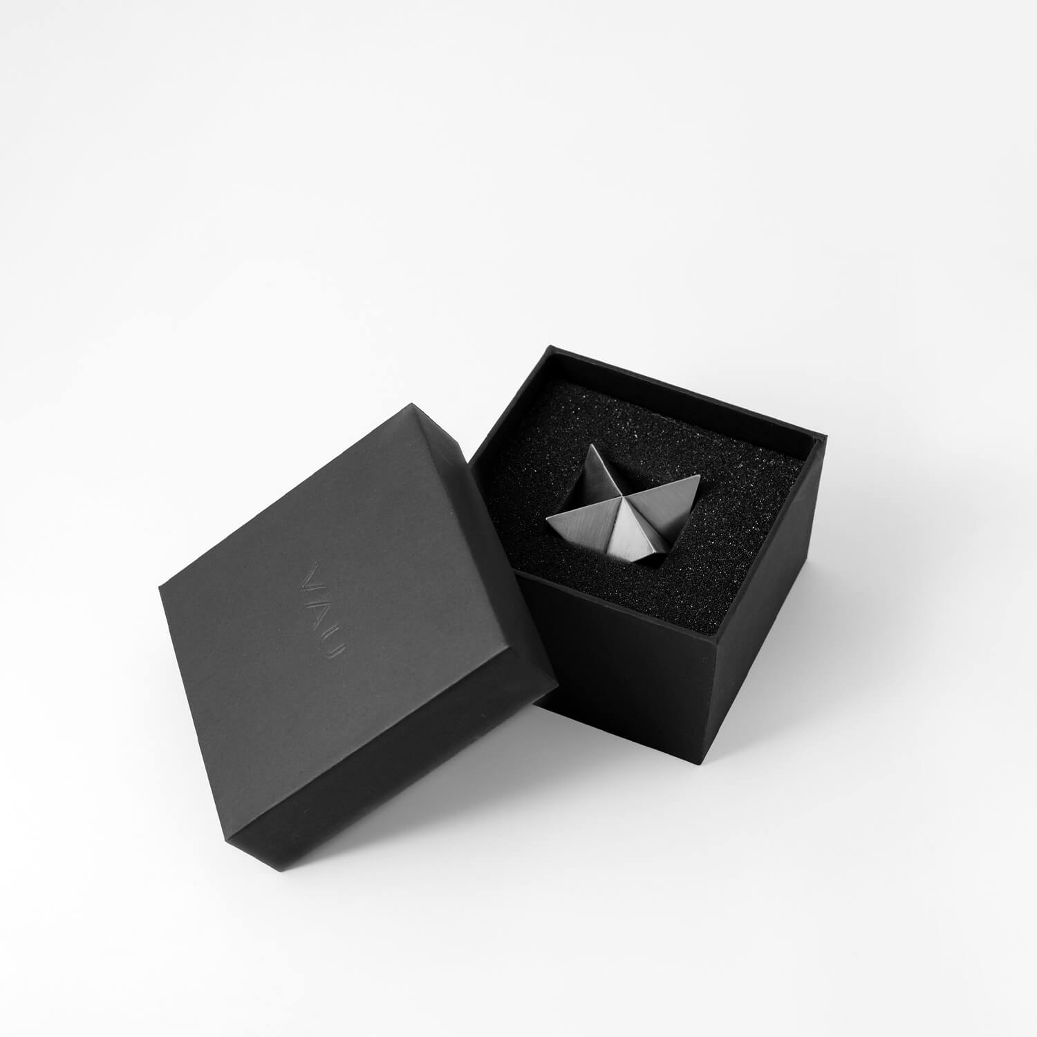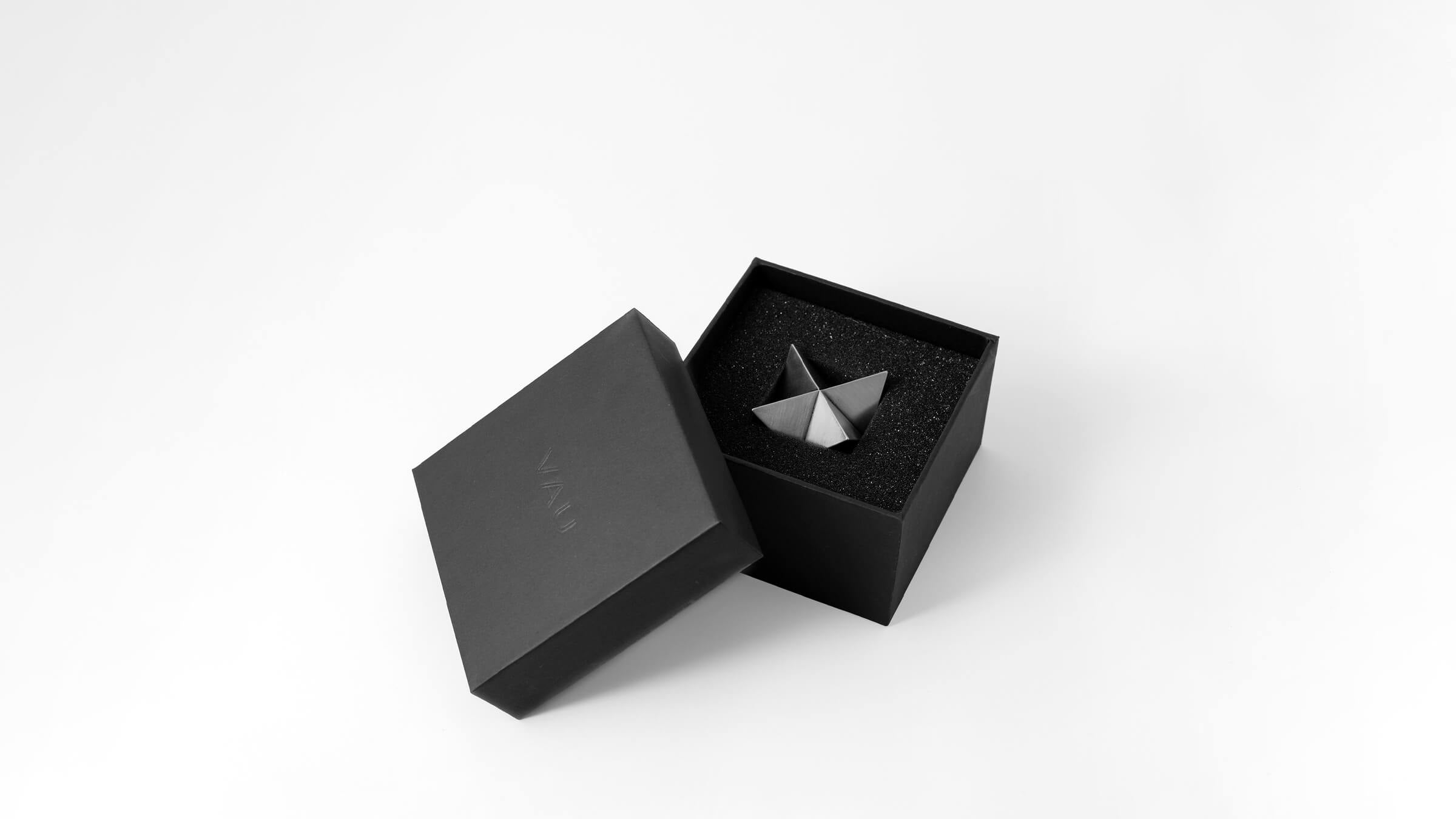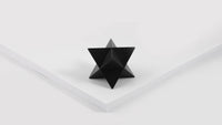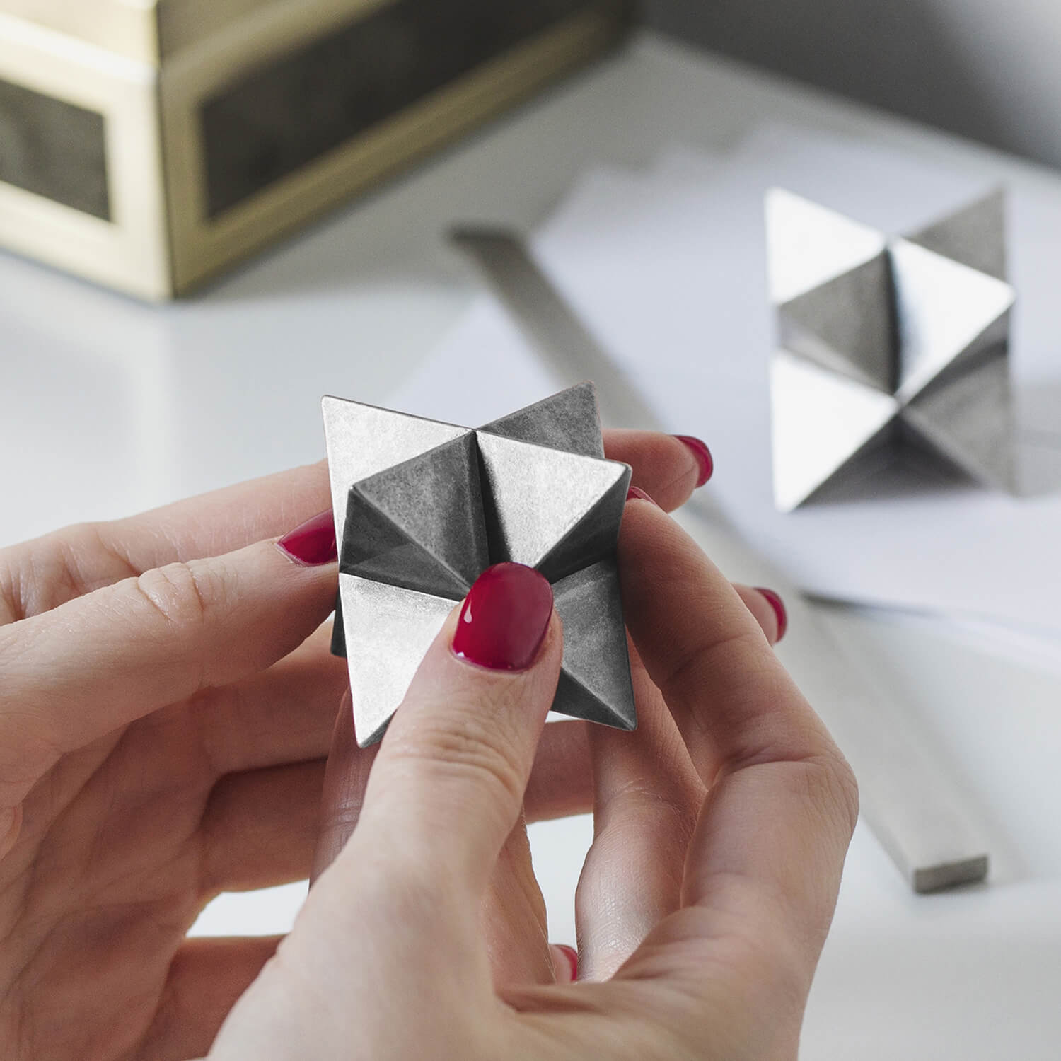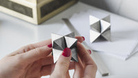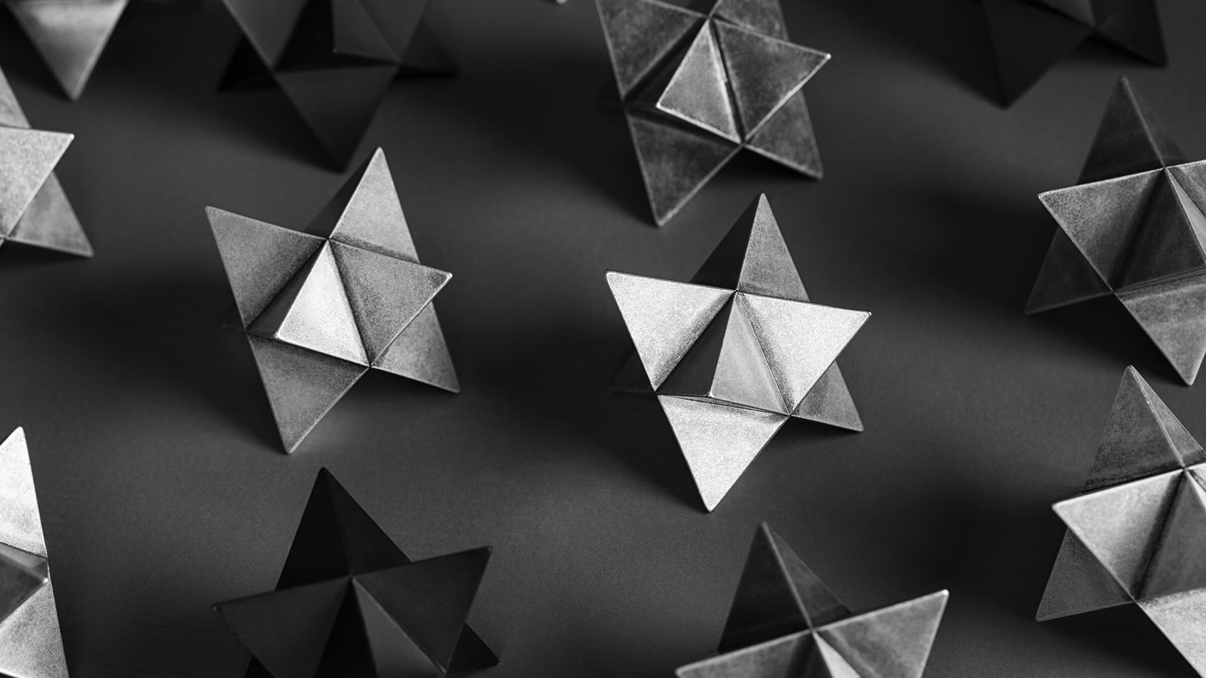 The abstract symbol of a merkaba, crafted into a solid object. One triangular pyramid, a tetrahedron, is immersed into another, symbolizing two poles of creation, matter and spirit. The shape which is thus formed is a star tetrahedron. Made out of solid metal, with a hand polished finish.