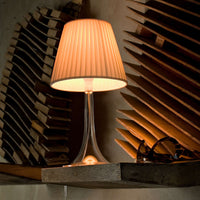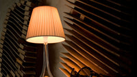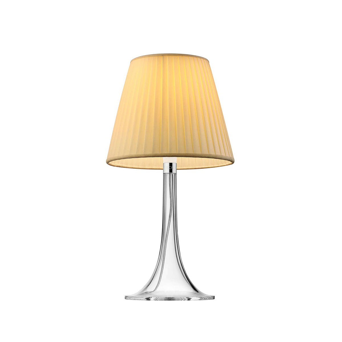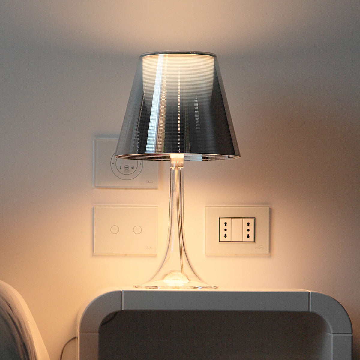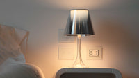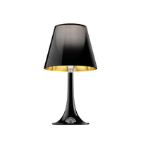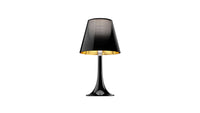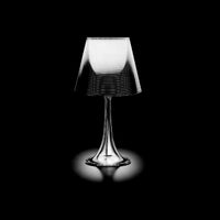 Proving to be one of the most successful lamps in the Flos collection, Philippe Starck’s Miss K table lamp is built on the designer’s ability to translate his insight on social and cultural changes into an object that balances form and function with added wit and character. Manufactured in transparent injection molded polycarbonate, the Miss K table lamp has a clear base and stem with an external aluminized shade which emits a warm light. When unlit, the polycarbonate lampshade shows subtle detail with a dark metallic tint. When lit, the table lamp appears almost like an x-ray, with the bulb starkly visible behind the now-clear illuminated shade. The fluid pedestal base of the table lamp is clear at all times.