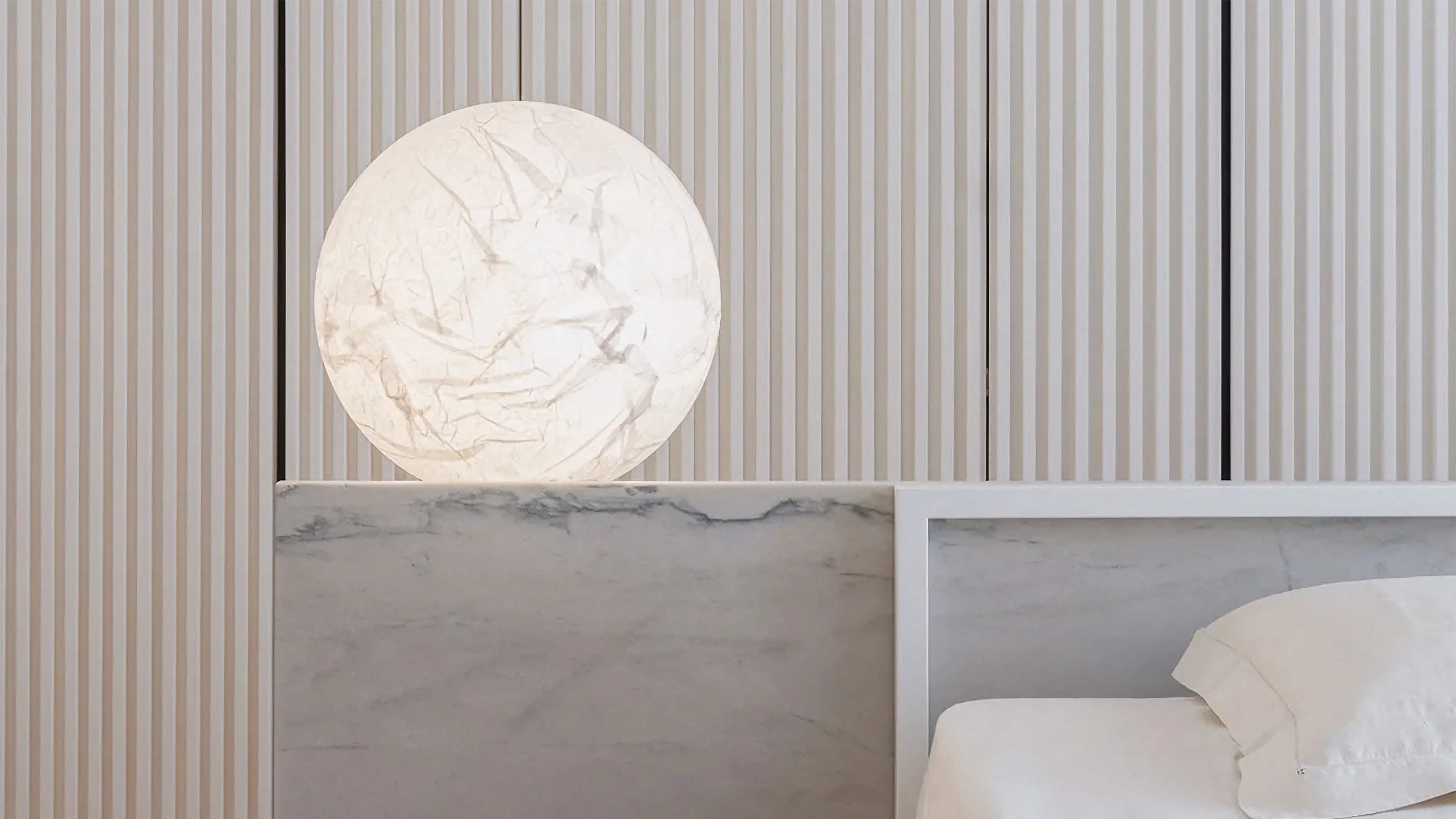A dream brought to life. Davide Groppi uses the poetry of reduction and the magic of lighting to realize a dream he had: to bring the moon into the home. In his Moon T Table Lamp, the Italian designer captures the essence of the moon in the night sky, creating a poetic meditation on the glowing orb hovering above. The pure, spherical lamp uses Japanese rice paper as a means to create the textural appearance of the surface of the moon. This materiality provides shadows and highlights, giving richness and depth to the minimal light. The paper also acts as a diffuser, radiating a warm glow for a dramatic presence in the home. A showcase of artistic metaphors, the Moon T Table Lamp is a striking way to bring the surreal beauty of the moon into the home.