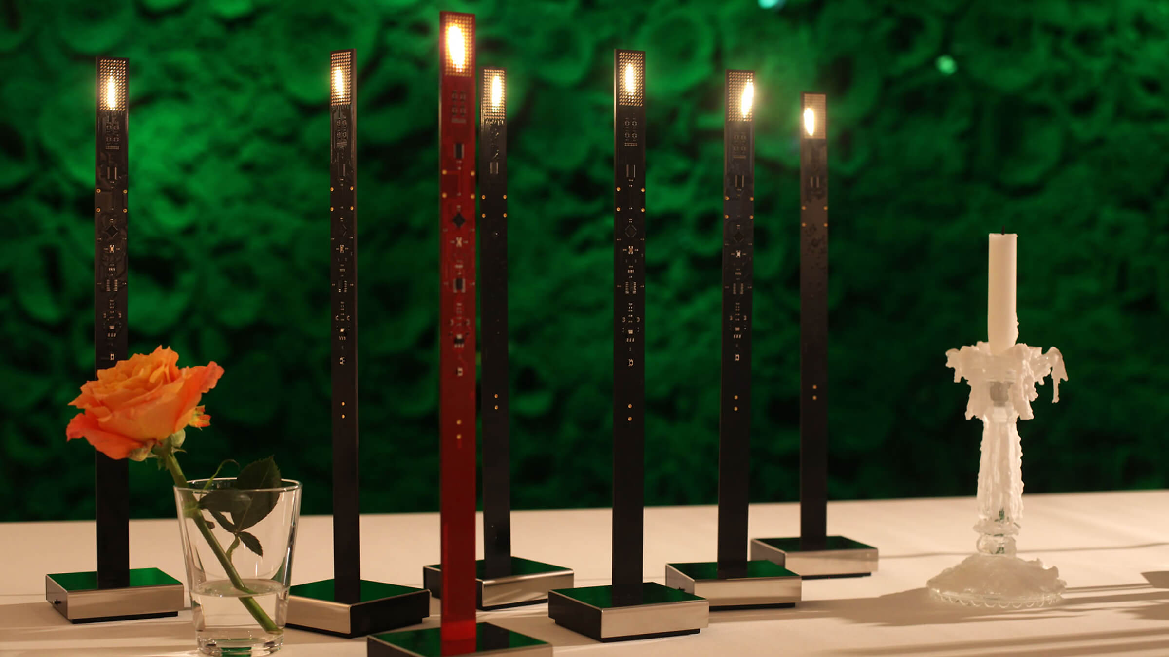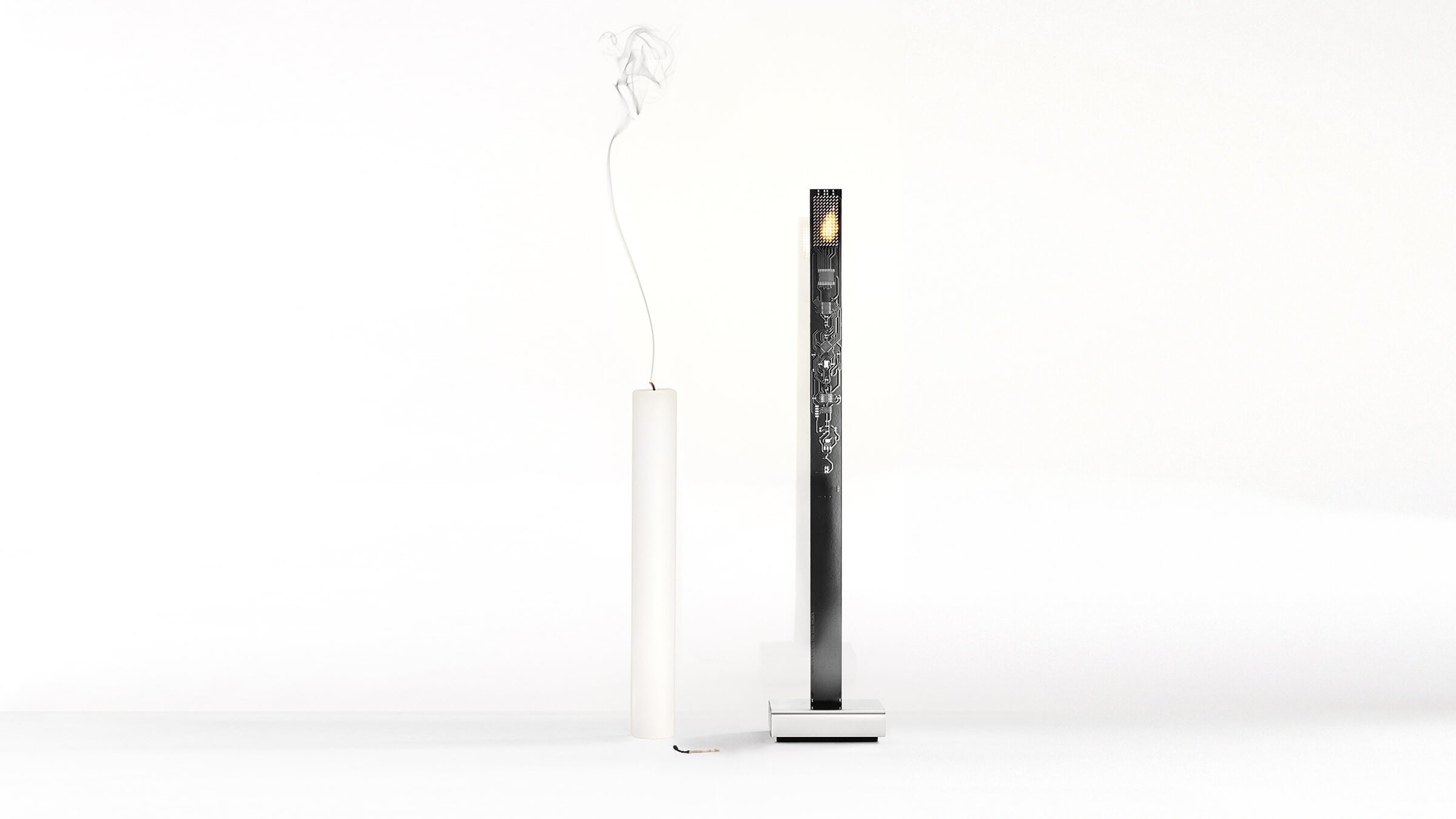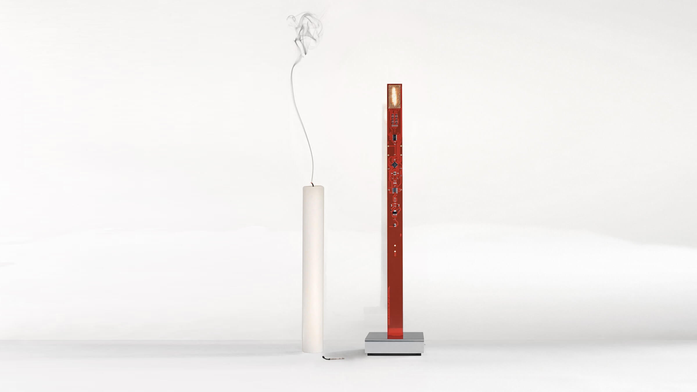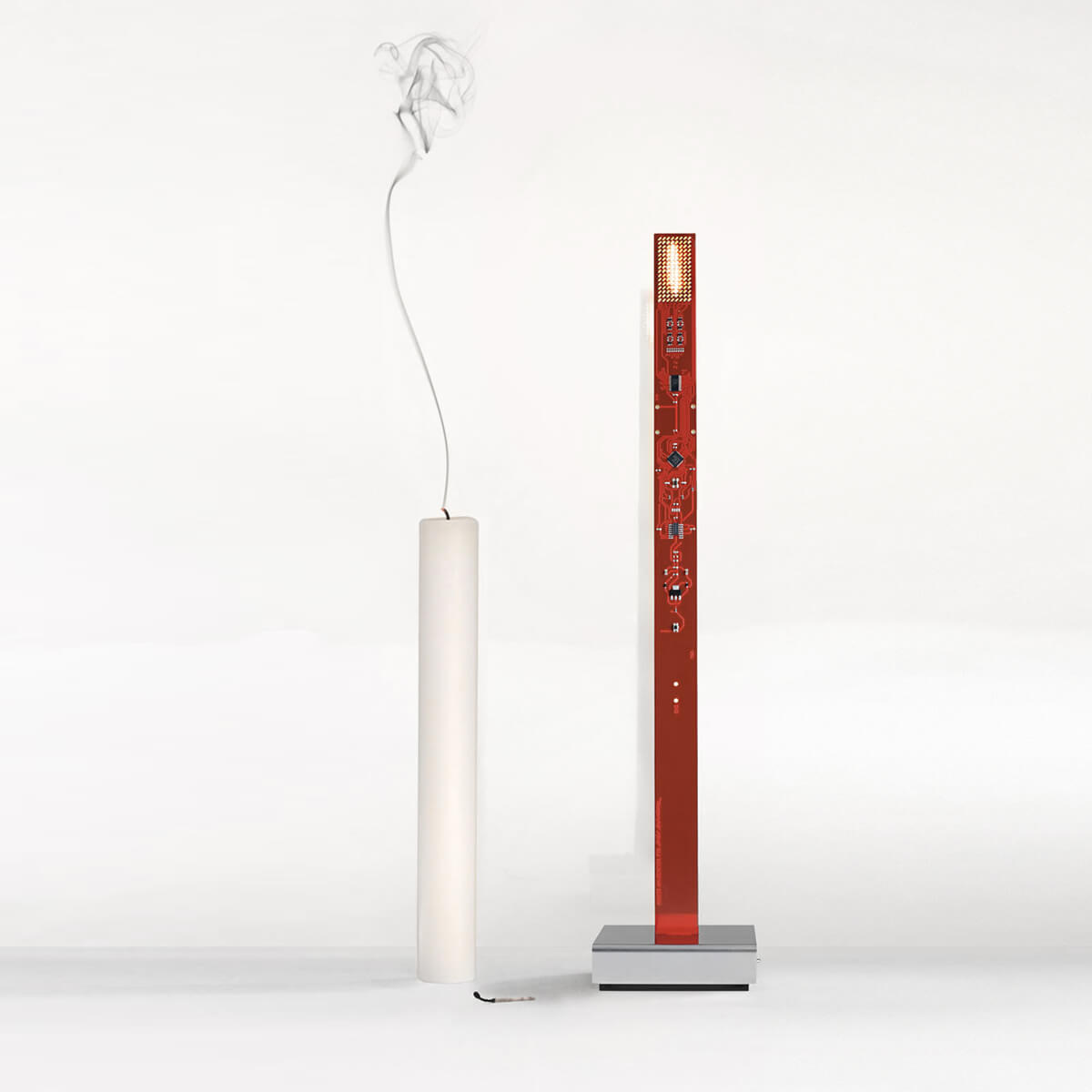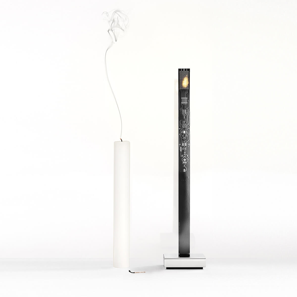 My New Flame faithfully renders the simple yet infinitely complex candle flame using 256 high-quality LEDs. The pure and minimal object features a bare circuit board containing the latest in microprocessor technology that is paired with the LEDs to evoke the natural flow and flicker. When seen from a short distance, the light is indistinguishable from the real thing, thanks to a perfect match of the light color of the LEDs. Closer inspection reveals the low-resolution charm of the digital display.