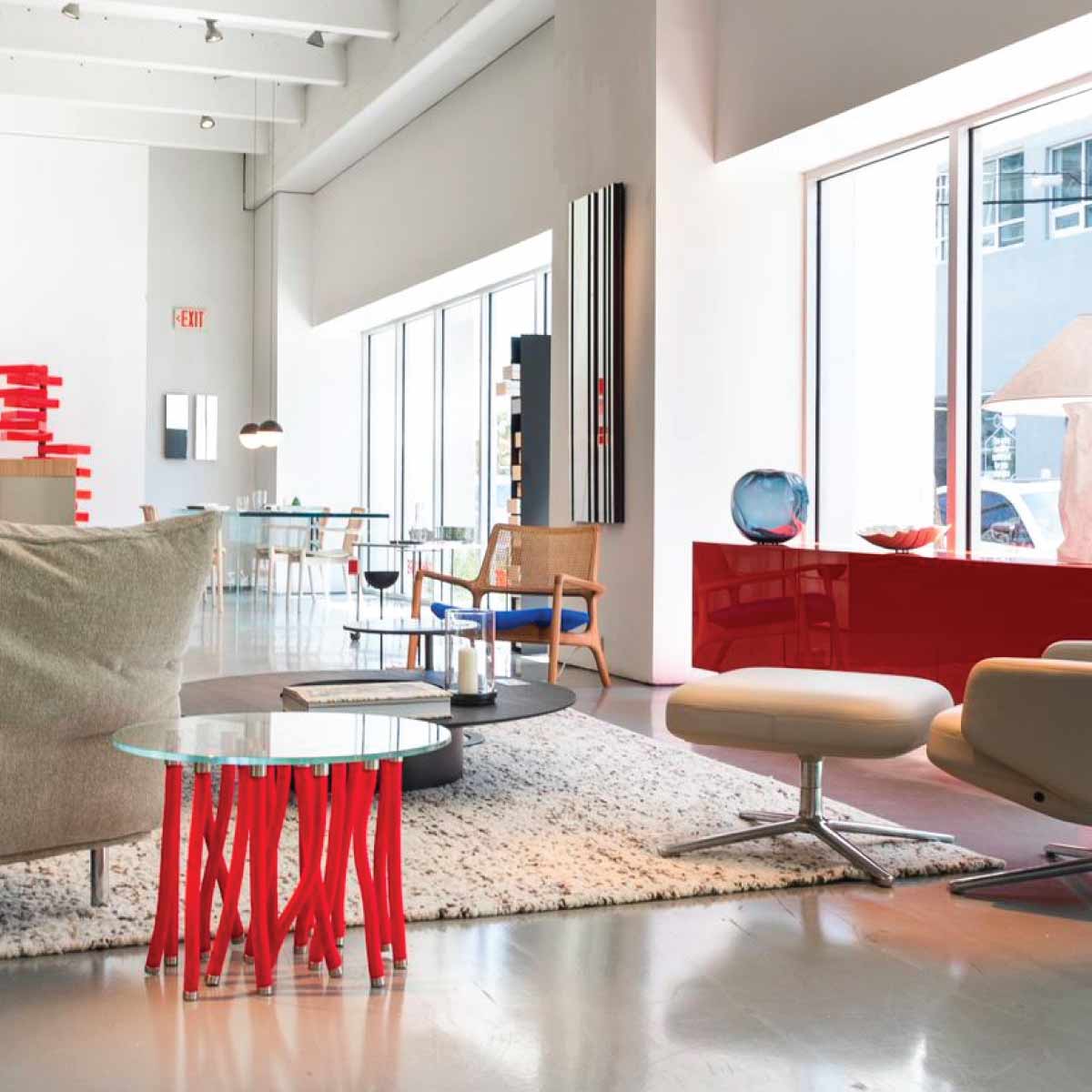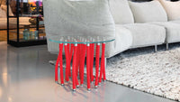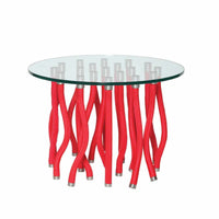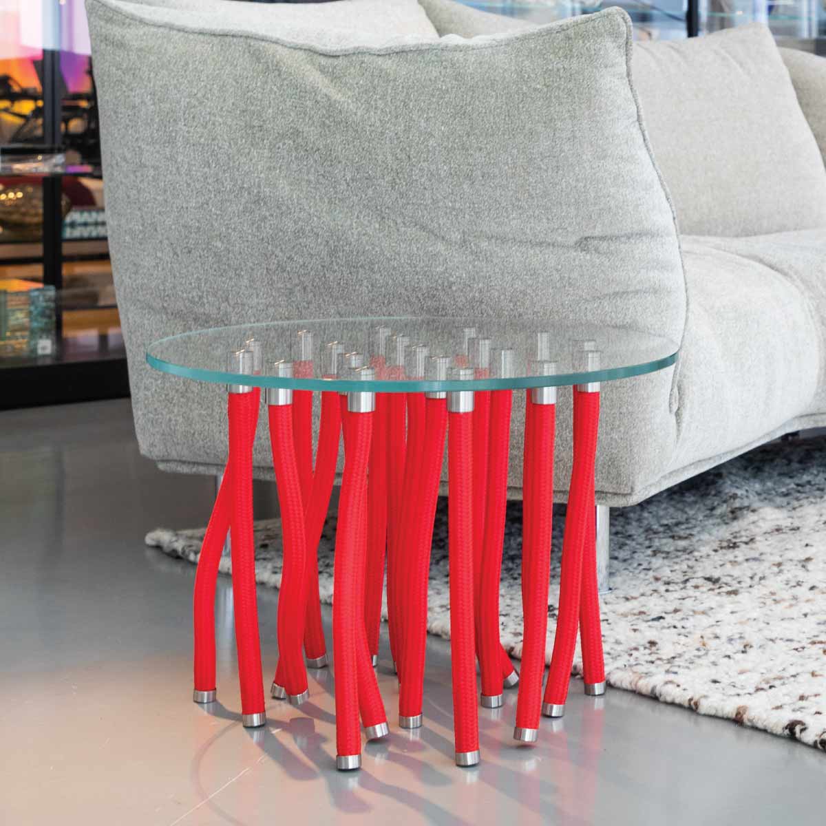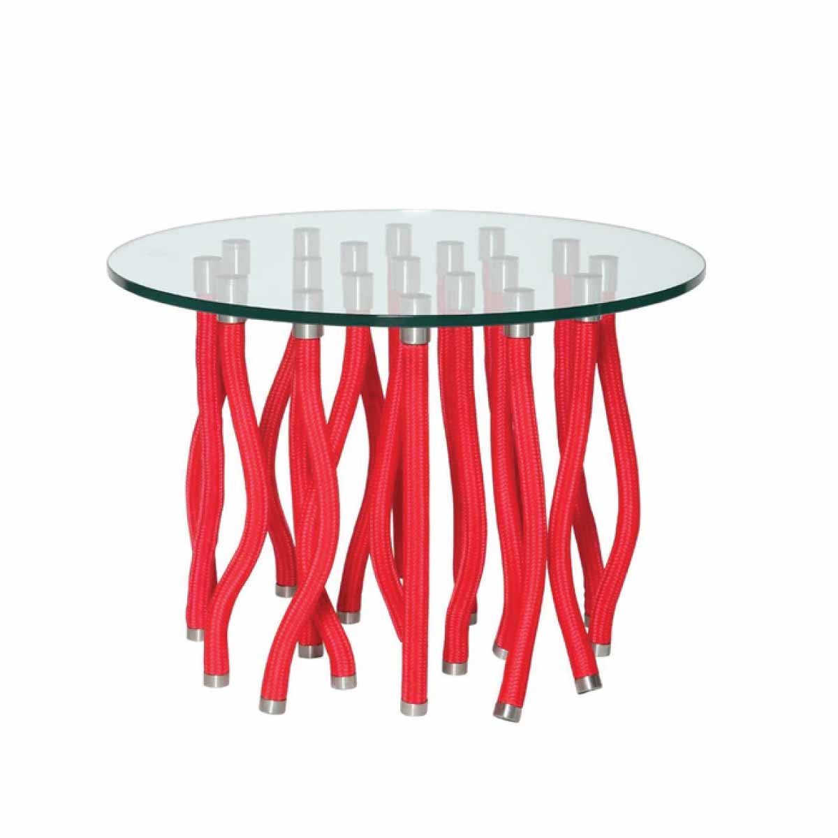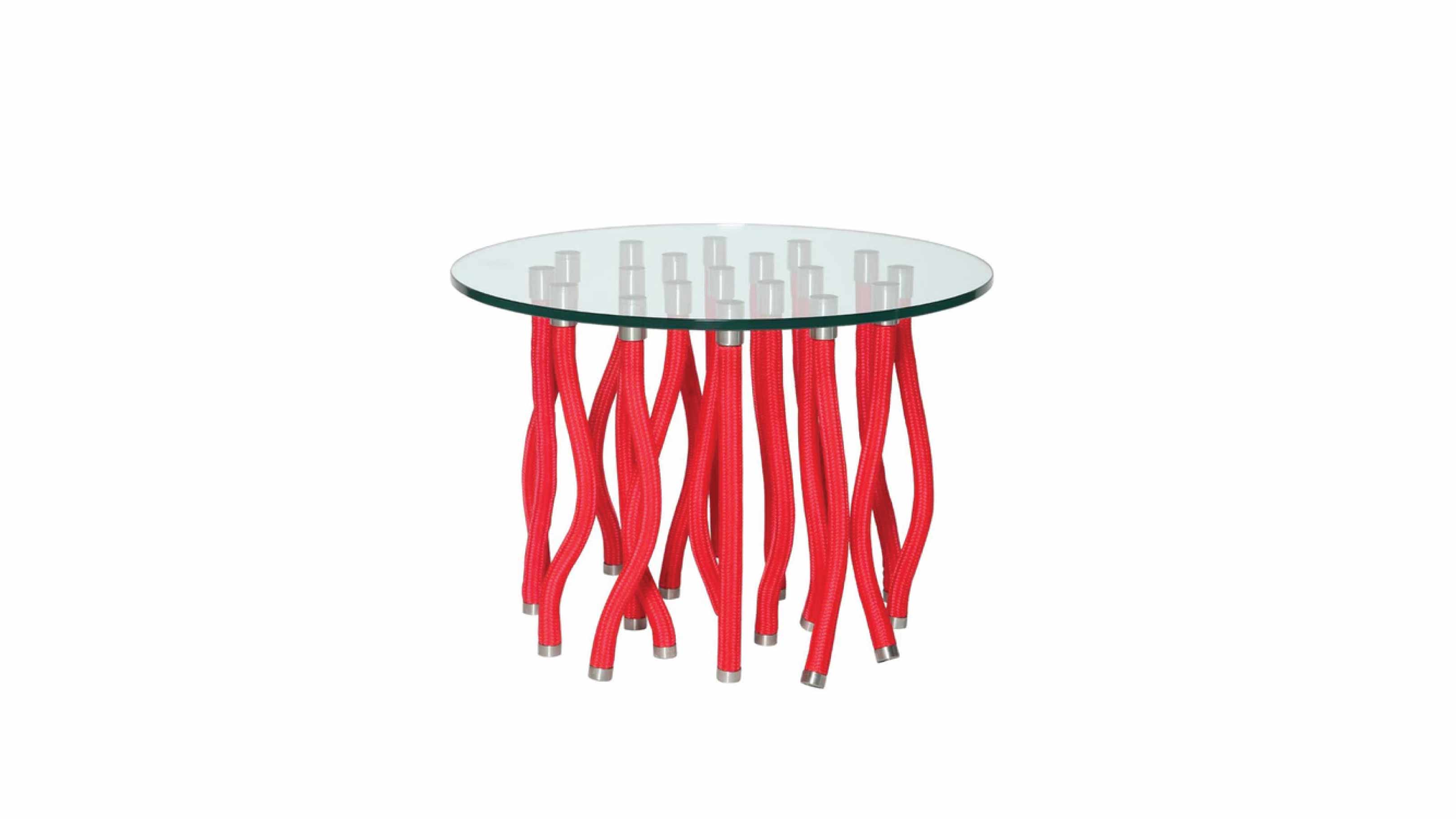 This table is also available as a console, and features a round top made of transparent toughened glass. The legs come in white, red, or black rope colors and are capped with satined stainless steel.
