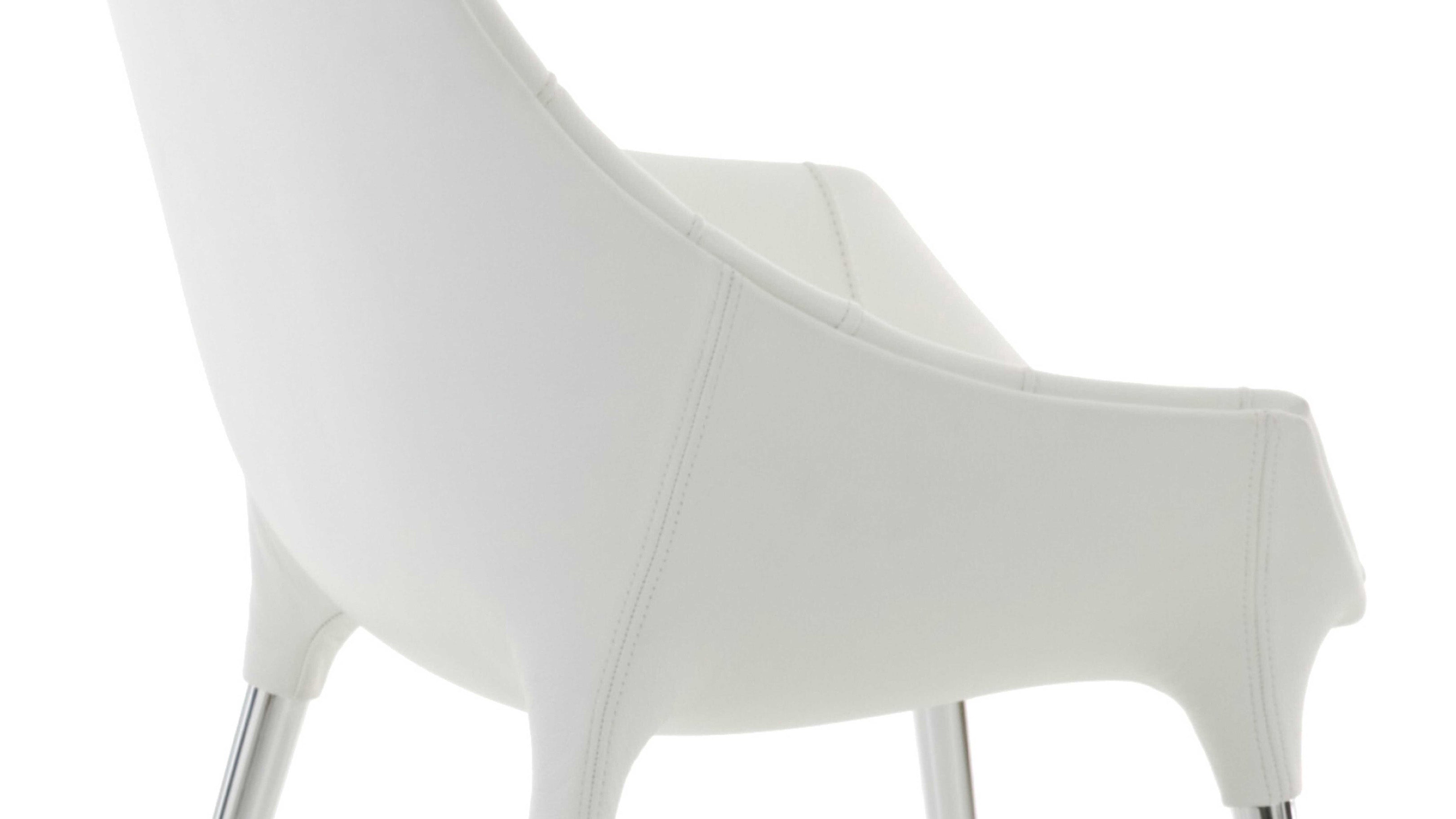 Available with outside shell in matt white nylon, interior upholstery in Ginkgo White 13F010 fabric, and polished chrome legs or with outside shell in matt black nylon, interior upholstery in Scozia 13X606 Black leather.