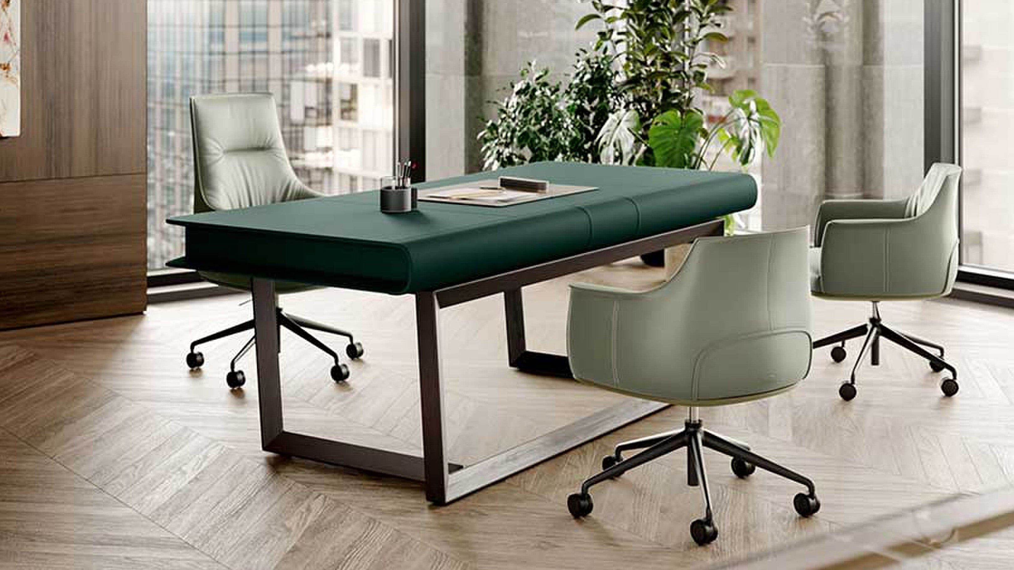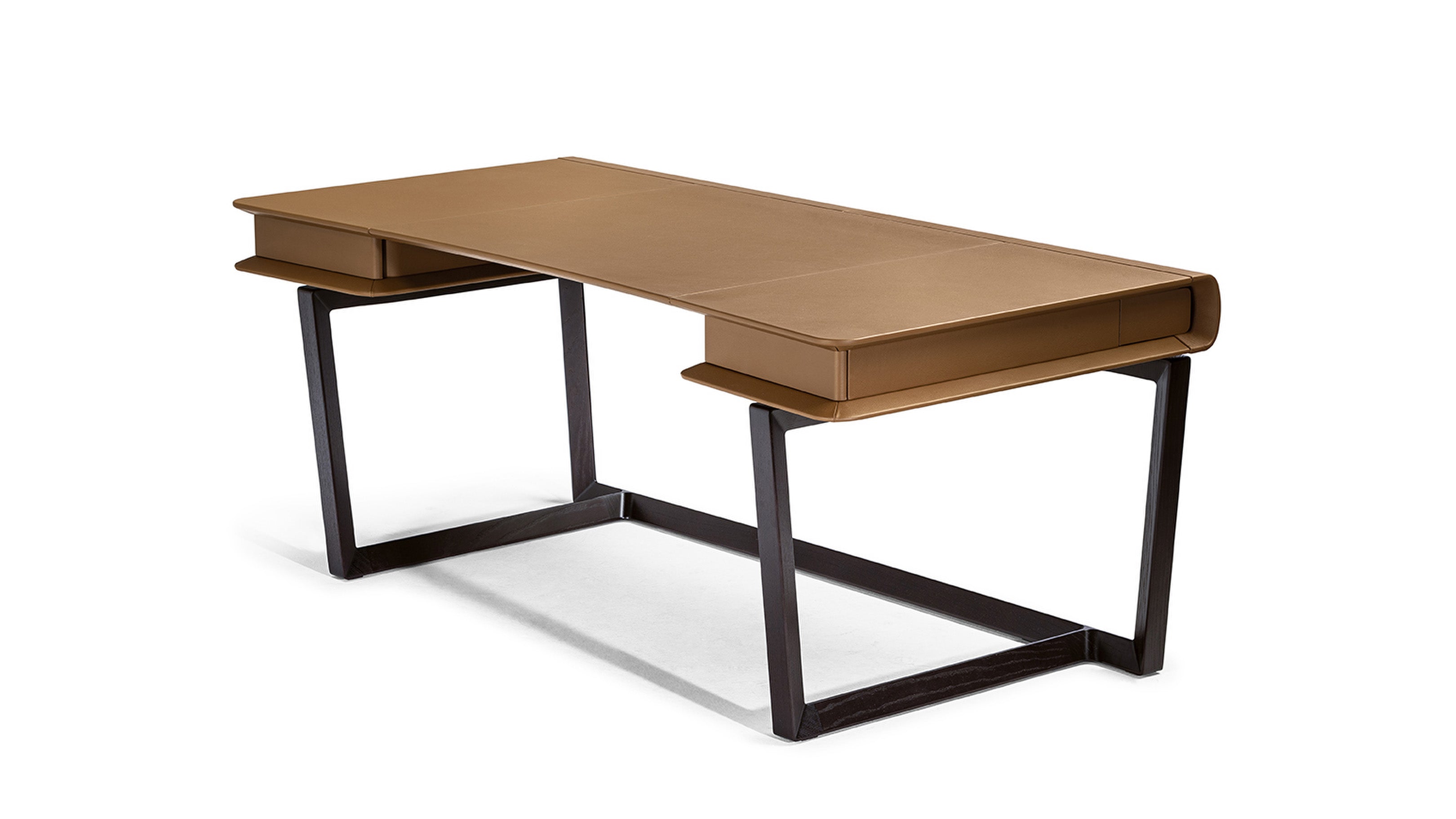 The Peek-a-Book desk showcases a stunning easel-inspired base, crafted from triangular-section solid ash with a rich moka or wenge stain, creating a striking foundation for its sleek, trapezium-shaped supports. The desk's elegant design is highlighted by Pelle Frau® leather upholstery, covering the top, drawers, and compartments, offering a seamless and sophisticated look with no visible stitching. Equipped with two central drawers and concealed side flaps, it provides hidden storage and efficient cable management, while an optional induction charger under the leather surface adds a modern touch. This versatile desk is perfect for blending functionality and luxury in any workspace.