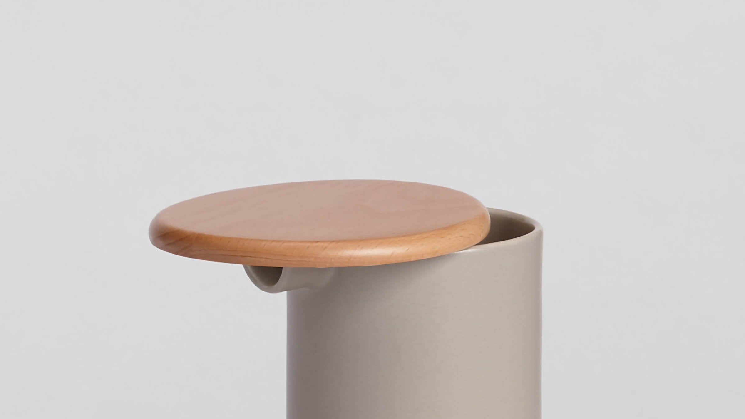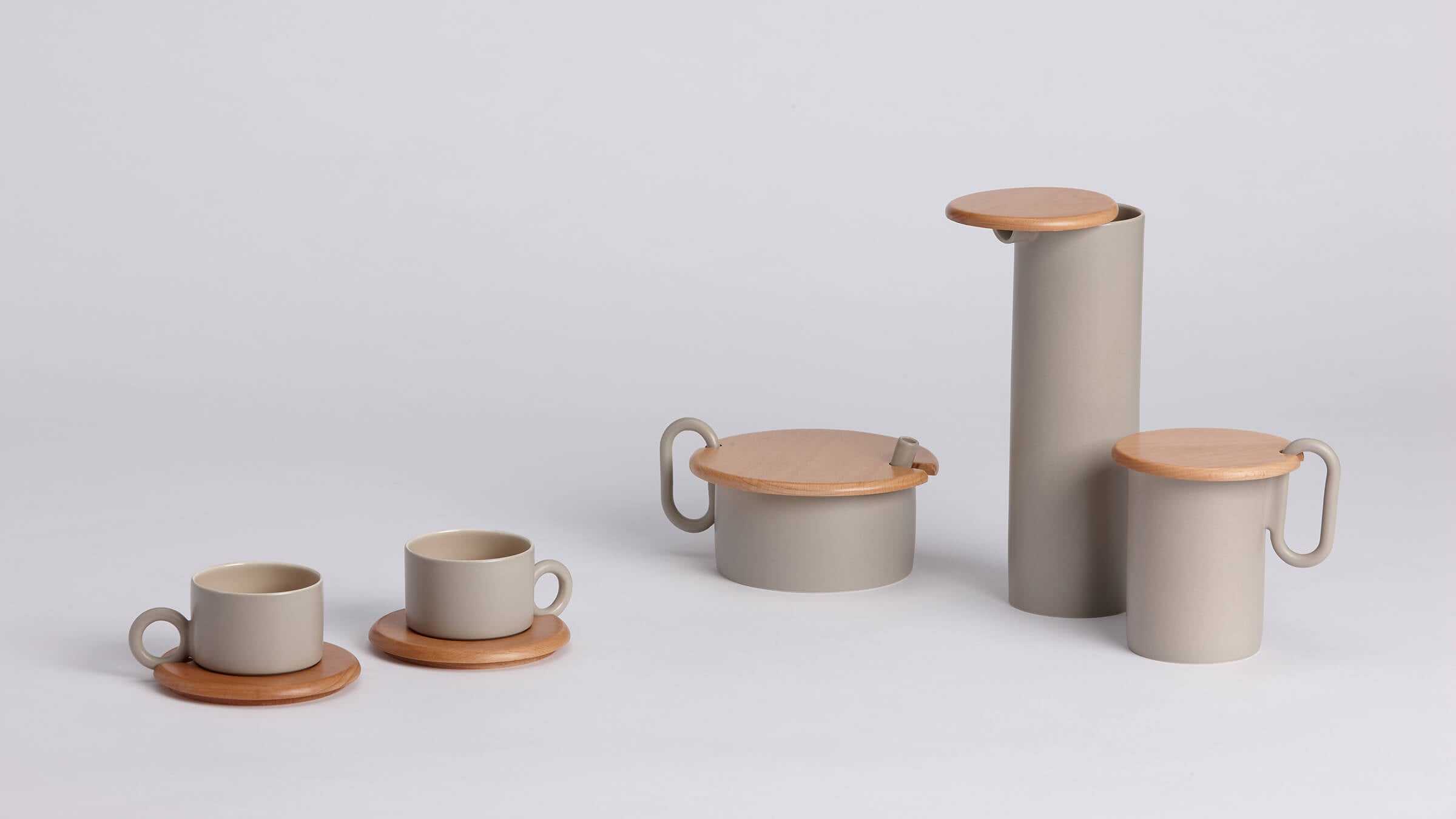 Slender cylinder carafe features a flat wooden lid that sits offset from the center to act as a strainer when pouring. Designed inversely from the coffee cups, milk jar and sugar bowl feature the wooden lid held in place by an upraised handle and the sugar spoon.
