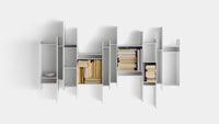 Not just divided by functional matters, objects displayed in the wall-mounted storage are meant to be arranged by the expression of emotional connection the owner has to the objects themselves.