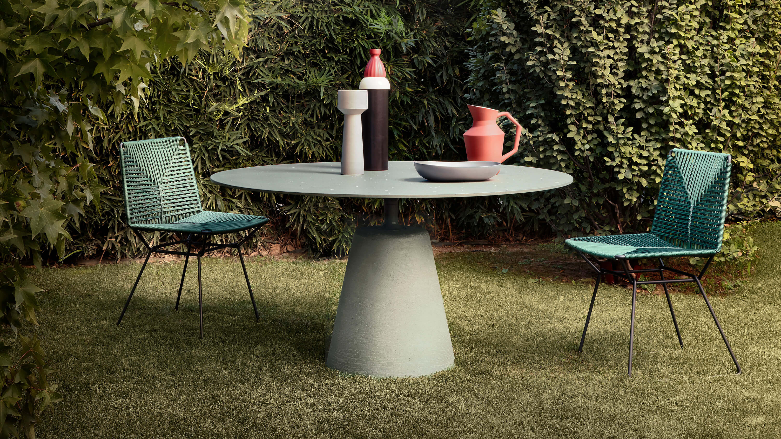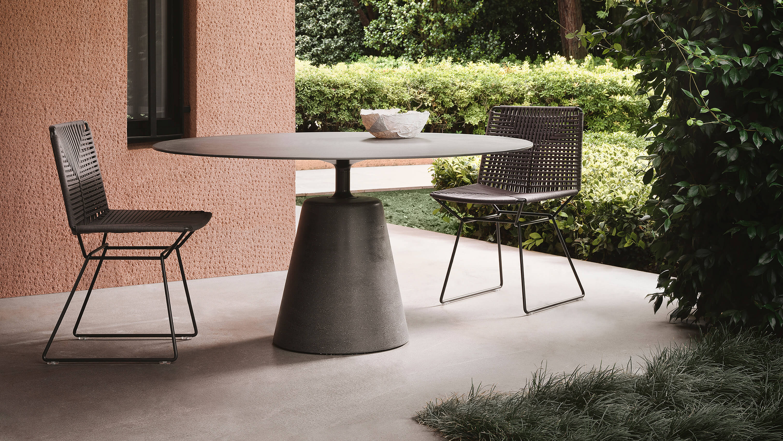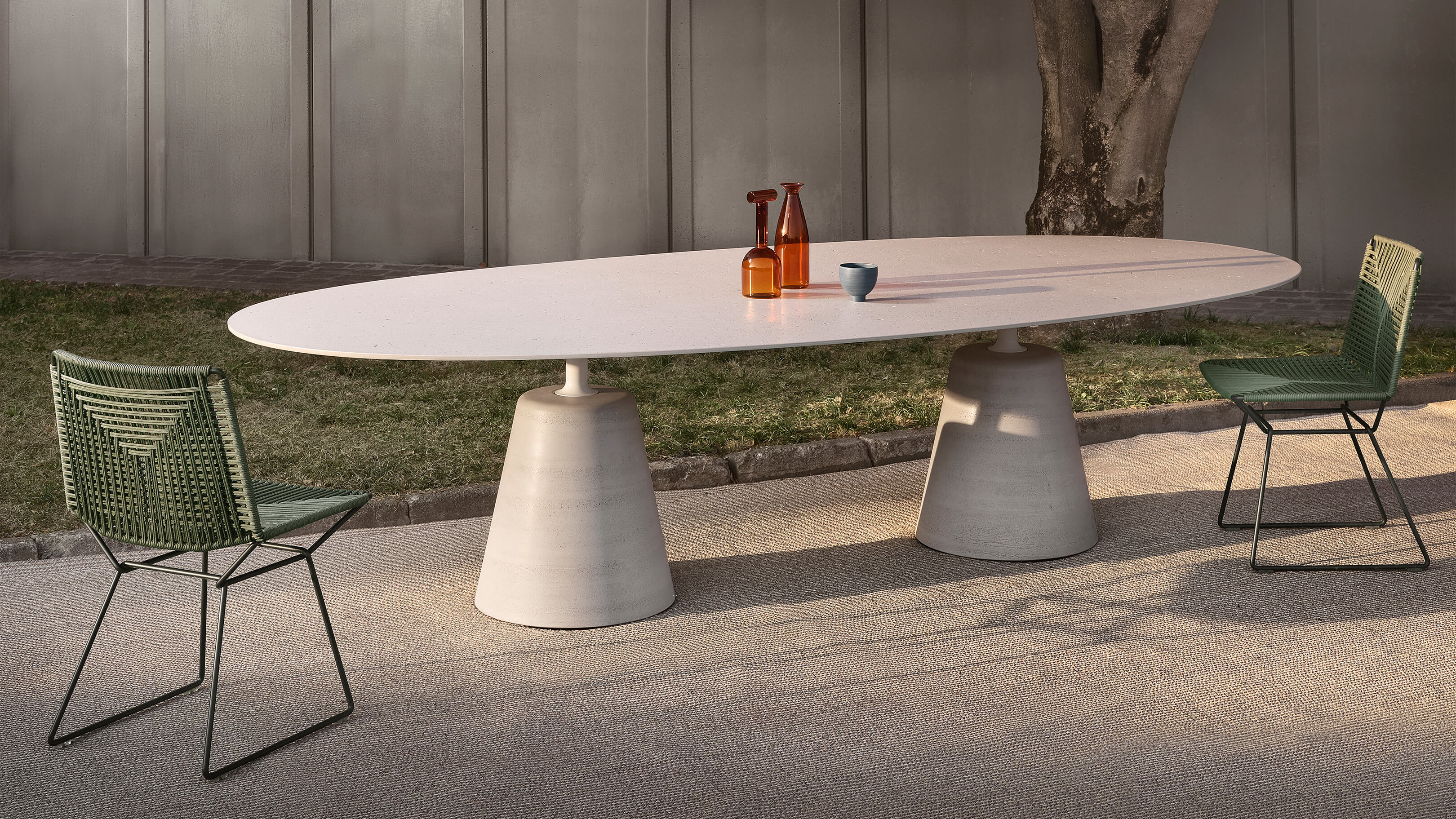 The iconic Rock Table, with its fluid and elegant silhouette, fits with great personality into a variety of outdoor settings, residential or public: gardens, terraces, dehors. In the new oval version, Rock Table becomes the perfect set for large outdoor gatherings, hosting up to 12 people.