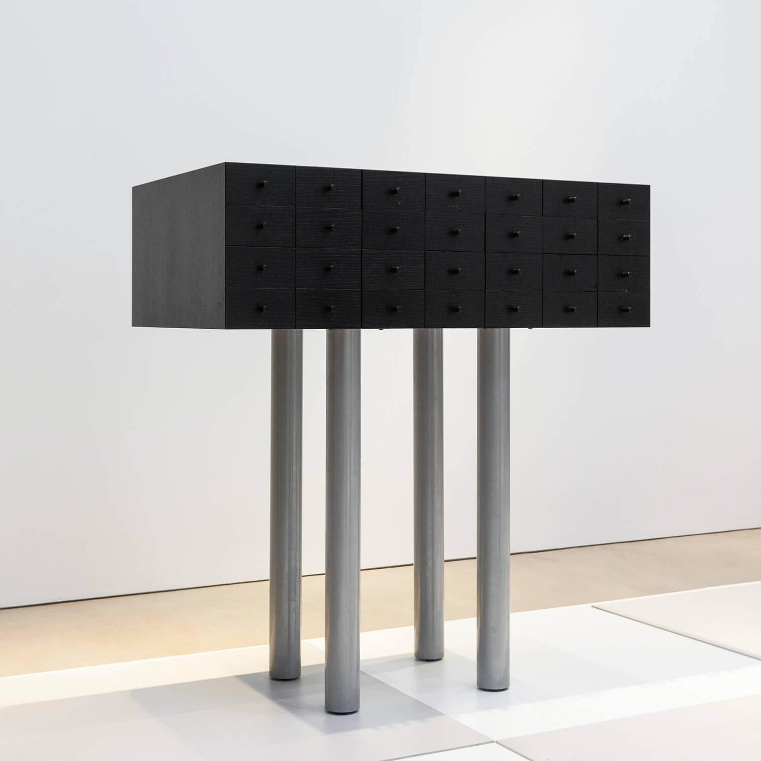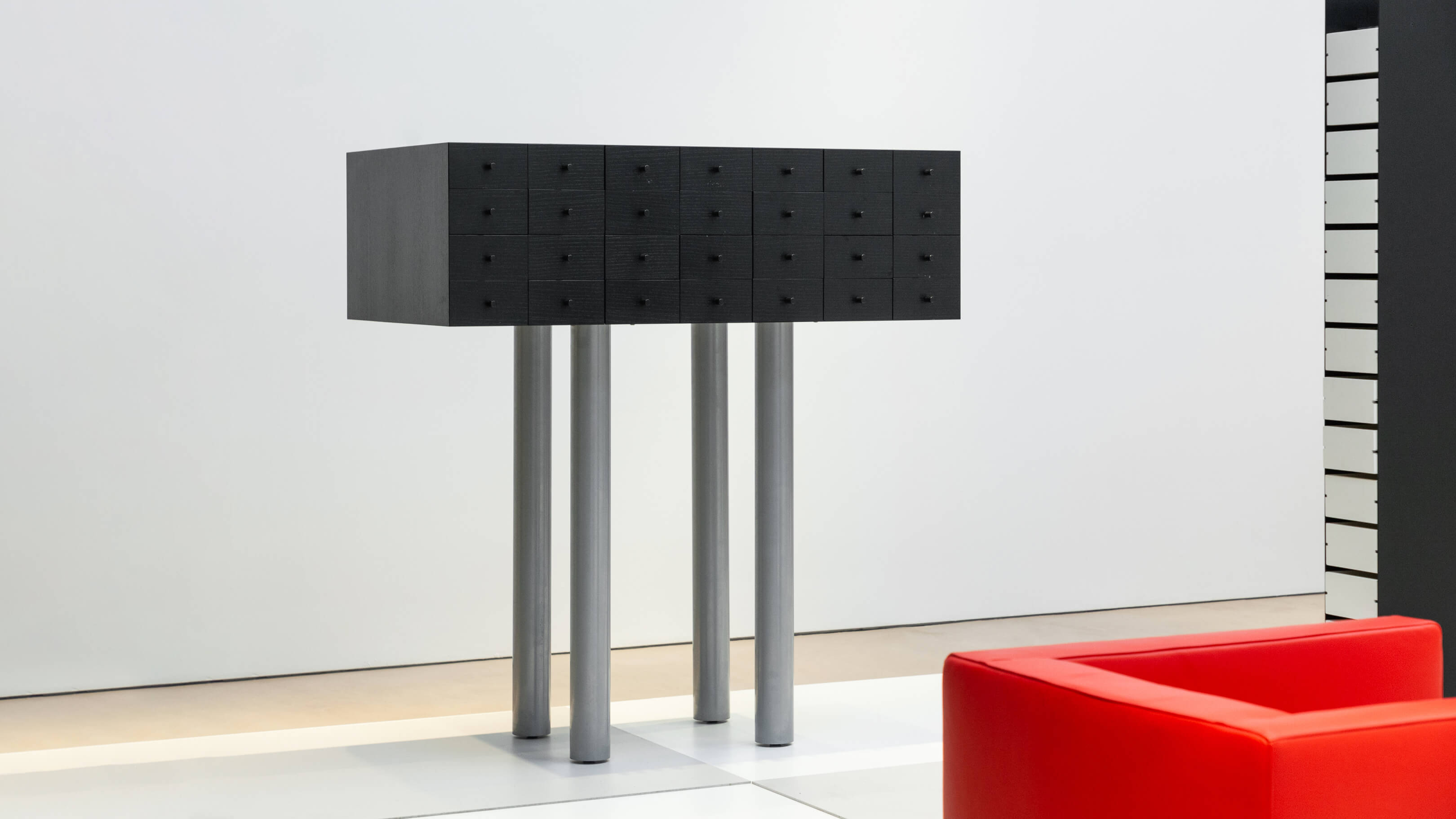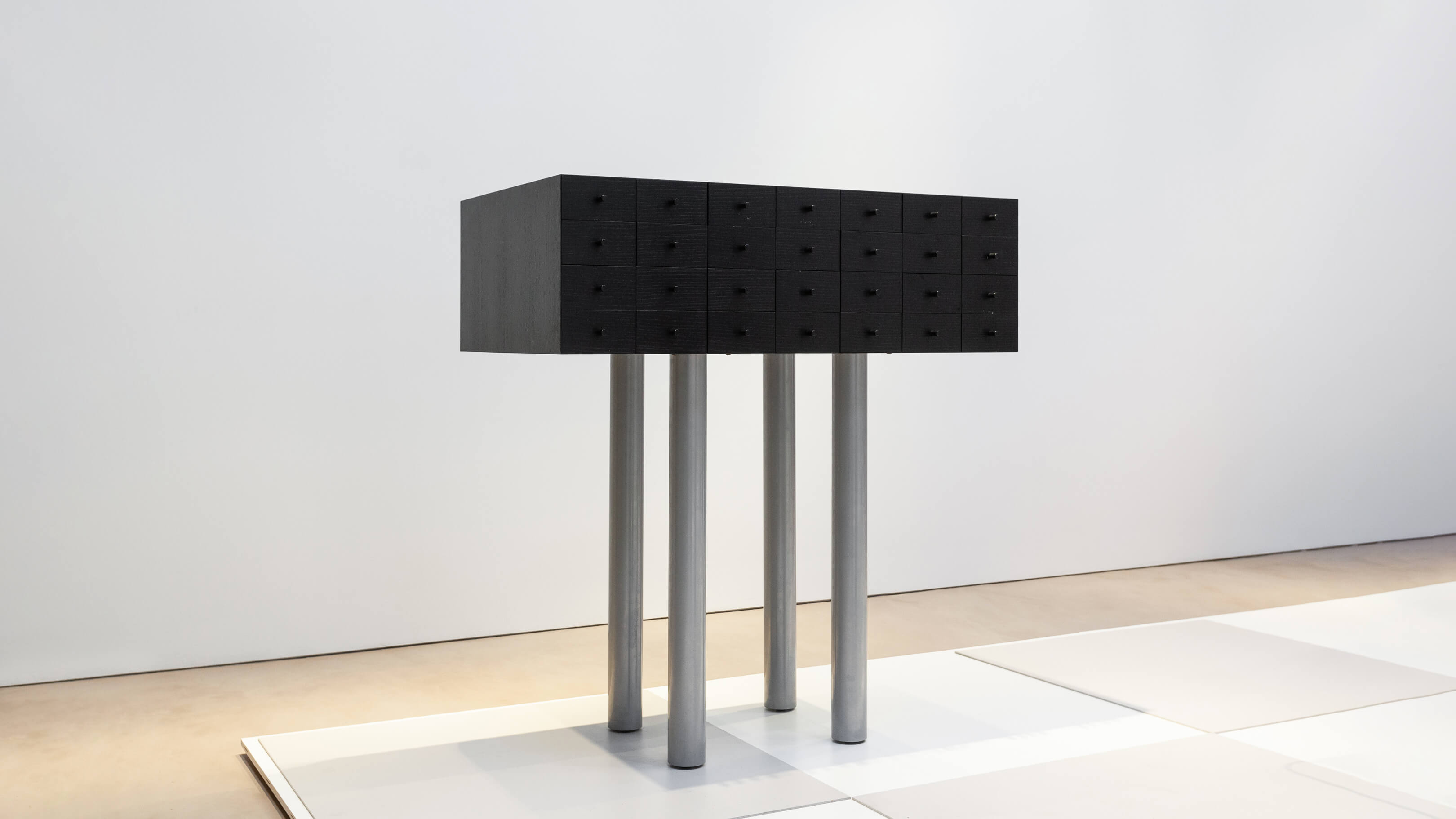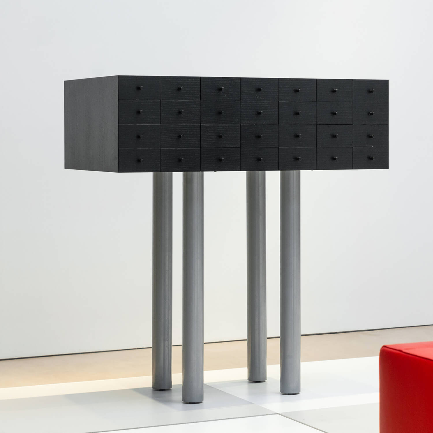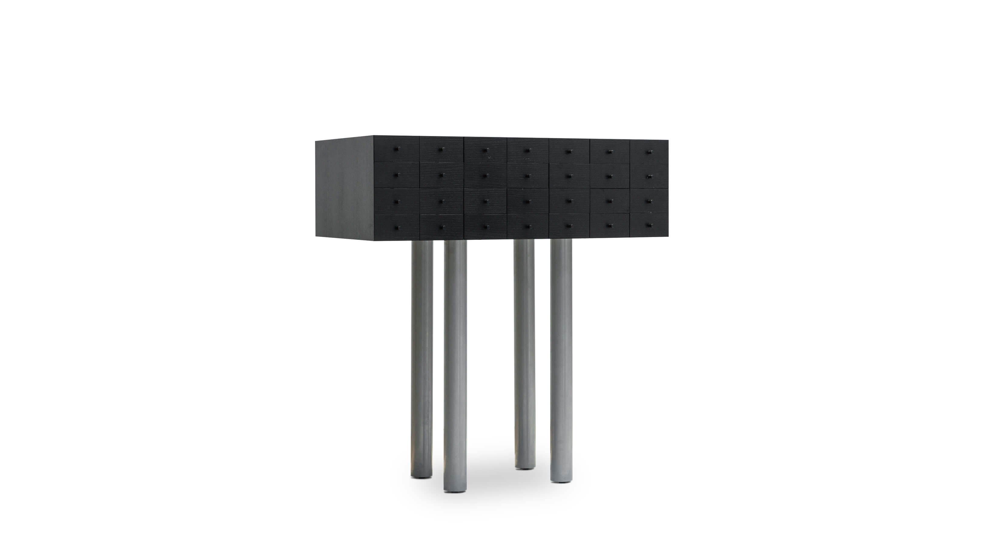 Standing assertively on four long legs, haunting, totemic, and commanding, the Solaris was born of mystery and imagination, a nod to the feted 1972 science fiction film of the same name where dream like memories act as windows to the subconscious, the reserve of magic and creativity from which designer Shiro Kuramata’s own creations are conceived, lingering, poignant, and provocative. The cabinet’s 28 drawers therefore symbolize the retention and protection of memory, manifesting the innermost visions and reveries that occupy our quietest moments for a specifically enchanted object that is unique, delightful, and breathtaking.