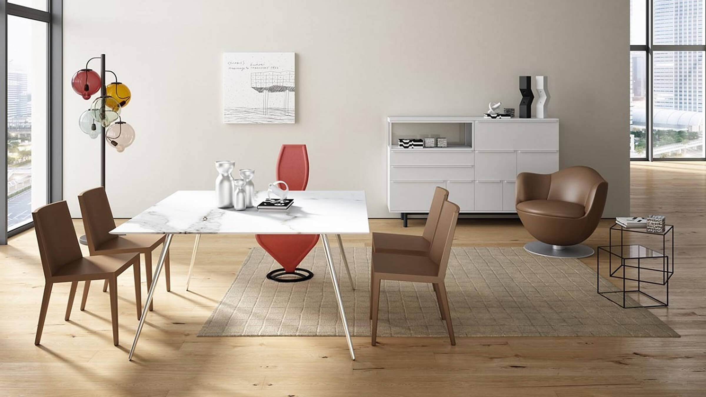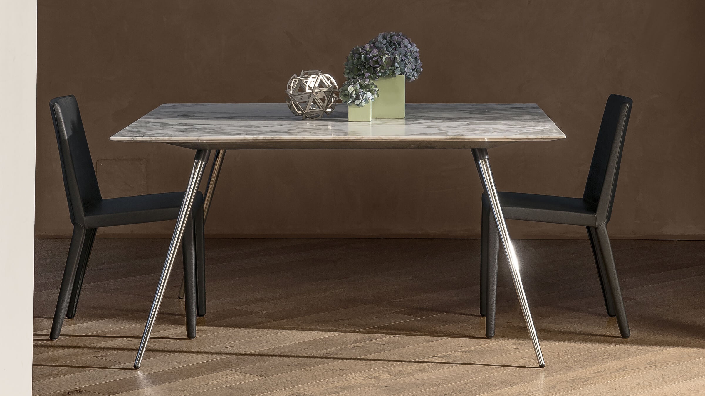 The Stay Table bears a lightness that soothes the eye and a sturdy structure that complements its tactile quality. Its slender legs are made of a conical tube with a polished chrome, brass, or a matte varnished finish in white, mud, or anthracite.