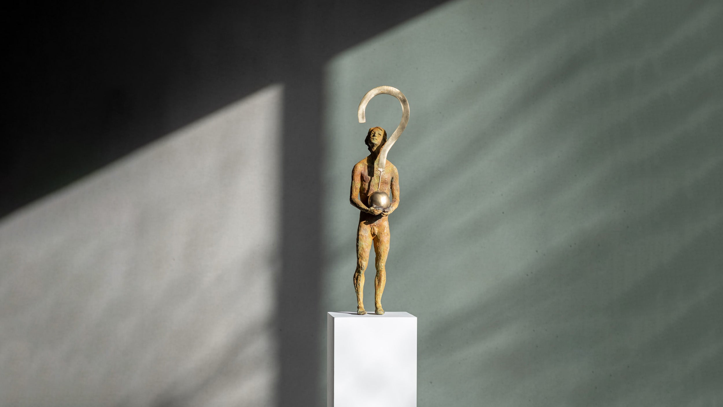 - Depicts a single stylised figure lifting a question mark, symbolising inquiry and existence