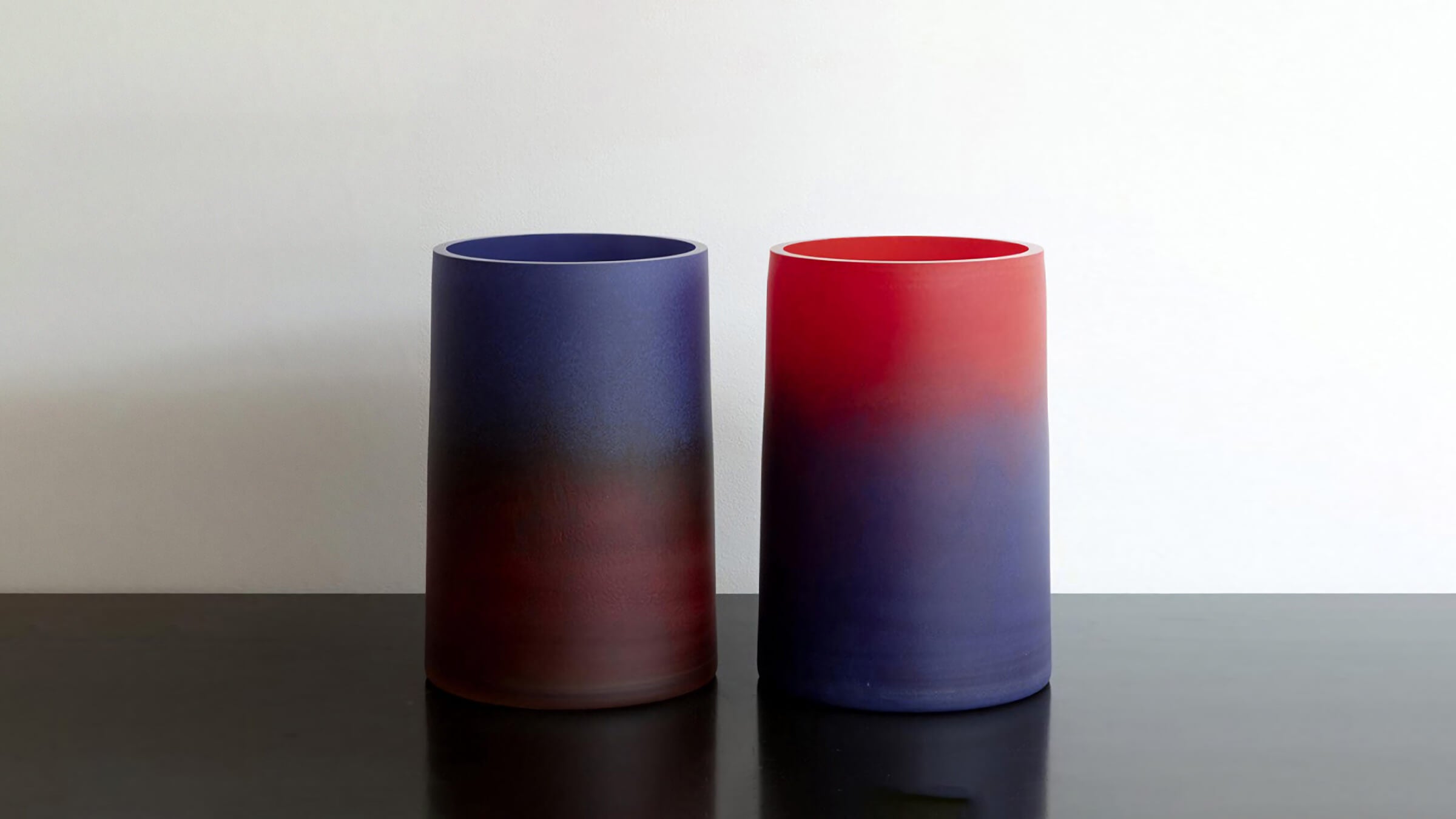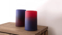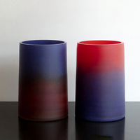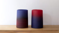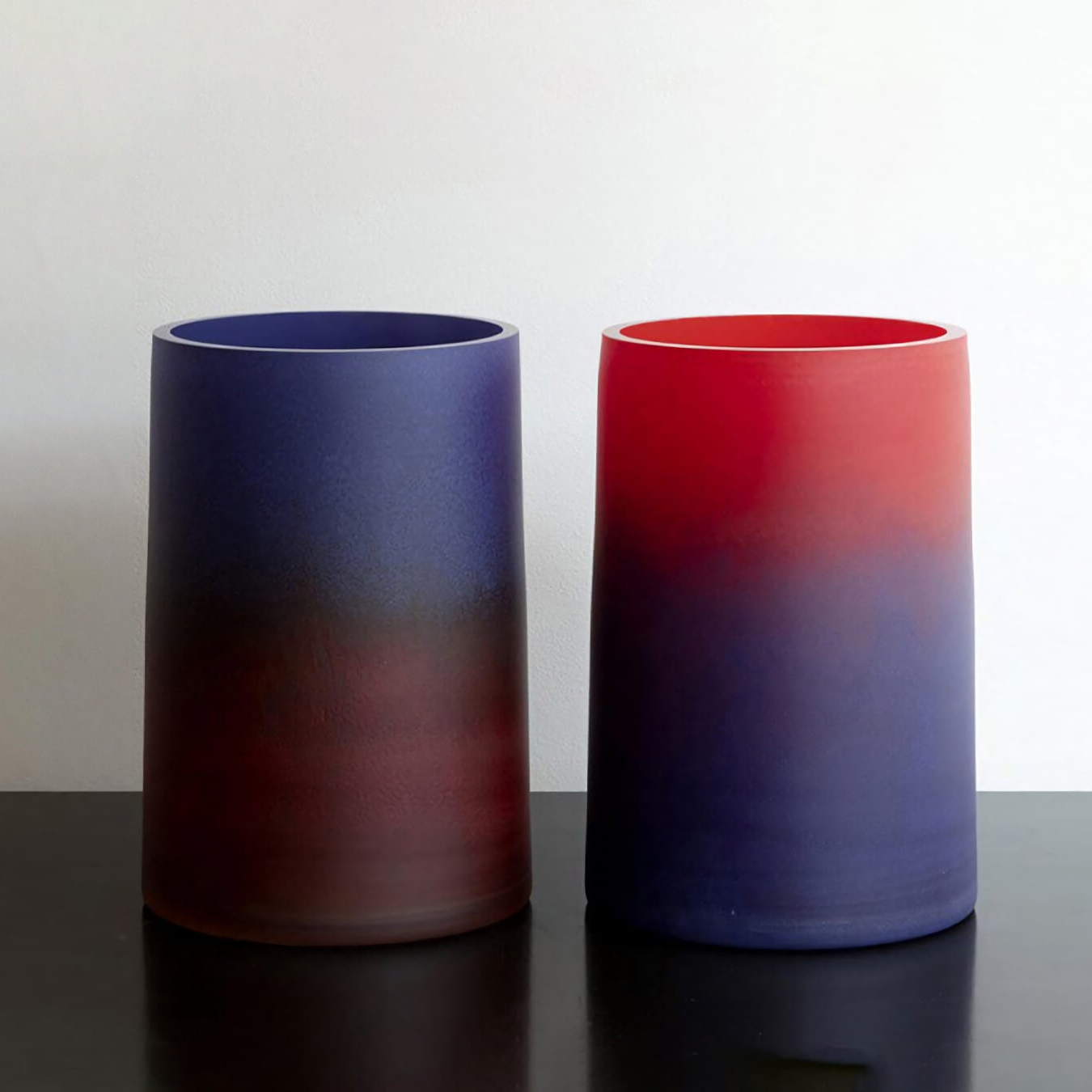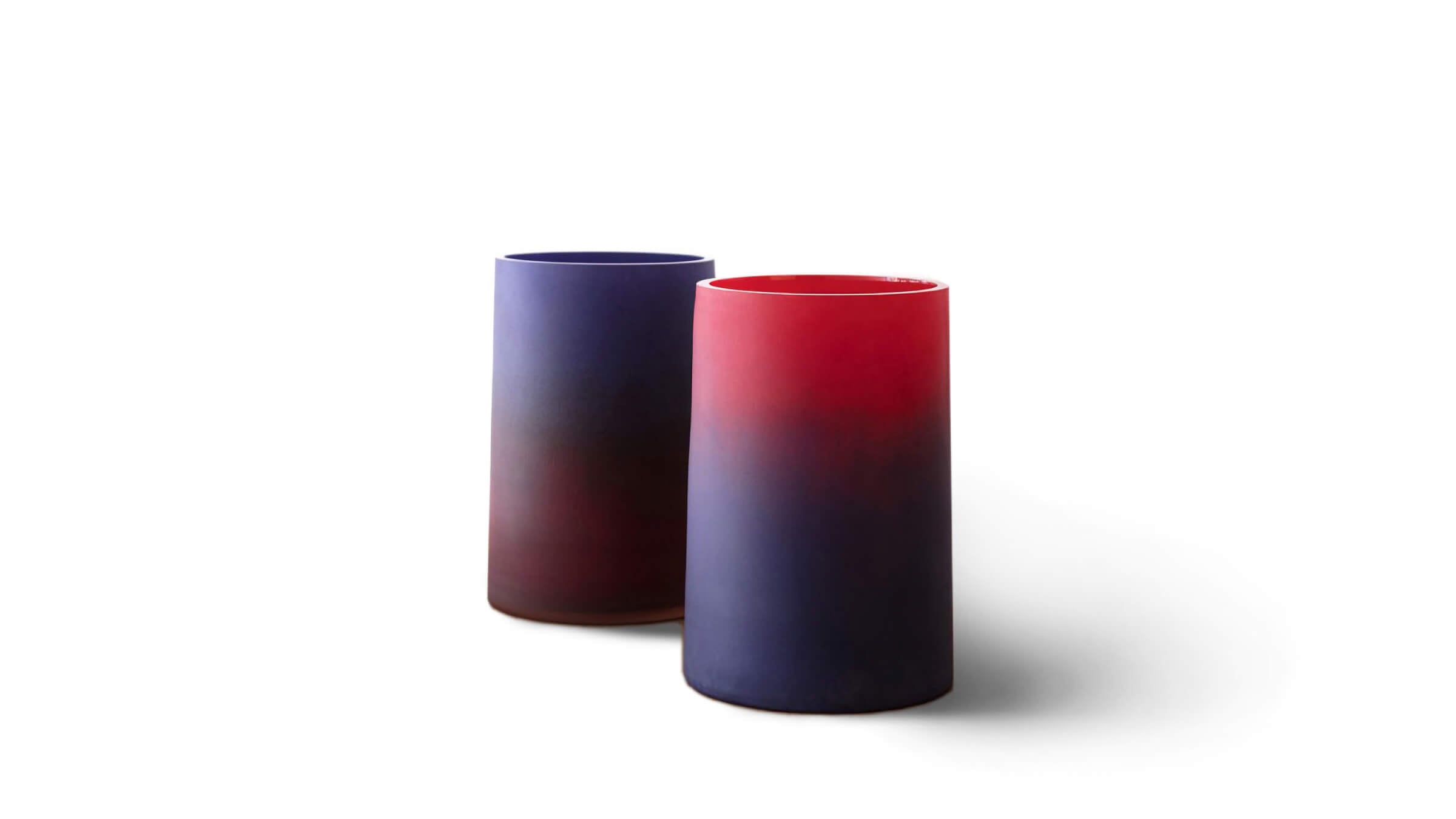 The VCE VCA Vase is gracious and colorful. These stately mouth-blown objects are covered with colored glass powder. Both pieces with a red and blue interior are each other’s opposite, and therefore a perfect match.