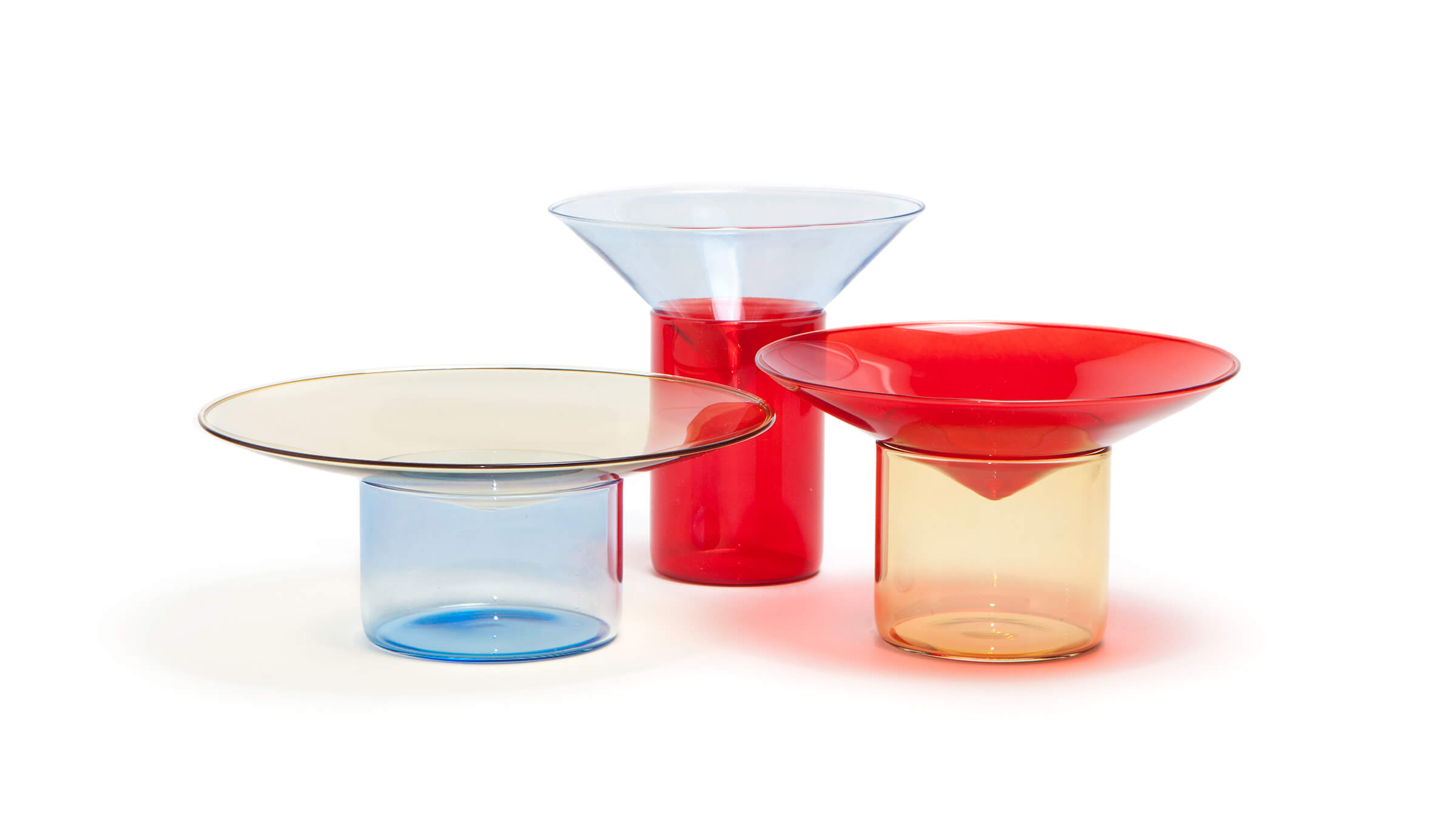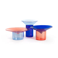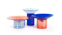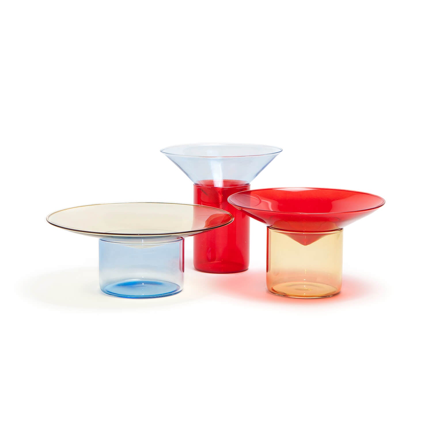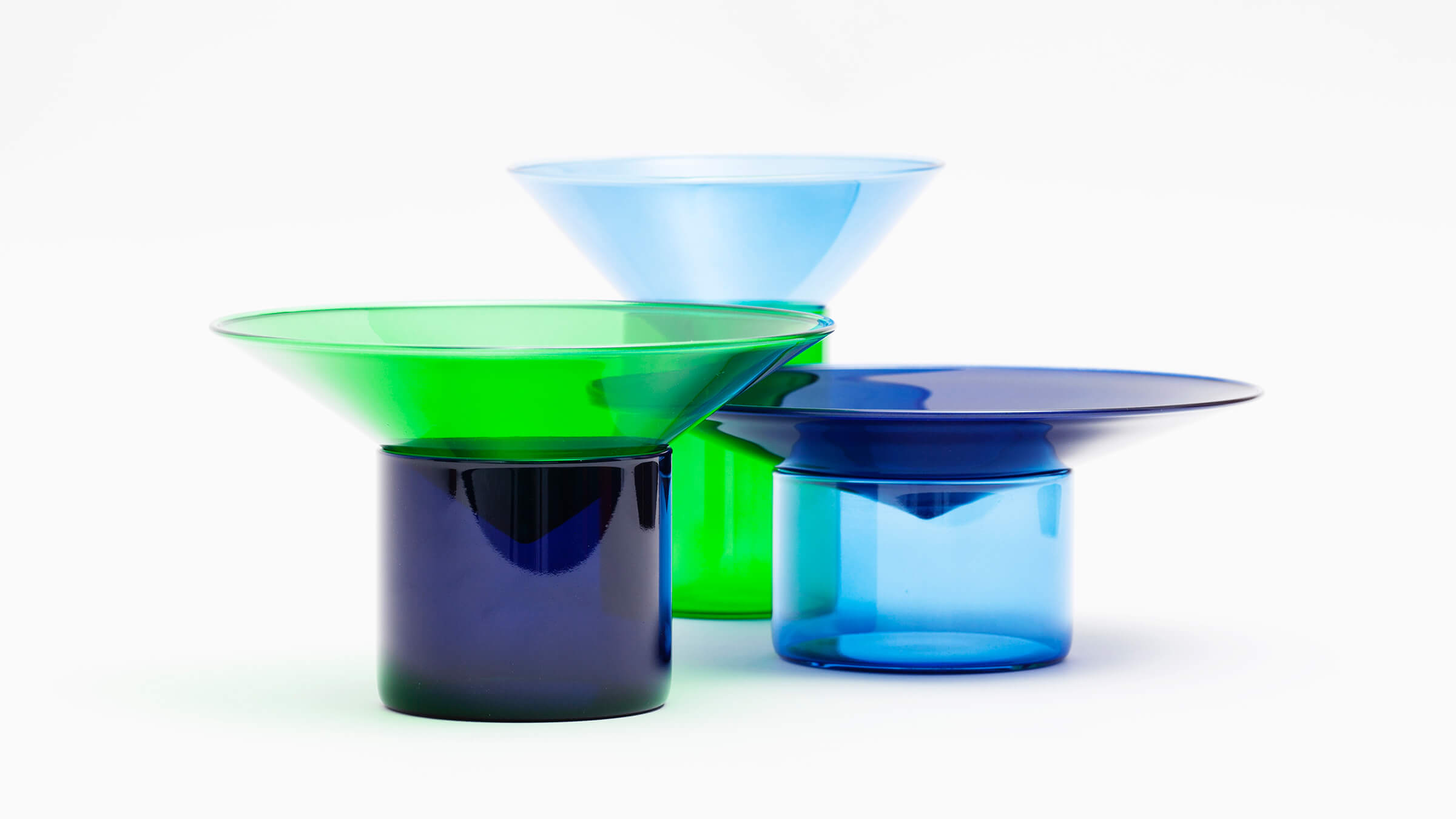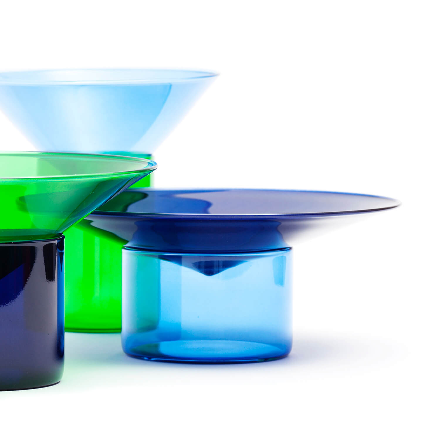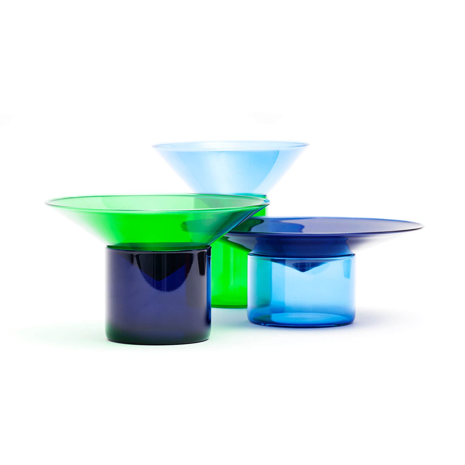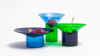 Vovo Glasses are an object of art, born from fascination with two basic geometric forms. Colored glass elements create various hues and an illusion of changing shapes. Each cone matches each cylinder, which allows for versatility of usage and different combinations of color and form.