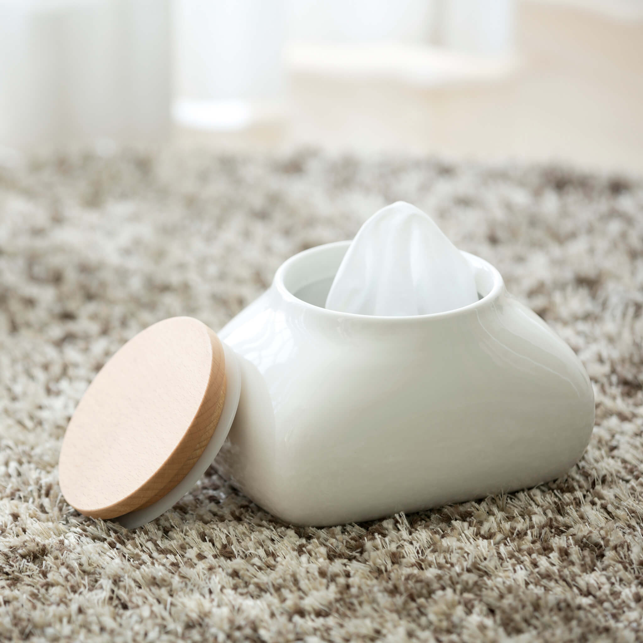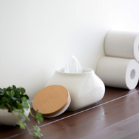 An airtight canister for storage in the bathroom or kitchen, Ideaco's Wet Wipes Case suits a variety of needs. The soft, sinuous ceramic design is capped with a silicon gasket to keep contents from drying out, especially helpful for pre-moistened tissues. Simply open the wooden lid and slide a package of tissue into the Wet Wipes Case and the contents are available as needed. Rather than hiding the utilitarian toiletries out of sight, this canister makes a subtle impact through its strong design and is meant to be displayed.