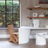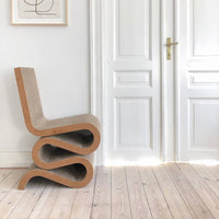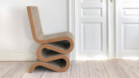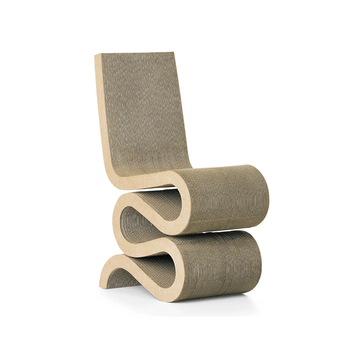 The sculptural form of the Wiggle Side Chair makes it stand out. Although surprisingly simple in appearance, it is constructed with the consummate skill of an architect, making it not only very comfortable but also durable and robust.
