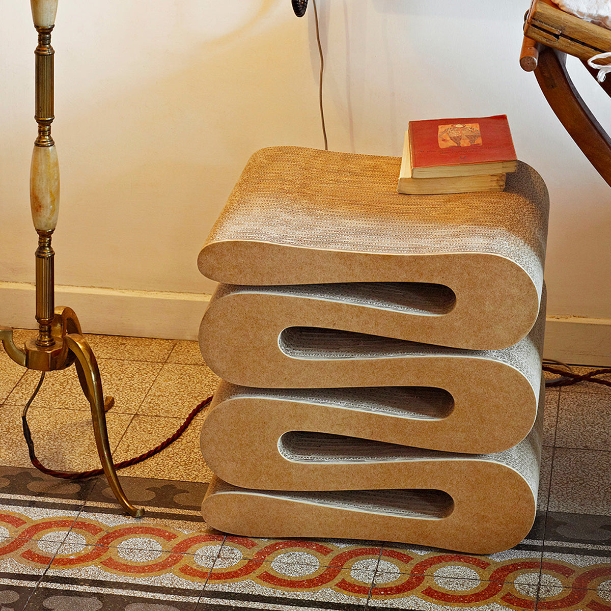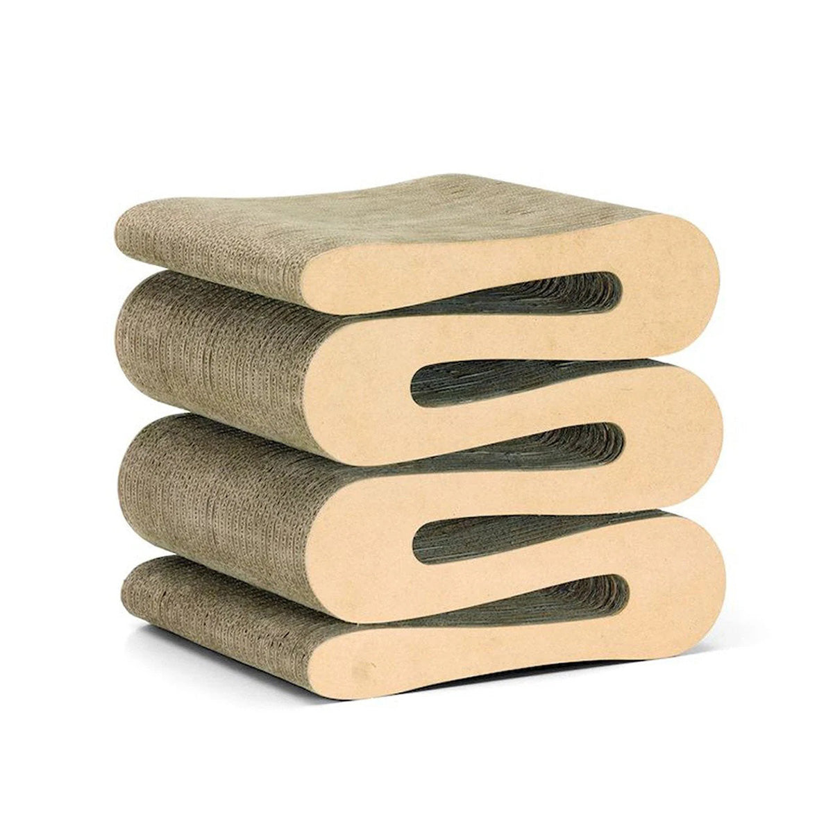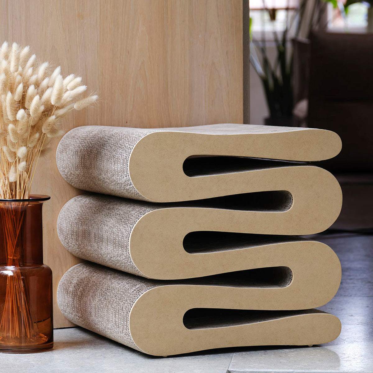 The Wiggle Stool designed by Frank Gehry for Vitra is an iconic sculptural seat crafted from layered corrugated cardboard in a wavy, ribbon-like form. The natural hardboard edges add both structural strength and tactile contrast, giving the piece a refined yet playful character. Originally part of Gehry’s experimental Easy Edges furniture series, the design combines architectural precision with unexpected material ingenuity. With its sinuous silhouette and enduring appeal, the Wiggle Stool brings a bold, artistic accent to contemporary interiors.