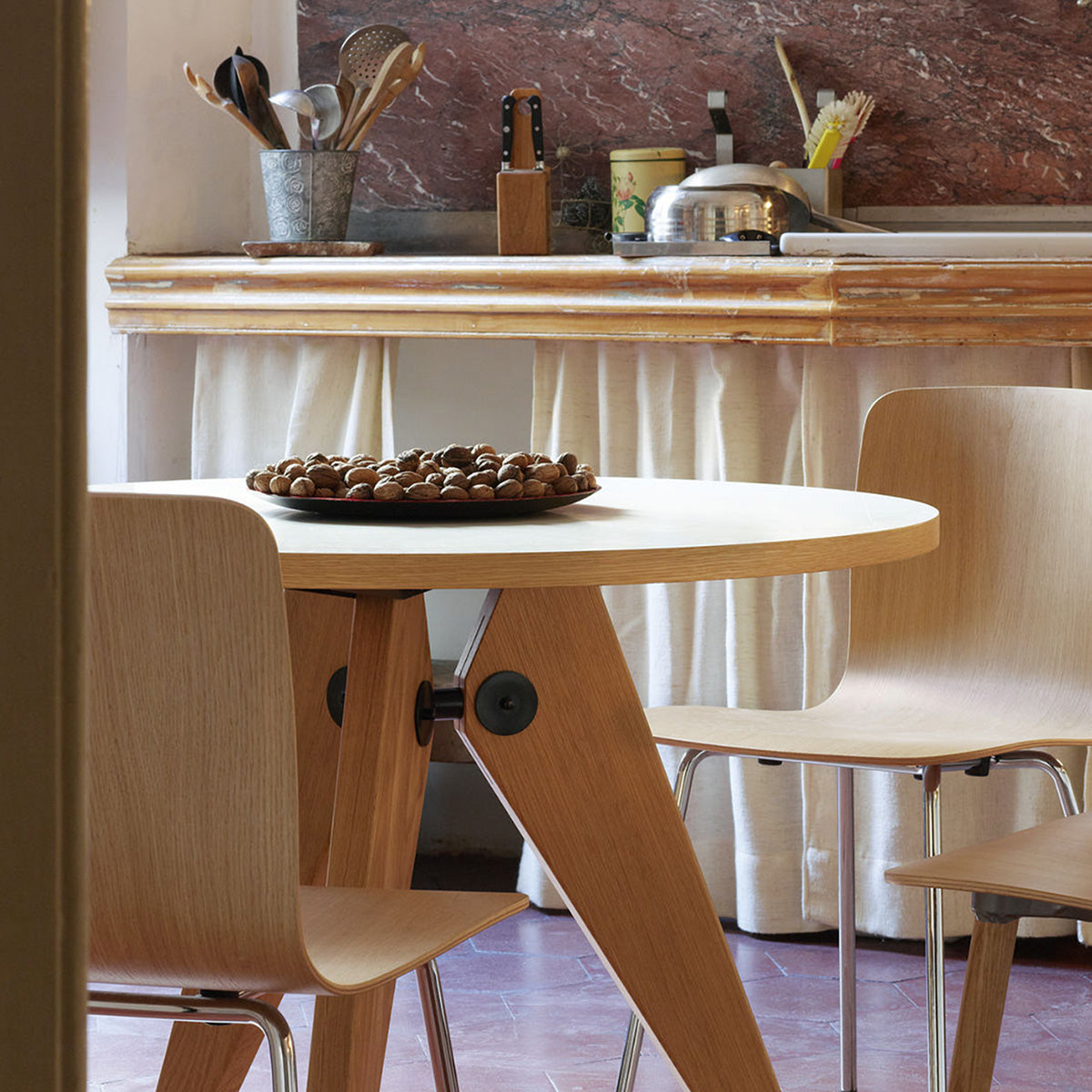 Стол «Геридон», спроектированный Жаном Пруве в 1949 году для Парижского университета, является примером его архитектурного подхода к дизайну мебели, основанного на использовании дерева в качестве основного конструкционного материала. Круглая столешница из массива дерева опирается на три элегантно изготовленные деревянные ножки. Ножки соединены изогнутым элементом из листового металла, покрытым порошковой краской насыщенного чёрного цвета, что обеспечивает устойчивость и эффектный визуальный контраст. Благодаря своей прочной, но изысканной конструкции стол «Геридон» прекрасно демонстрирует, что современная мебель может сочетать в себе натуральные материалы и архитектурную точность, что делает его вневременным дополнением к любому интерьеру.