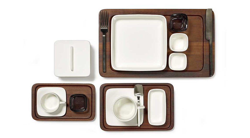 Большая любовь к японской кухне вдохновила голландского дизайнера Марселя Вольтеринка на создание коллекции столовой посуды Heii. Шесть квадратных фарфоровых тарелок разных размеров, от 3 до 11 дюймов, идеально сочетаются друг с другом. В комплект также входят три миски. Размеры коллекции позволяют подавать их к любому блюду, от закусок до десерта. Более компактные варианты также легко помещаются на деревянный поднос Heii.