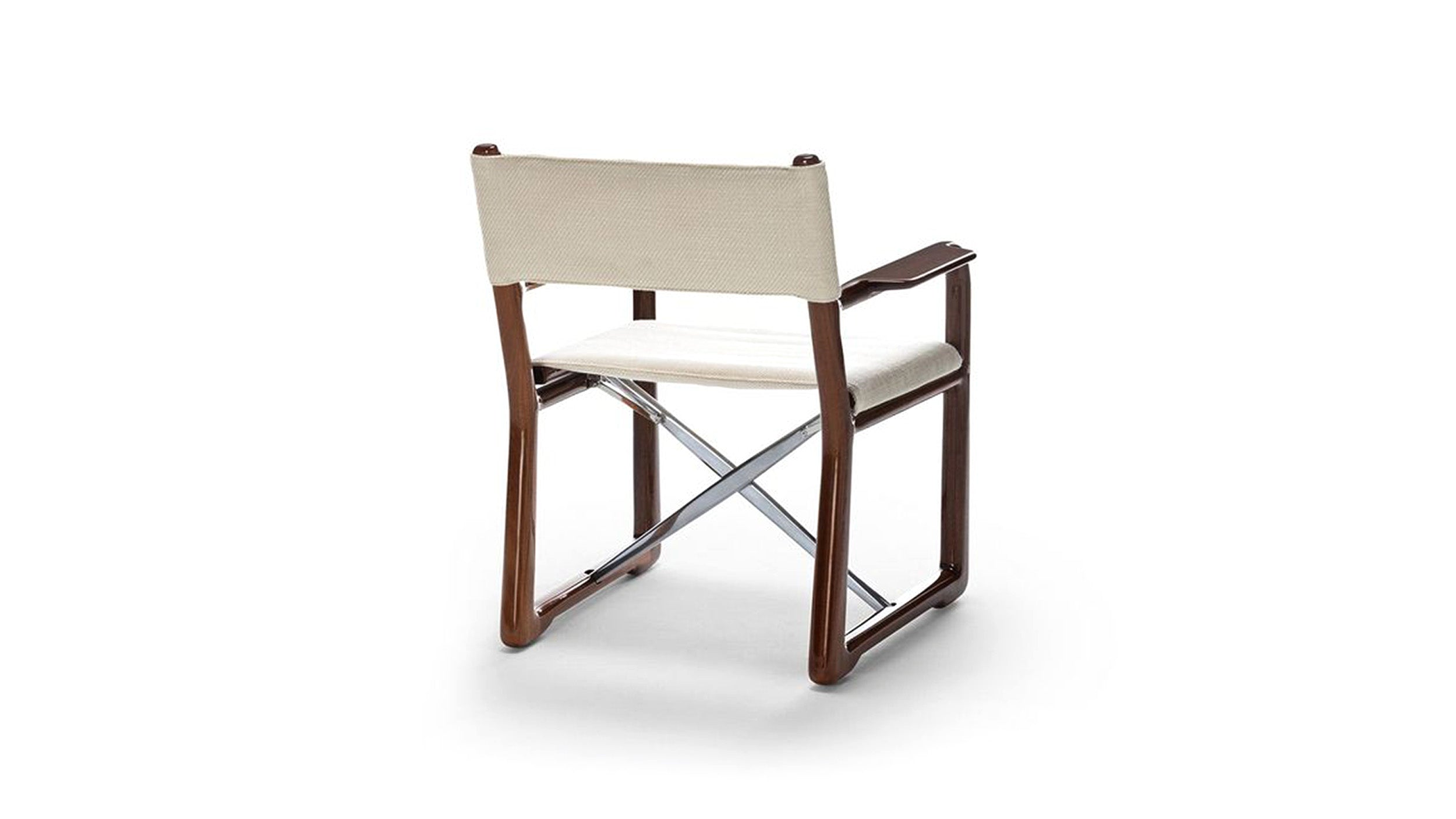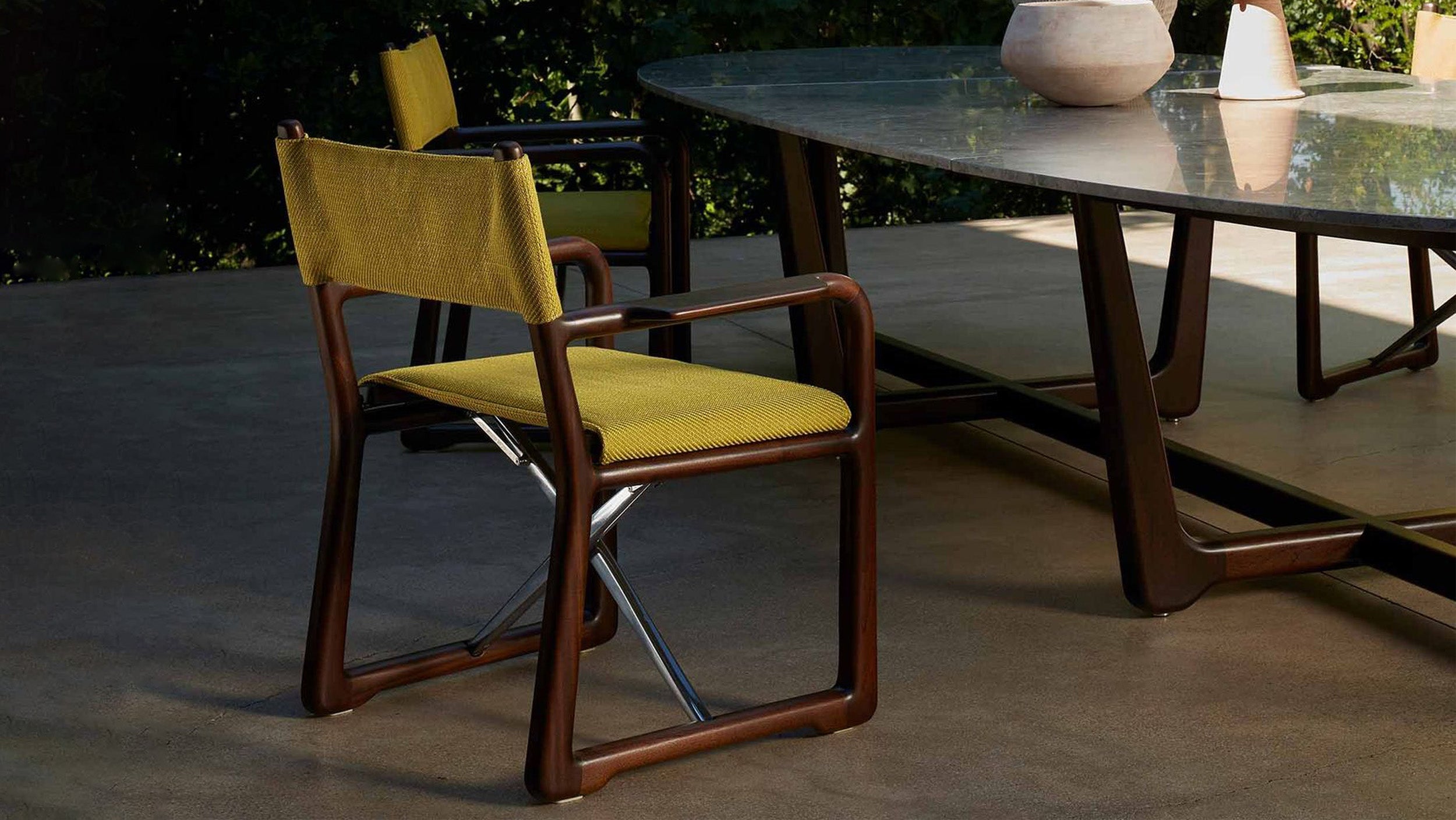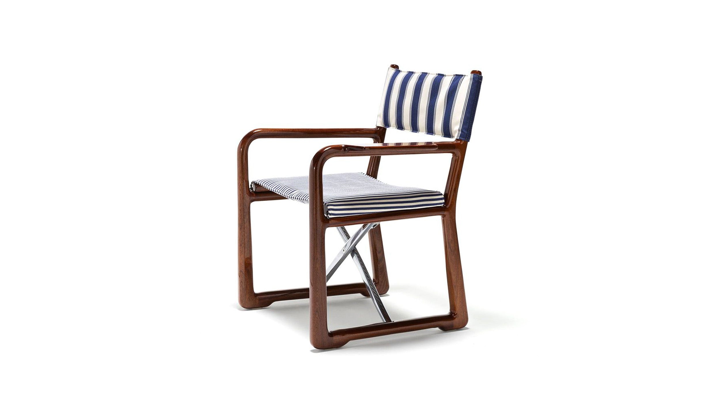 The LPIDC01 Folding Director's Chair, designed by Paola Navone for Exteta with Loro Piana Interiors, reimagines a timeless icon of leisure. Its foldable mahogany frame and Loro Piana fabrics make it as practical as it is refined, perfect for terraces, yachts, or garden settings. This chair travels lightly yet carries a weight of sophistication.