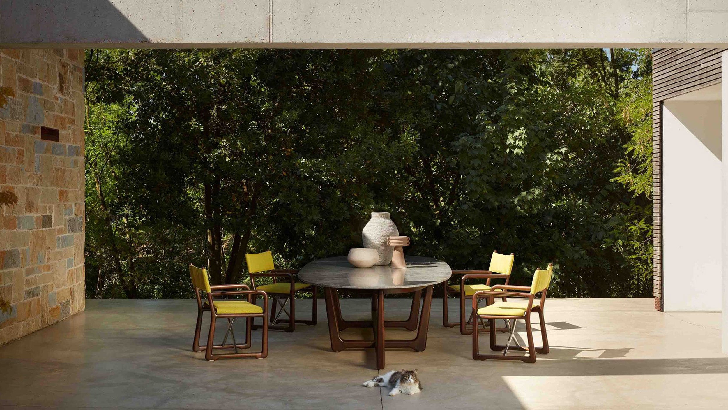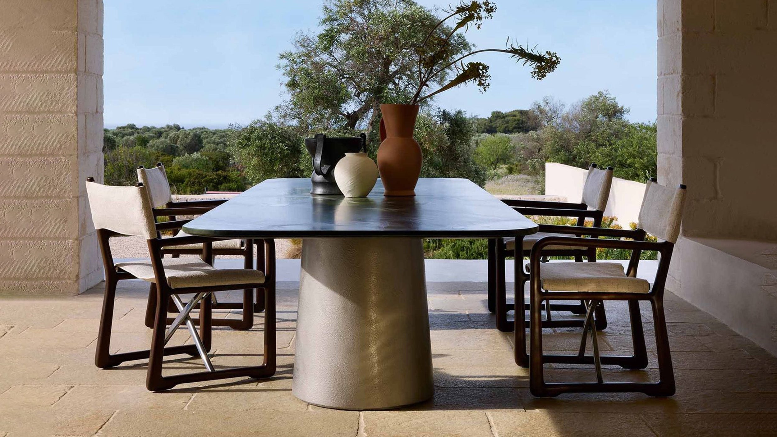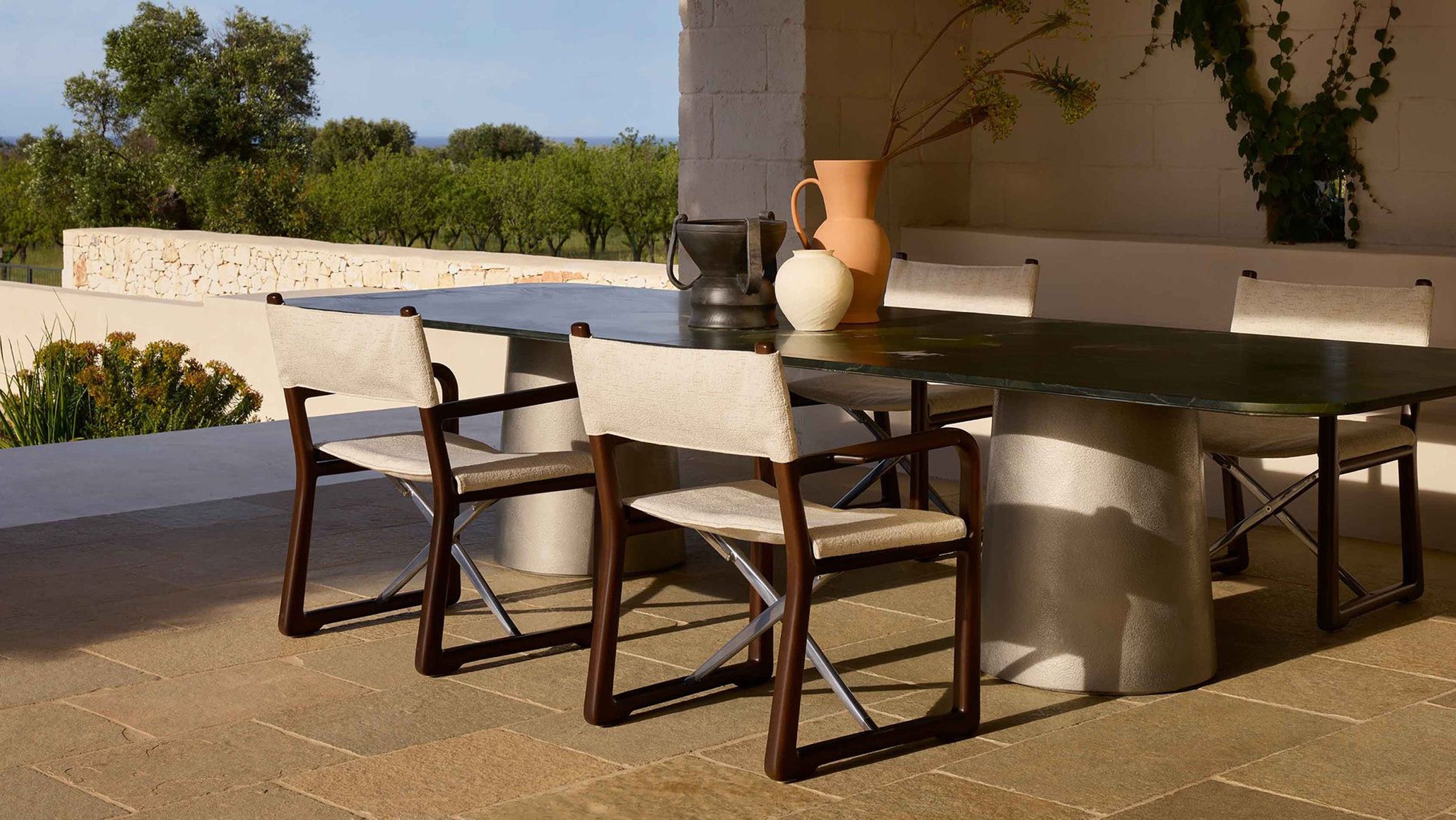 The LPIDC01 Folding Director's Chair, designed by Paola Navone for Exteta with Loro Piana Interiors, reimagines a timeless icon of leisure. Its foldable mahogany frame and Loro Piana fabrics make it as practical as it is refined, perfect for terraces, yachts, or garden settings. This chair travels lightly yet carries a weight of sophistication.